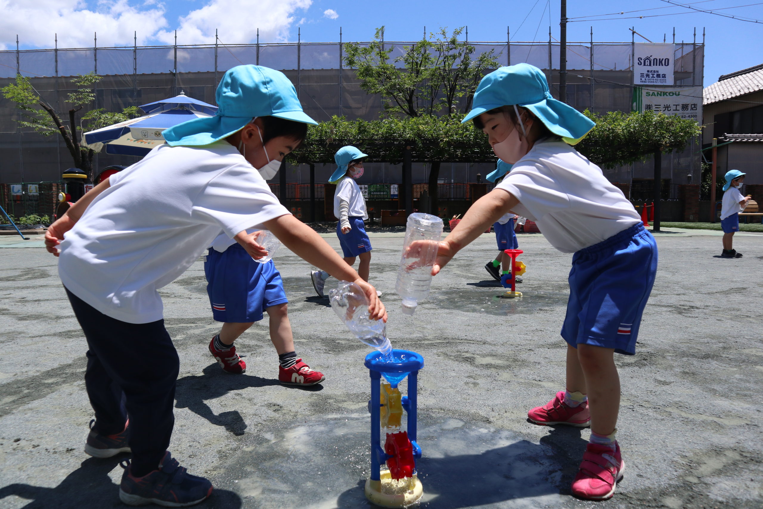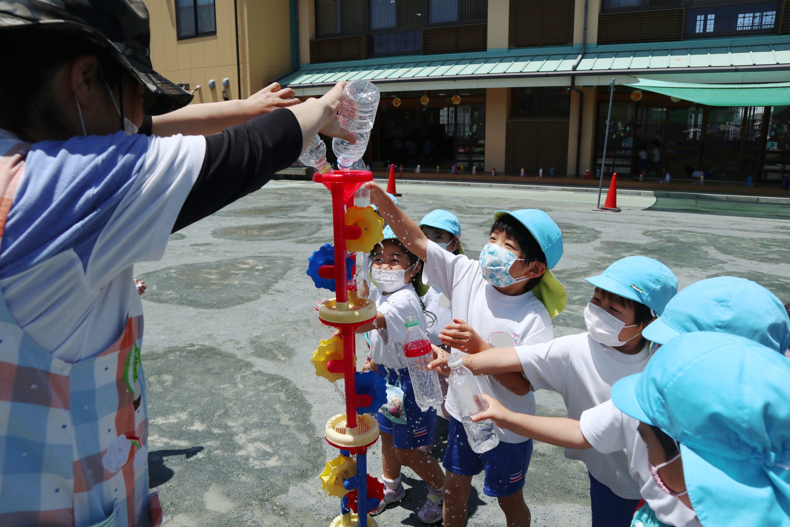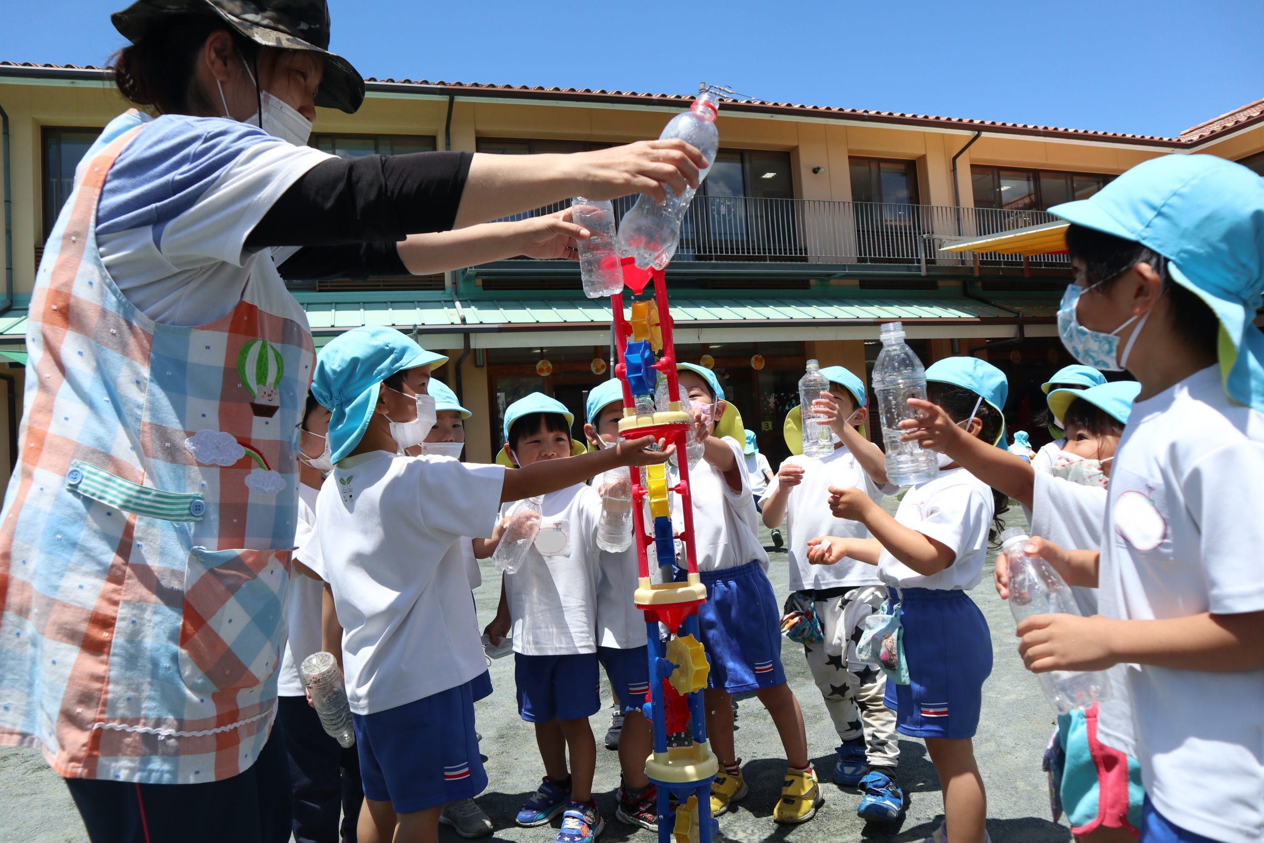 2つから3つ、4つとのせたよ。届かないからあきこ先生、お水入れて!と水の入ったペットボトルをパスしていきました。空になったペットボトルを受け取ると、くるくる回って落ちてきたお水を一生懸命受け取ろうとしている友達もいましたよ。