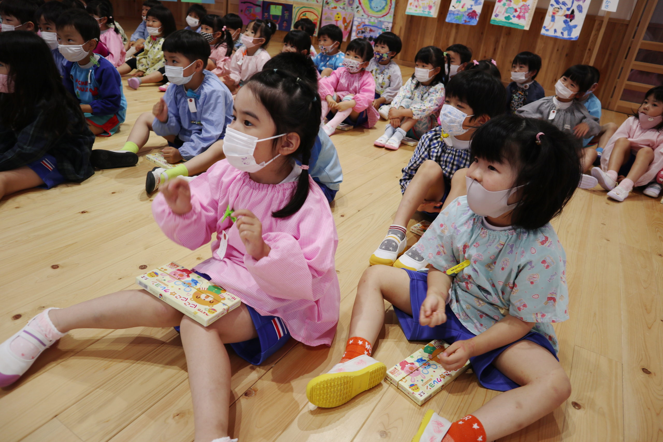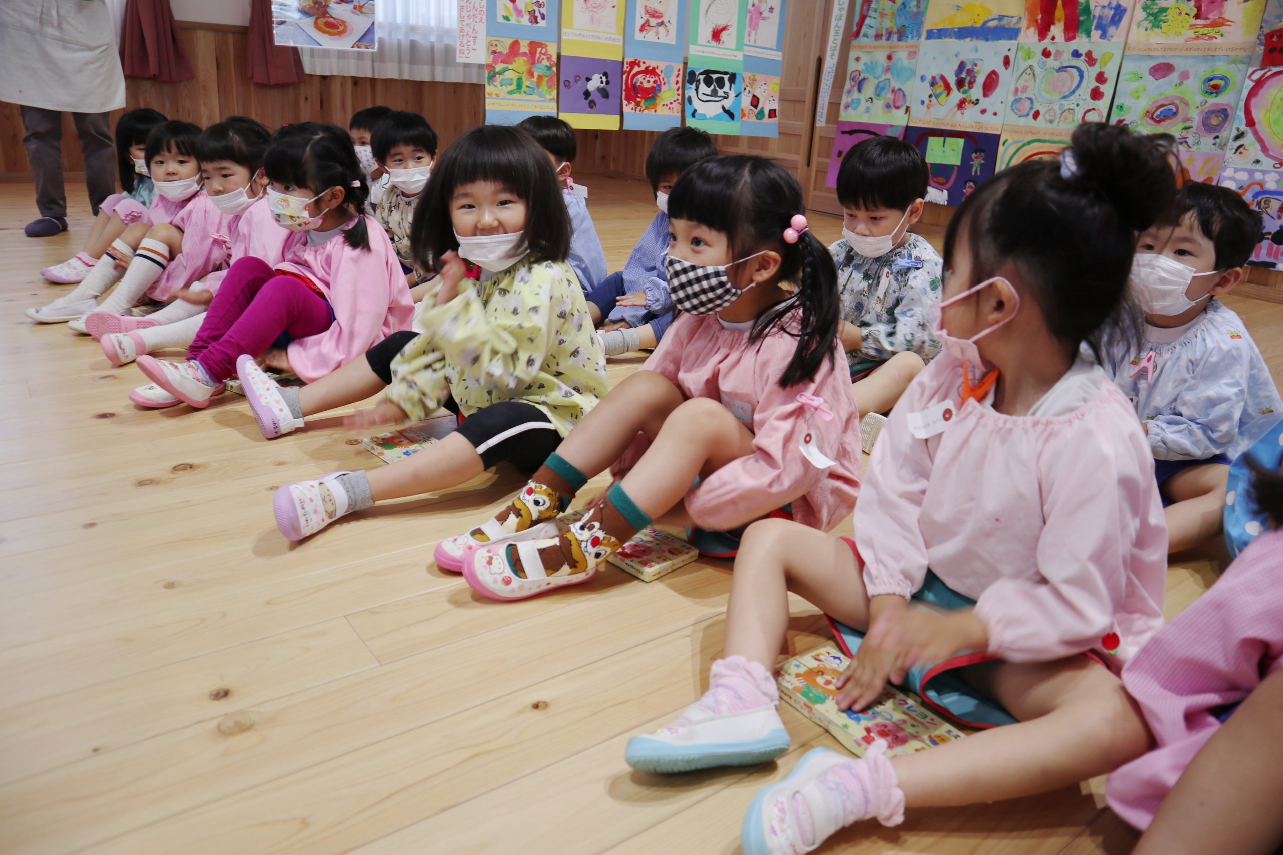 おさとう先生がお話を聞かせてくれました。「森の道の真ん中に丸くて四角い虹色のキラキラ光った落し物がありました。近くに落ちていた枝で叩いてみると・・・」おさとう先生のお話を聞きながら、枝を持ってたいこを叩いているおともだちがいましたよ。どんな音が聞こえてくるかな?誰が叩いているのかな?