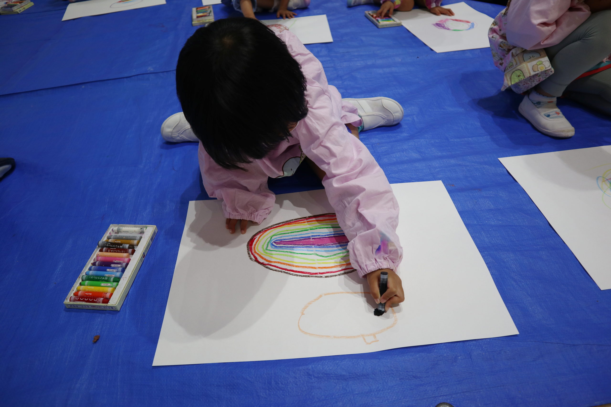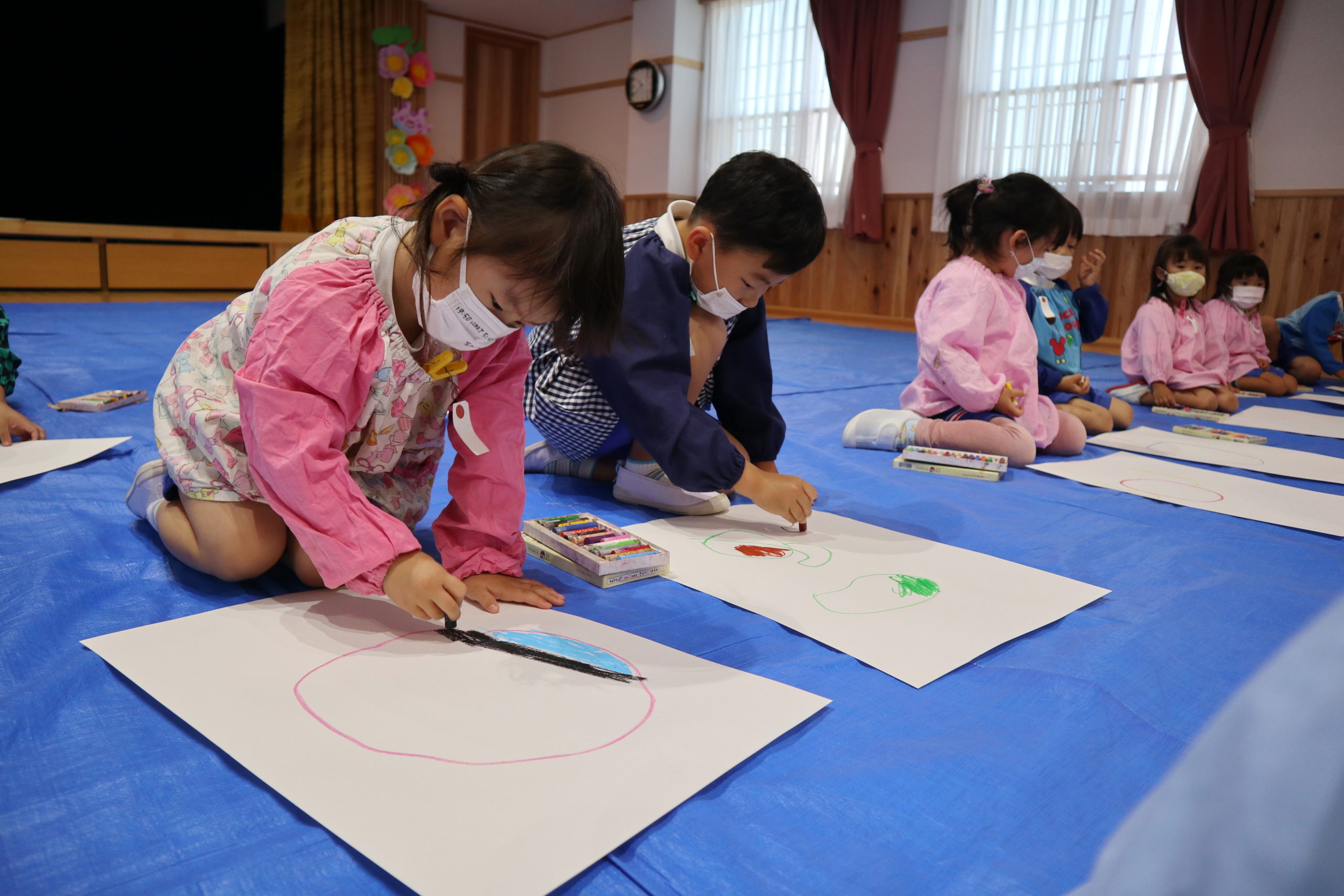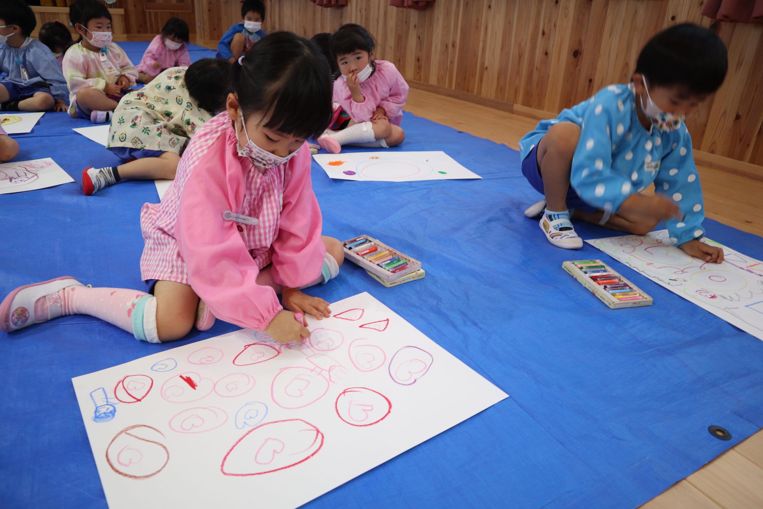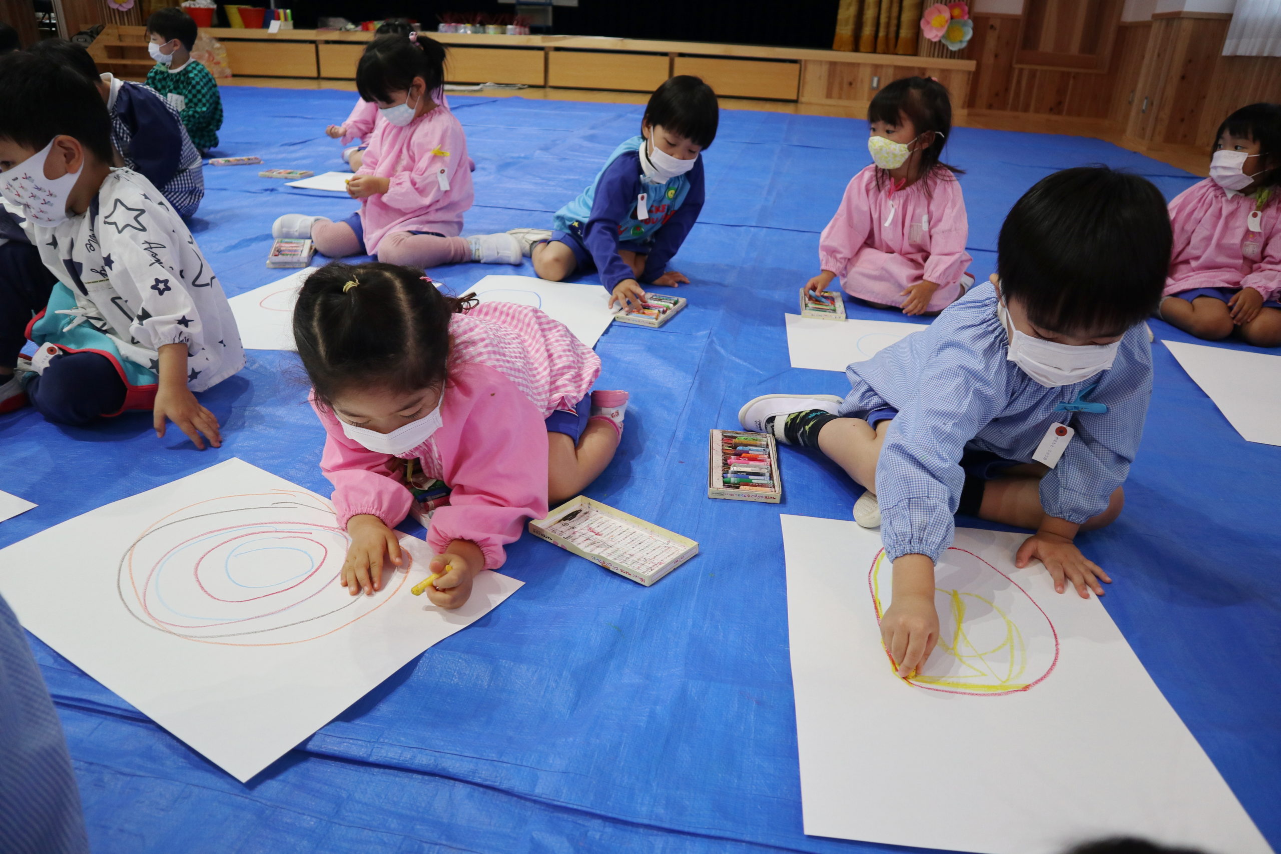みんなの頭にたいこのイメージが湧いてきたかな?みんなが頭で描いたイメージをクレヨンを持って実際に描いていきました。