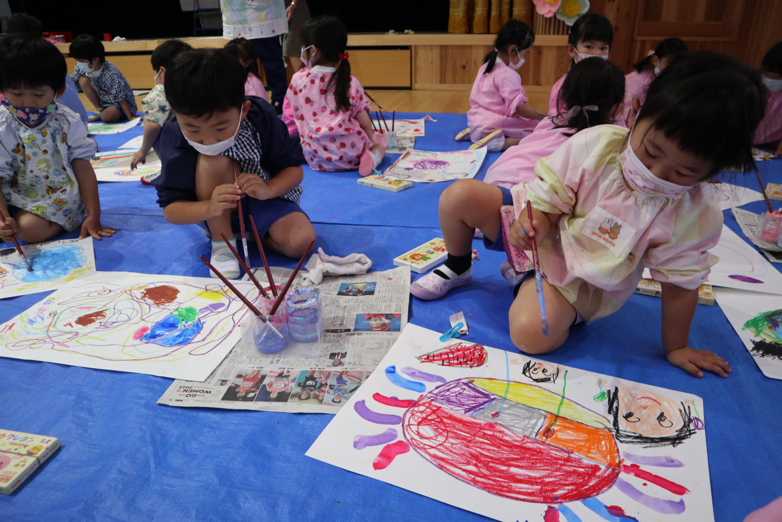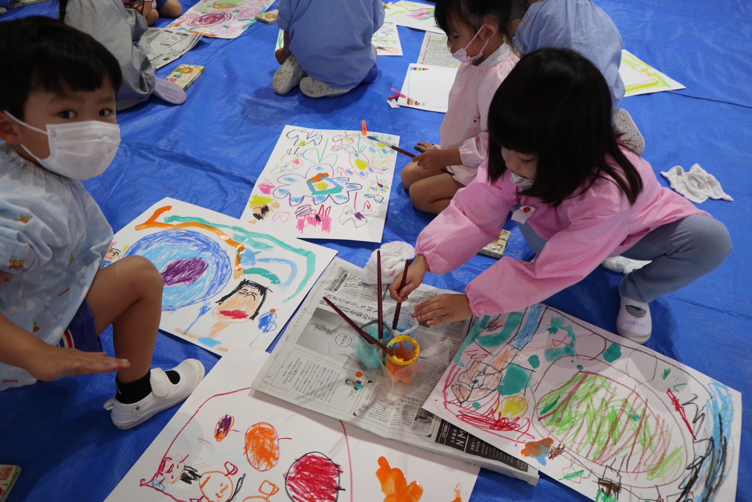 年長組さんの鼓笛演奏みたいに「タンタンタン」とリズムよく口ずさむ子もいました。音に合わせて筆をトントンと点で描いたり、なみなみにしたり筆を動かすスピードを変えて勢いよくびゅーんと描いたり。自分たちで考え工夫して取り組む姿がありました。