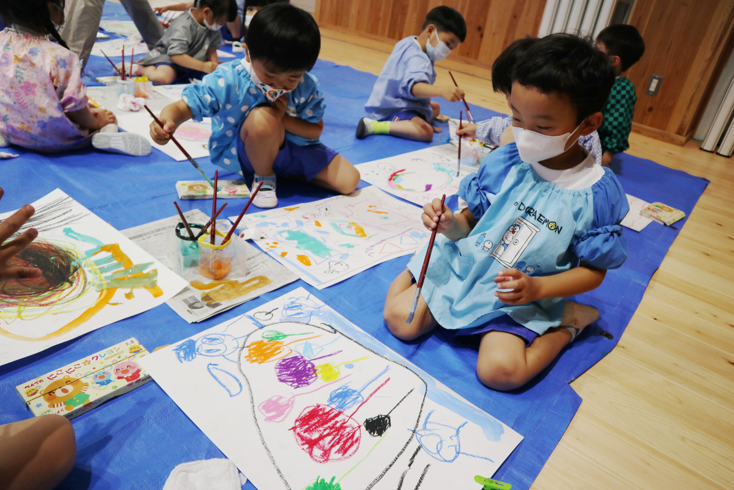 ぼくわたしのマイブームが飛び出してきてどきどきわくわく🎵「ドーン」「ぽんぽこぽん」など口でたいこの音を出しながら素敵な音が広がっていく様子を絵の具で描いていきました。