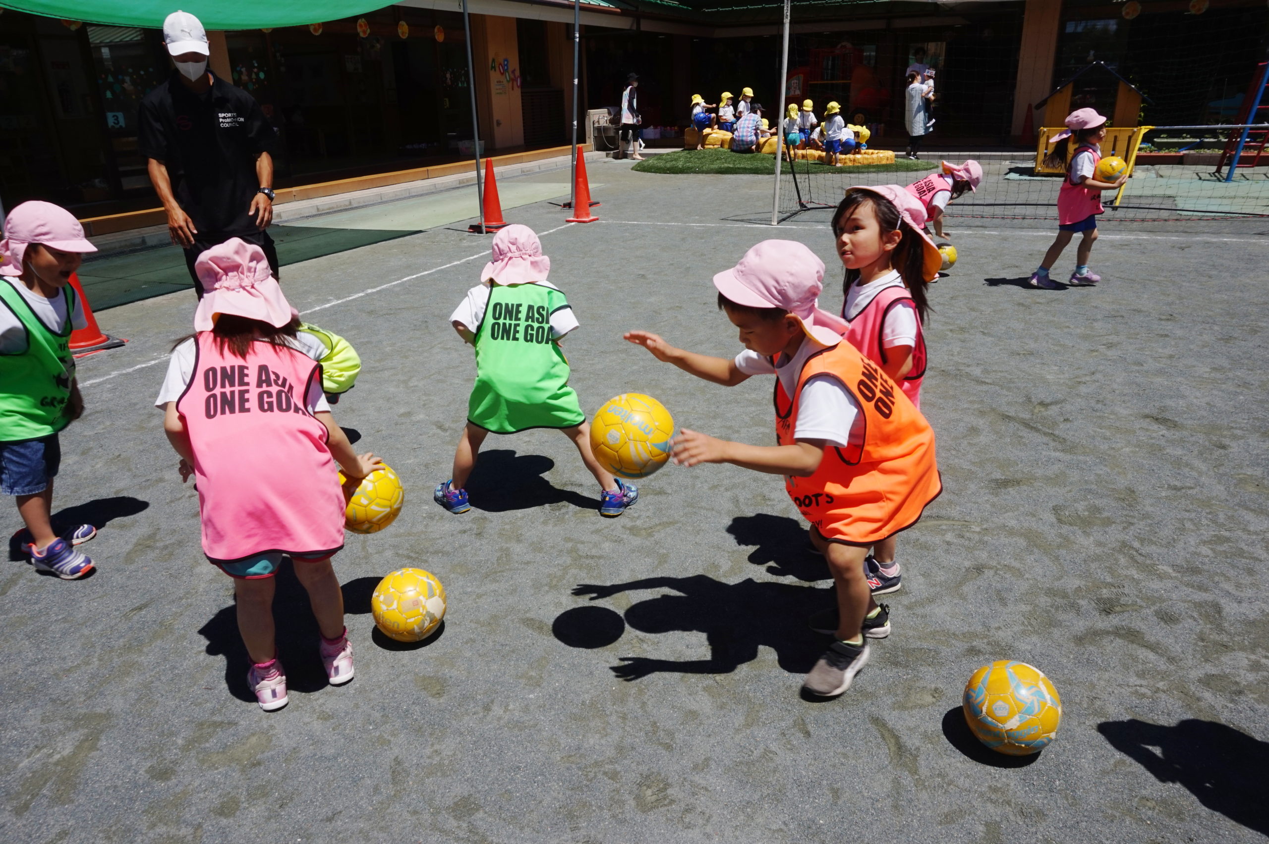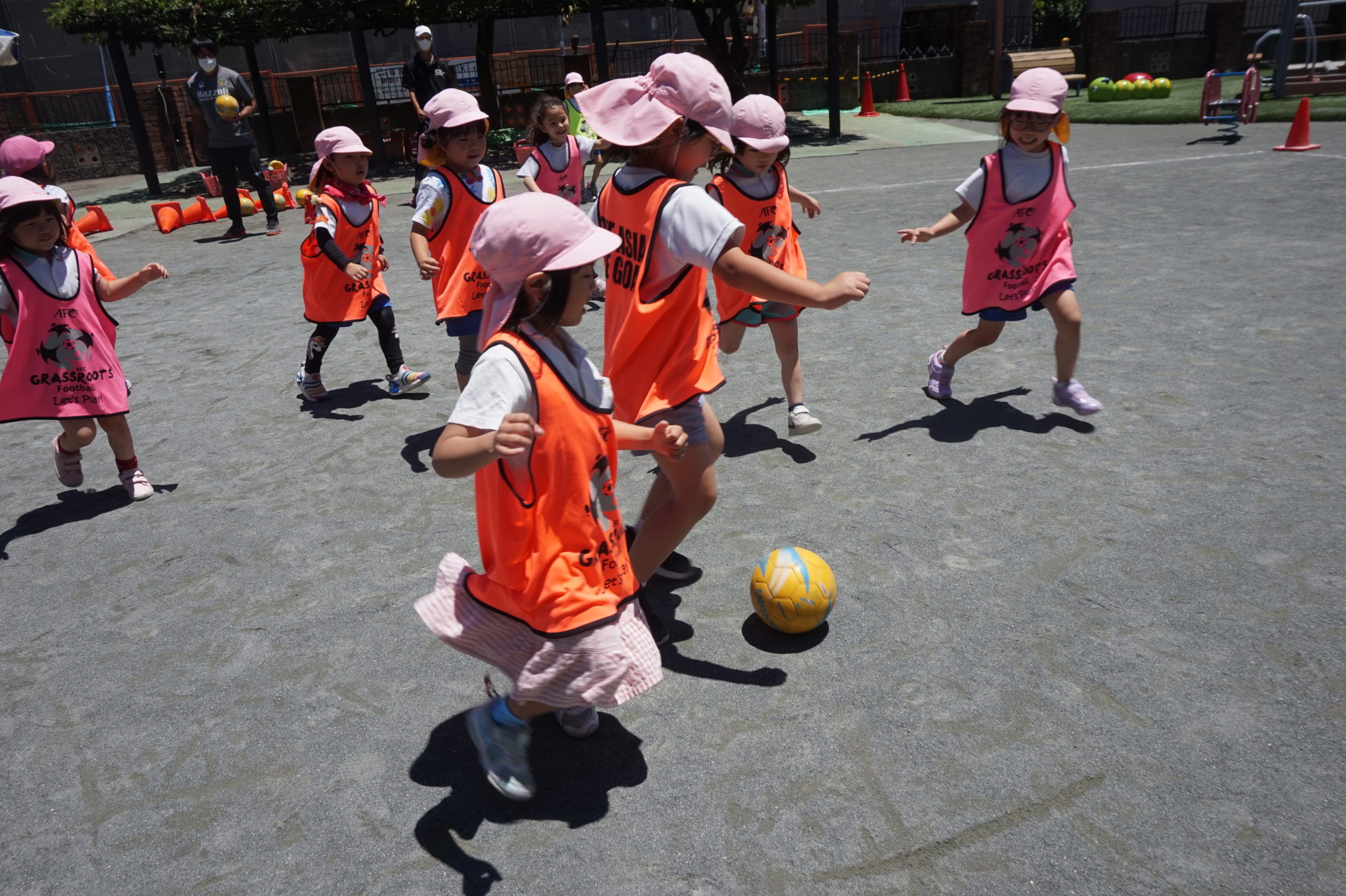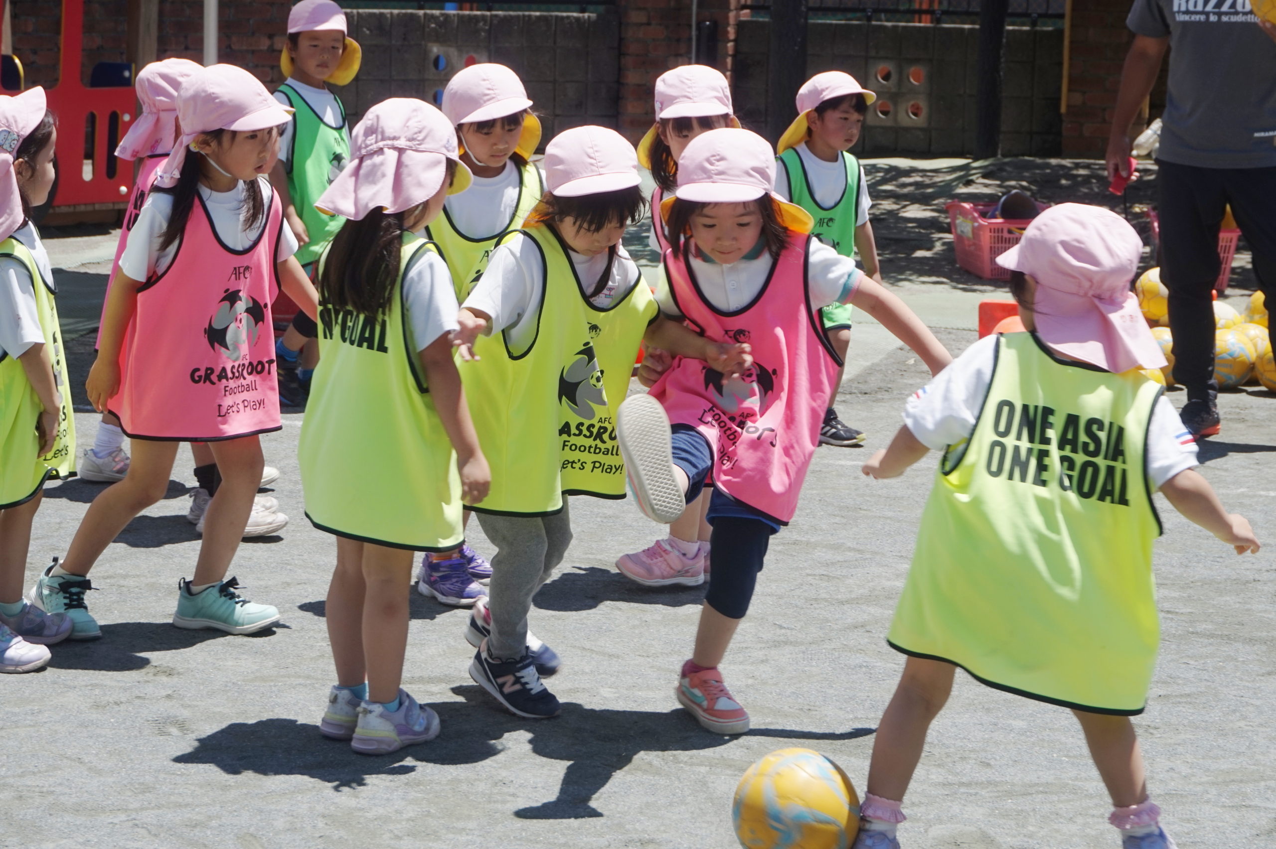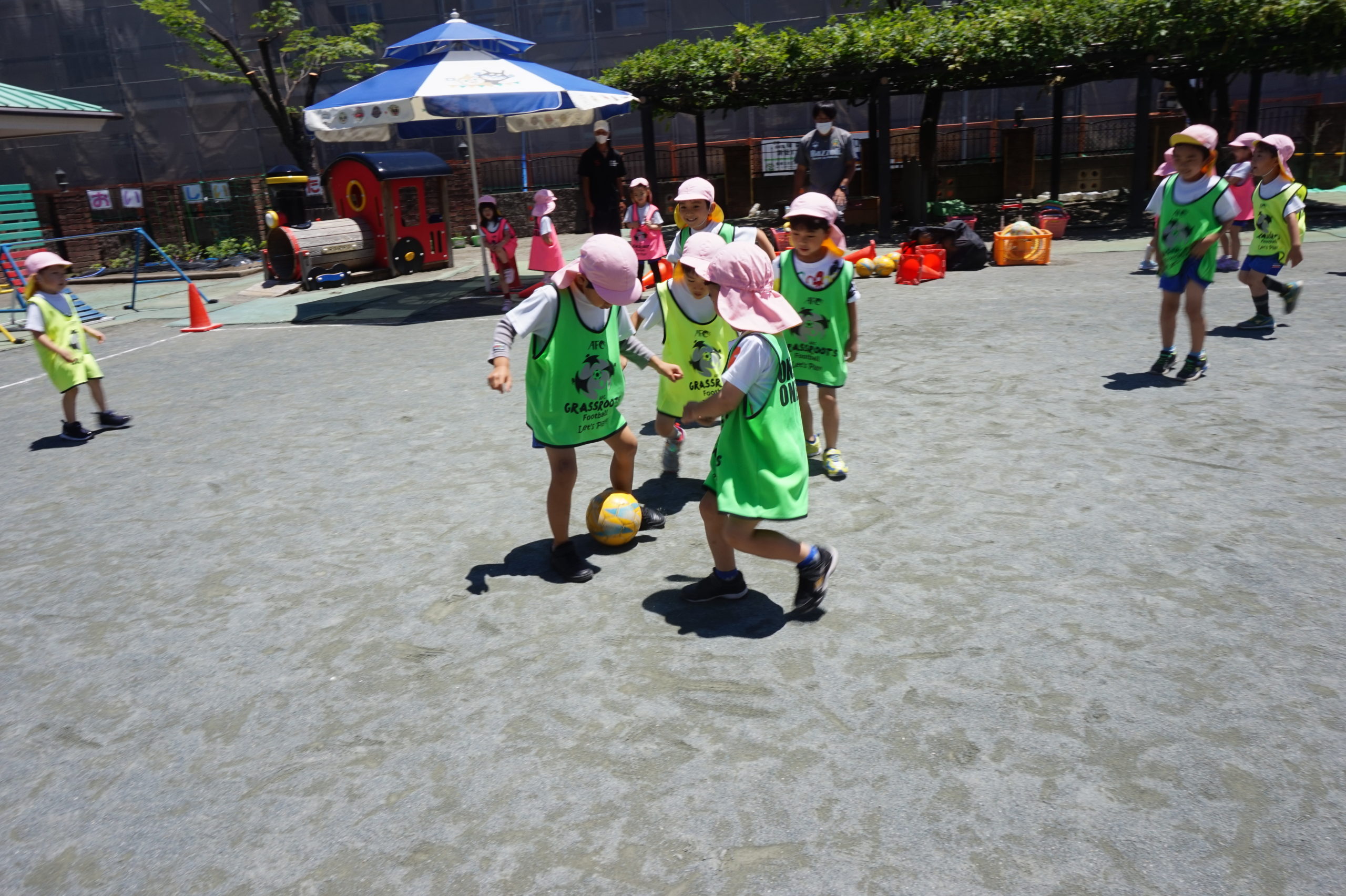 かっこいいビブスを着て、張り切ってサッカータイムに臨む年長組のこどもたち。