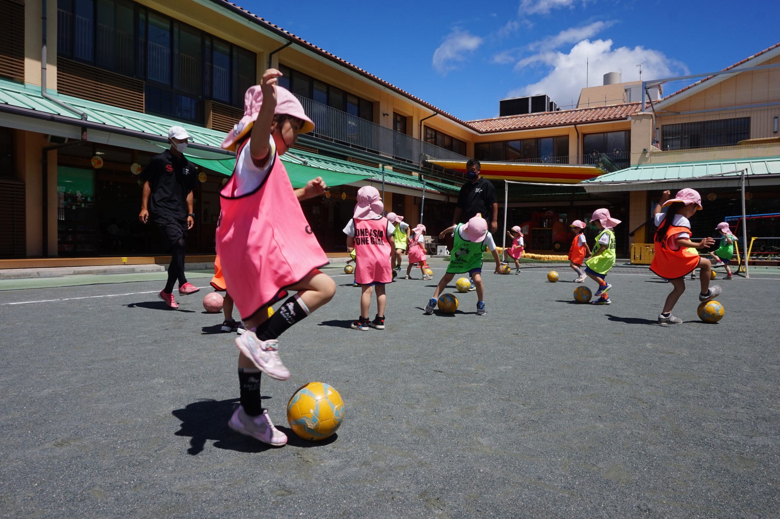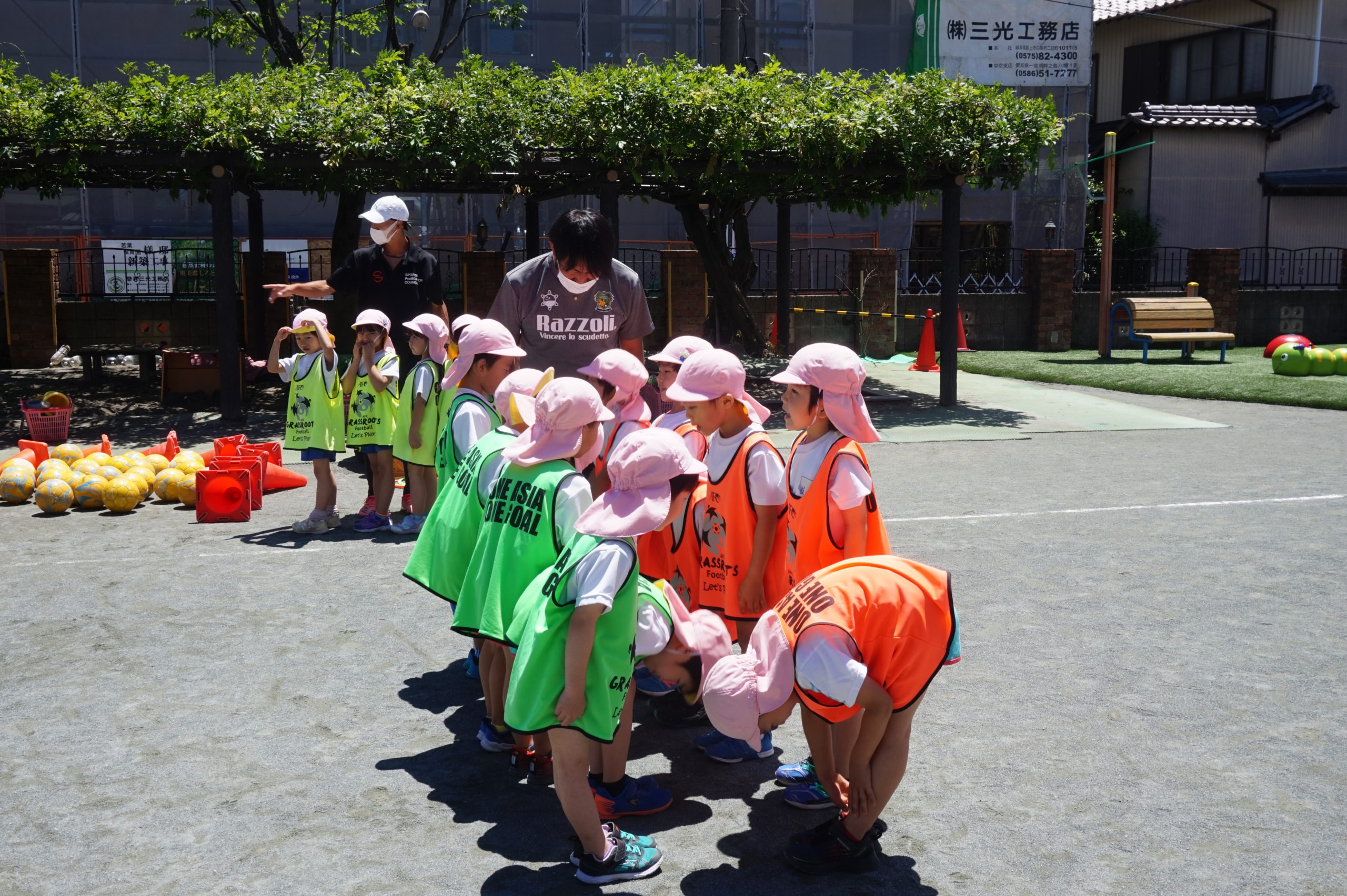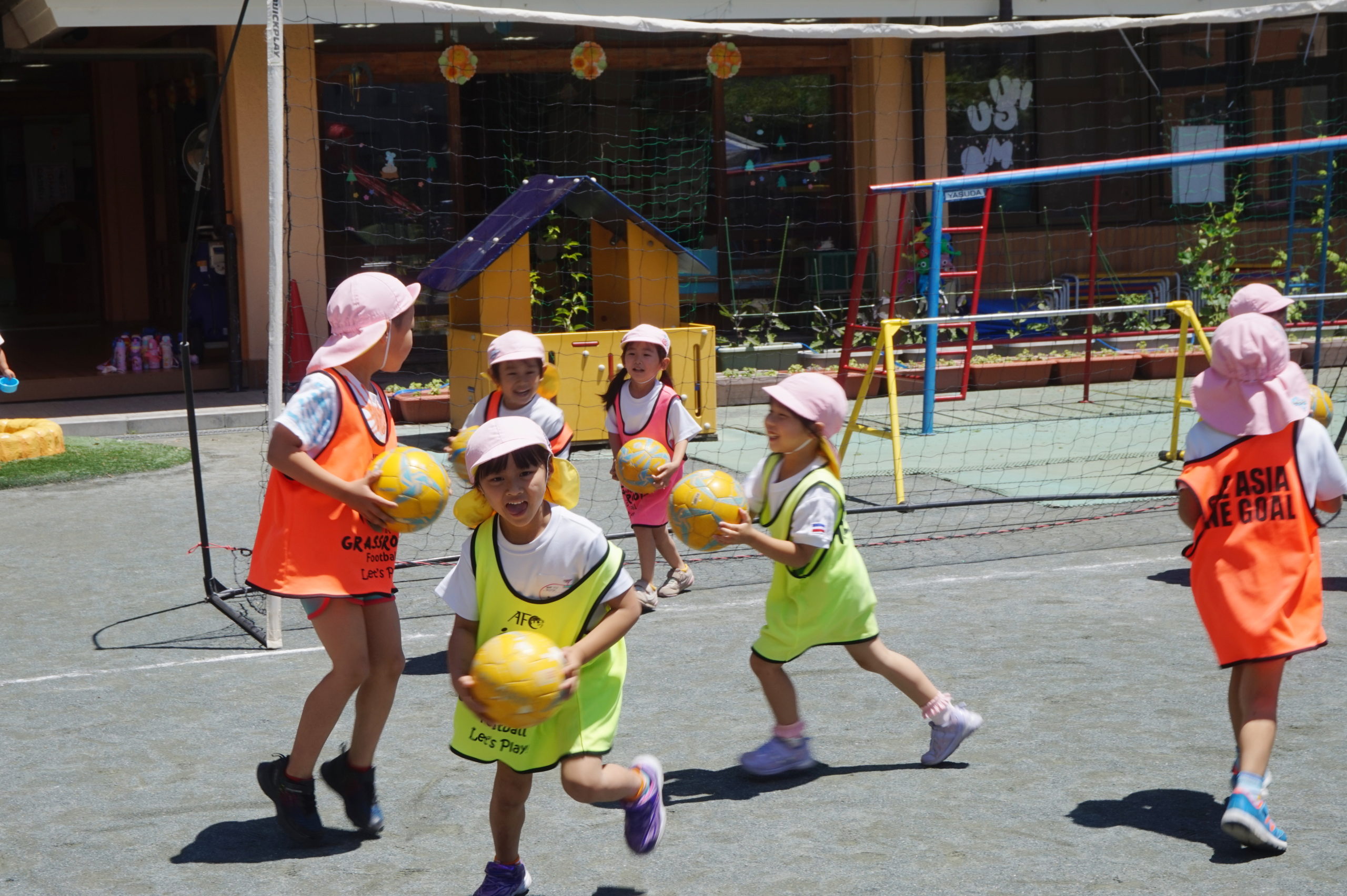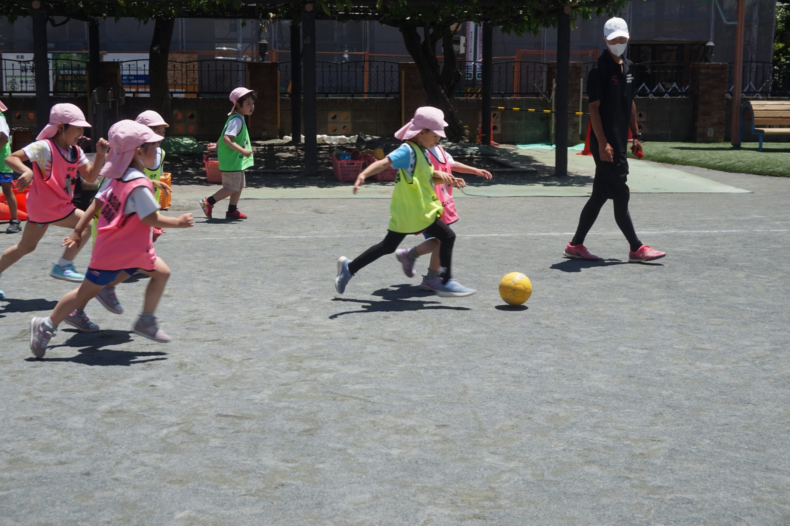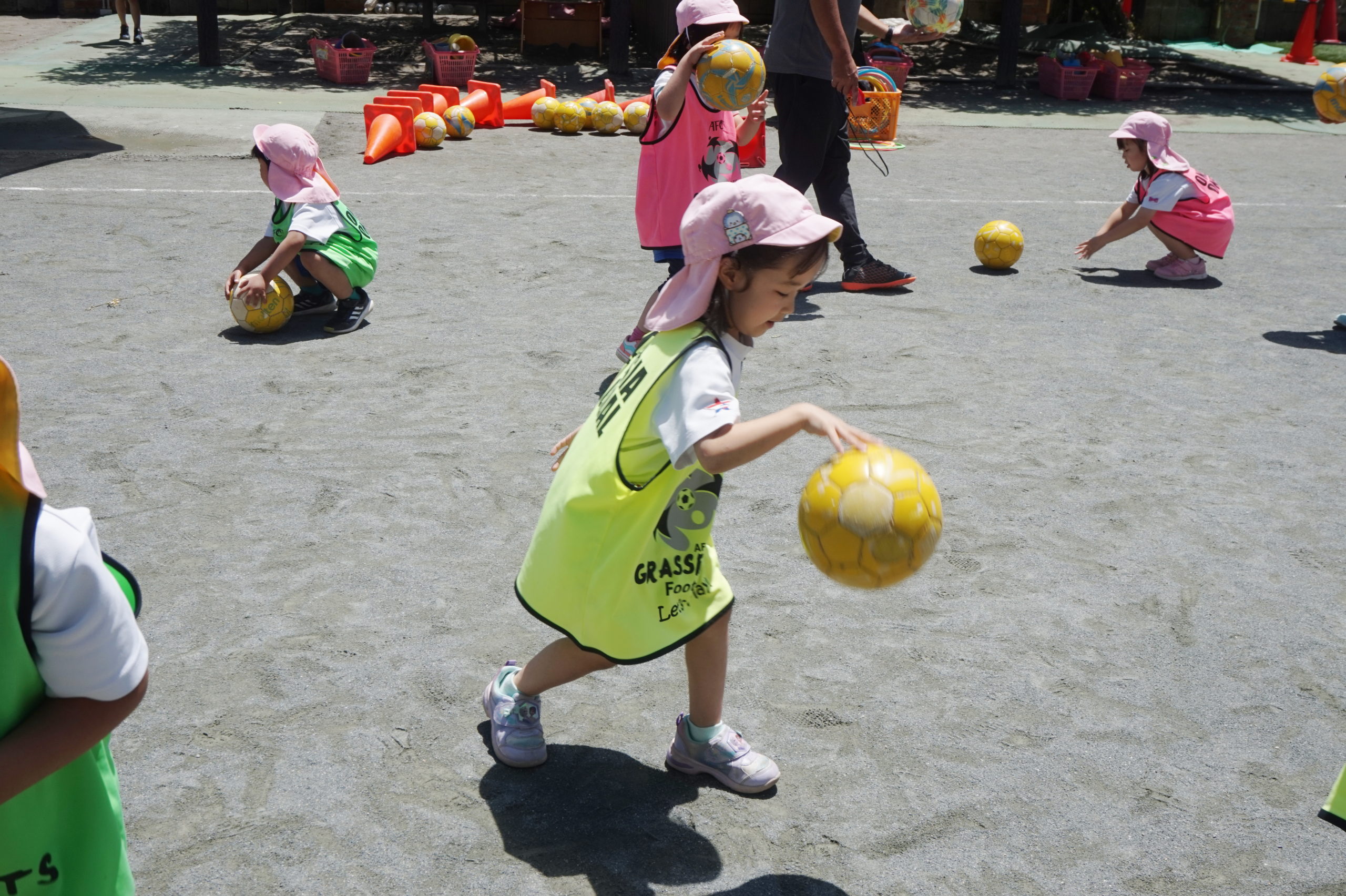 かっこいいビブスを着て、張り切ってサッカータイムに臨む年長組のこどもたち。