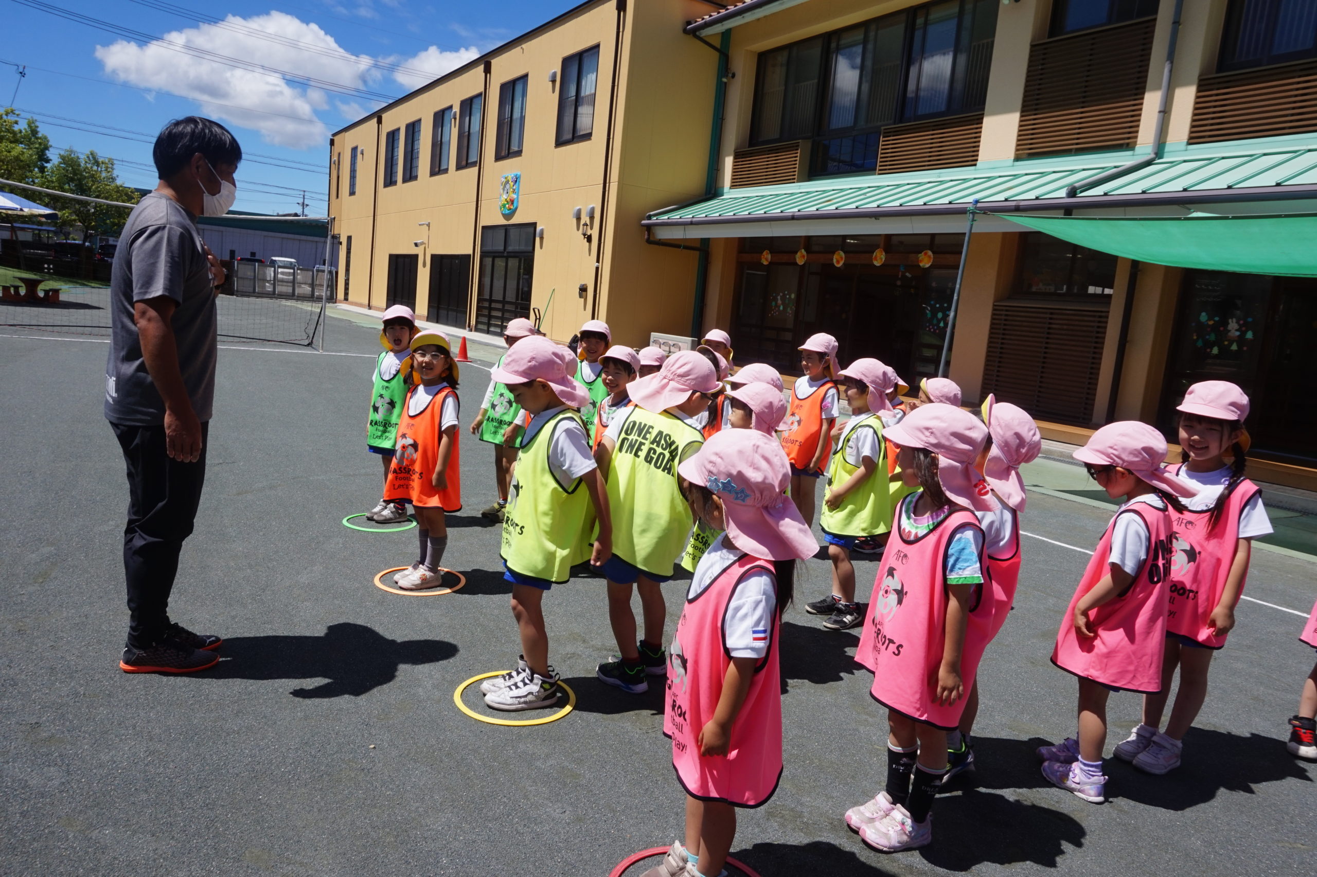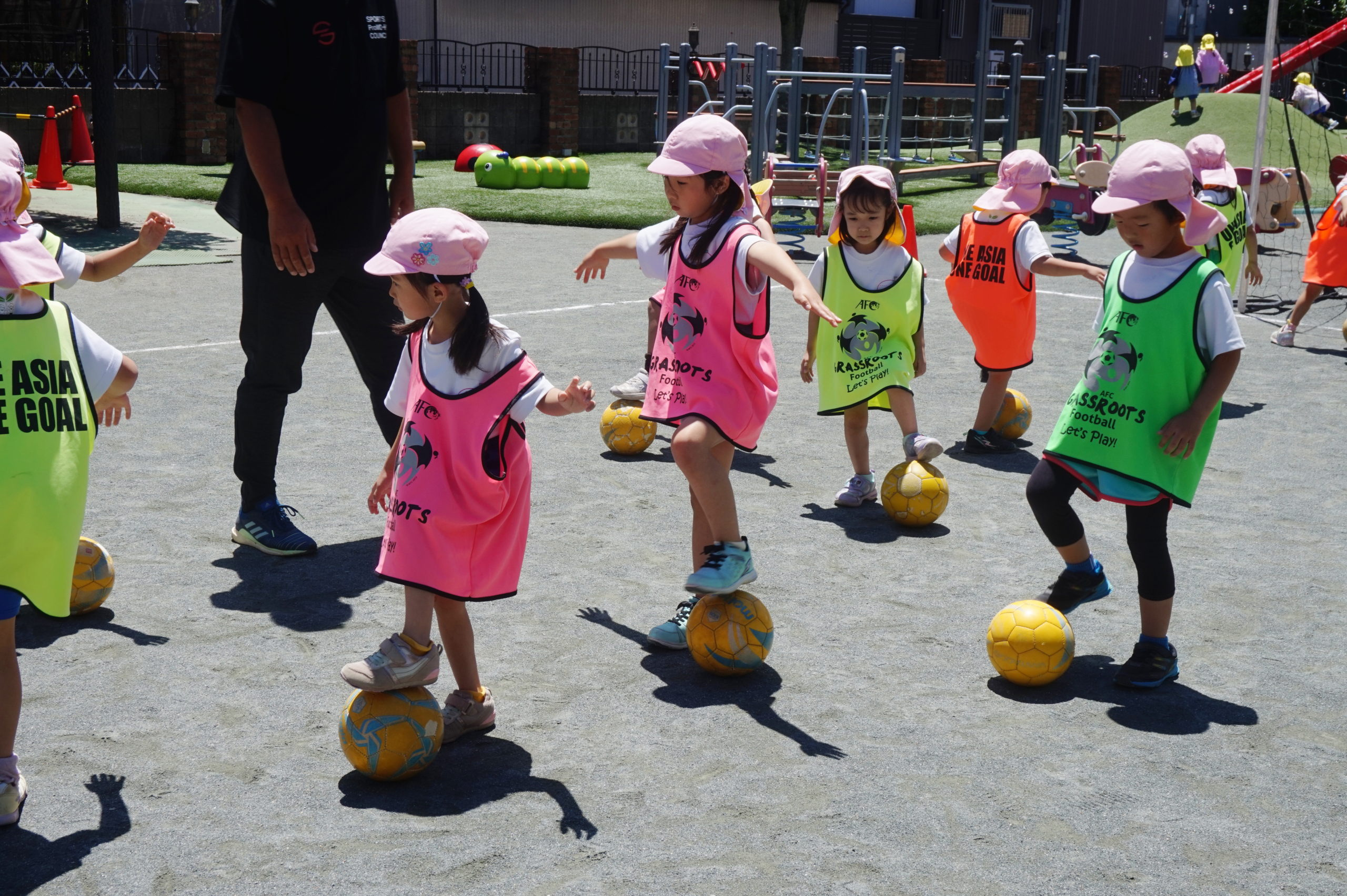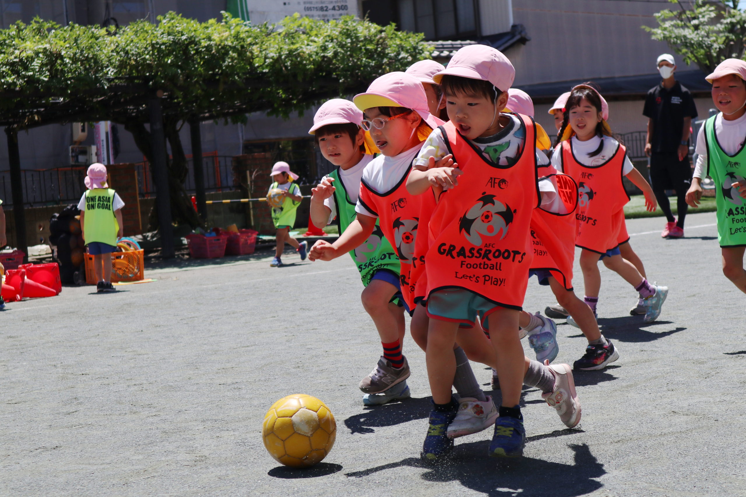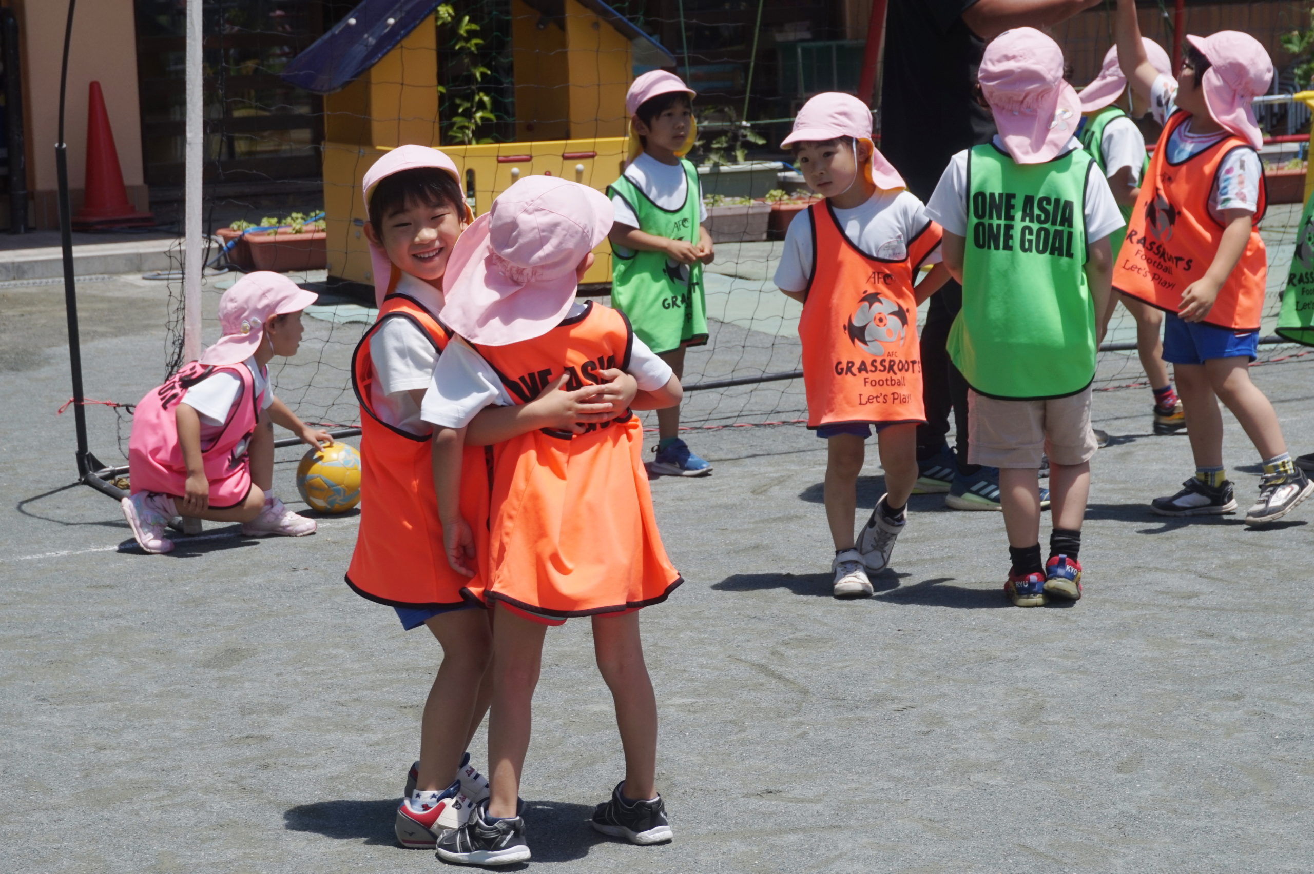 かっこいいビブスを着て、張り切ってサッカータイムに臨む年長組のこどもたち。
