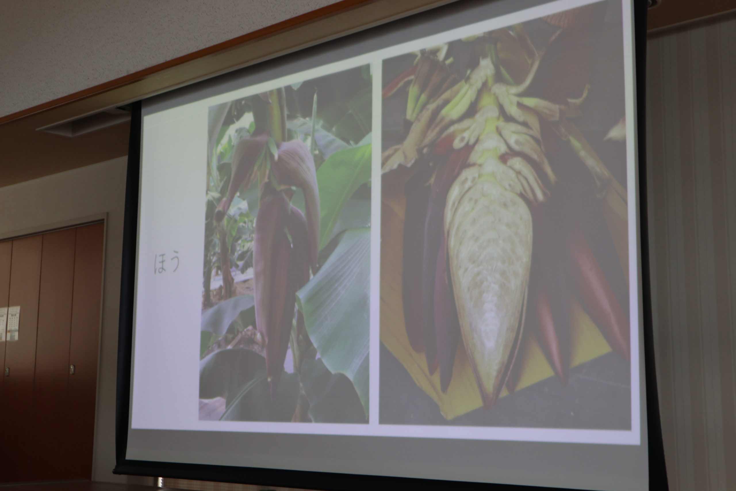 「この赤いのが“ほう”っていうんだよ。」「ほーう」とダジャレを言って笑わせてくれる子もいました。「バナナの下のところについているんだよ。黄色いお花の上のところにはバナナの赤ちゃんがついているね。」