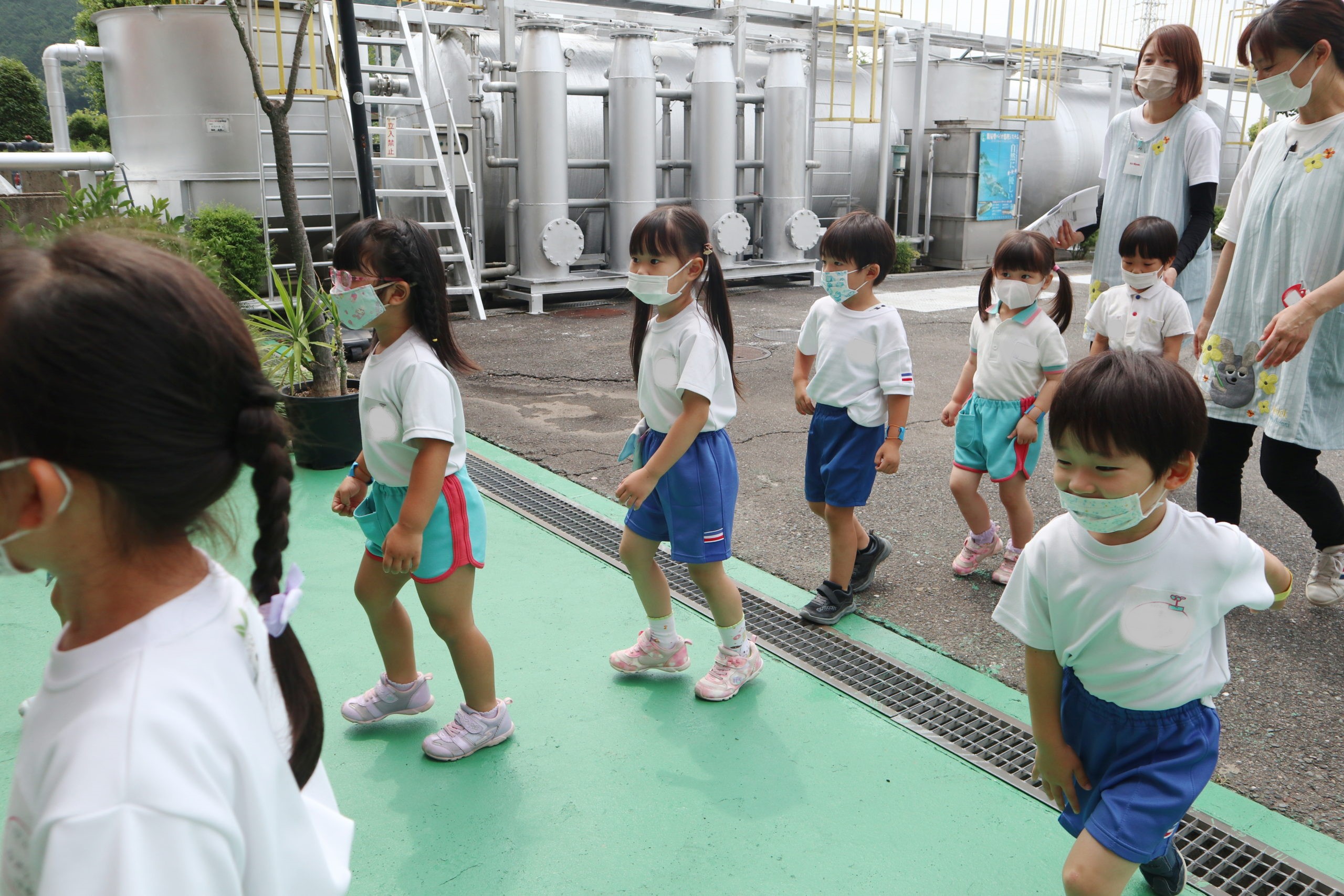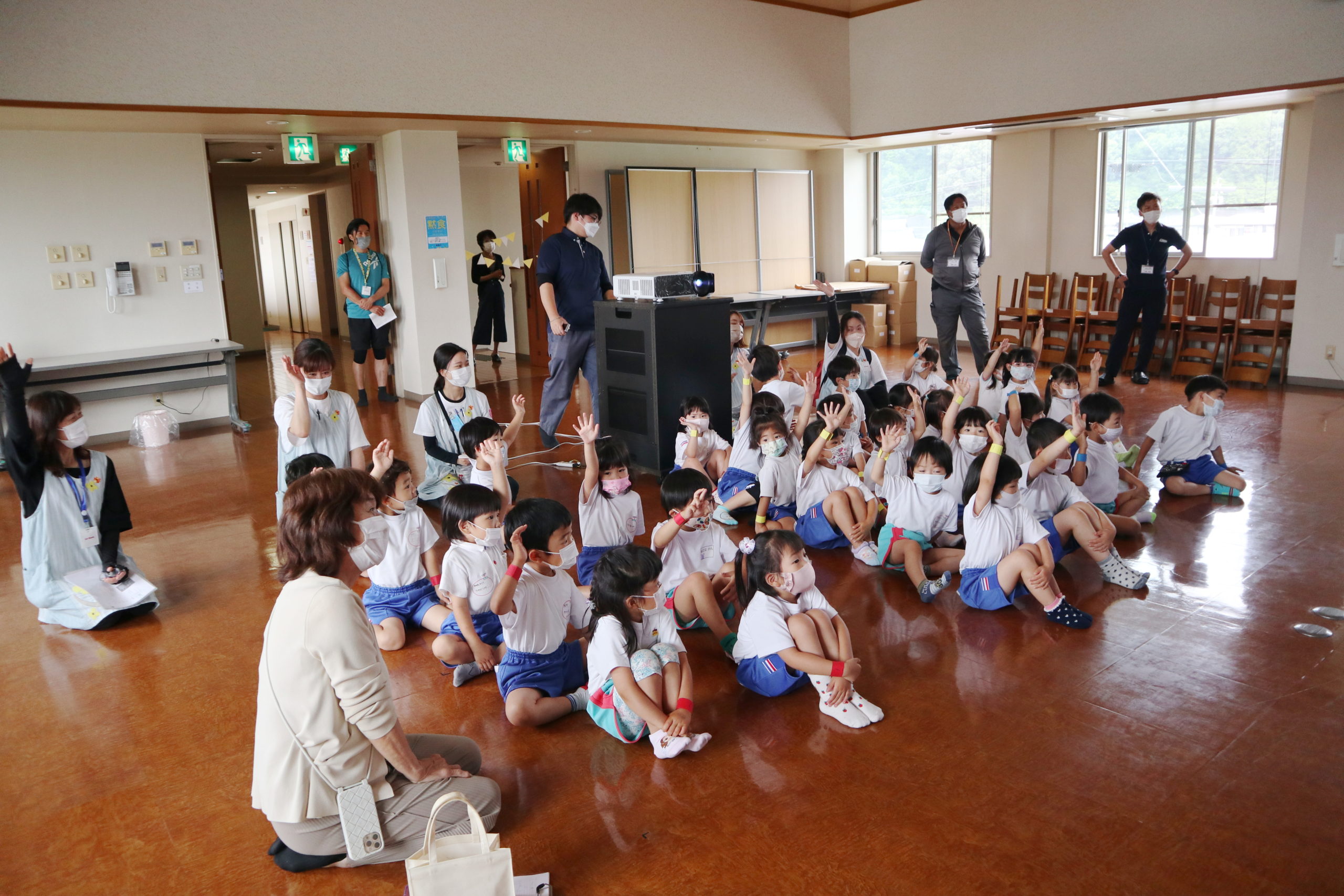 ホールに入ると笑顔の素敵なおねえさんと、ようこそ!と我が園のシンボルマークが入ったスクリーンで歓迎していただきました。「わかばようちえんってかいてあるよ!」とこどもたちもテンションが上がります。