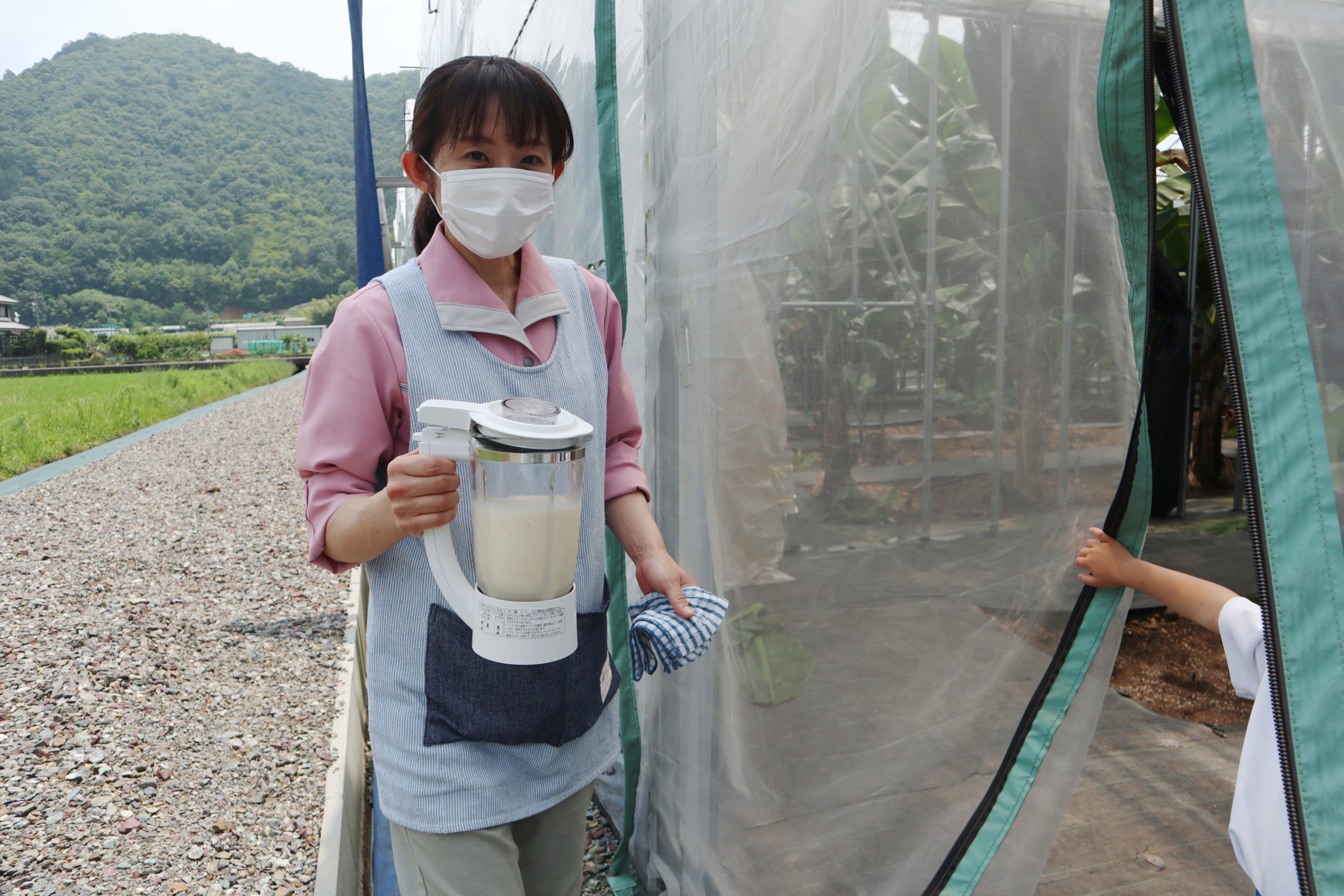 「おいしいよ!」30度の暑い温室でいただく冷たーいバナナジュース最高でした!