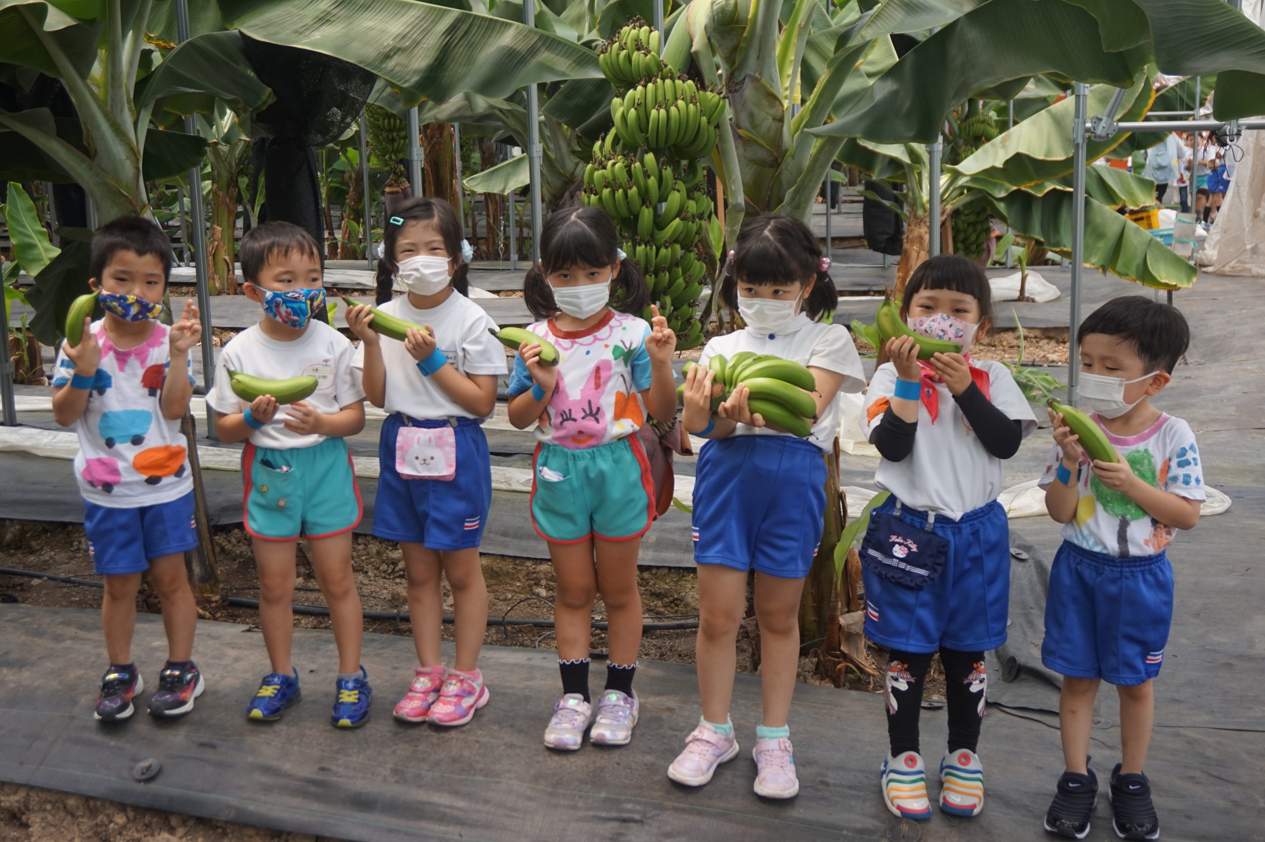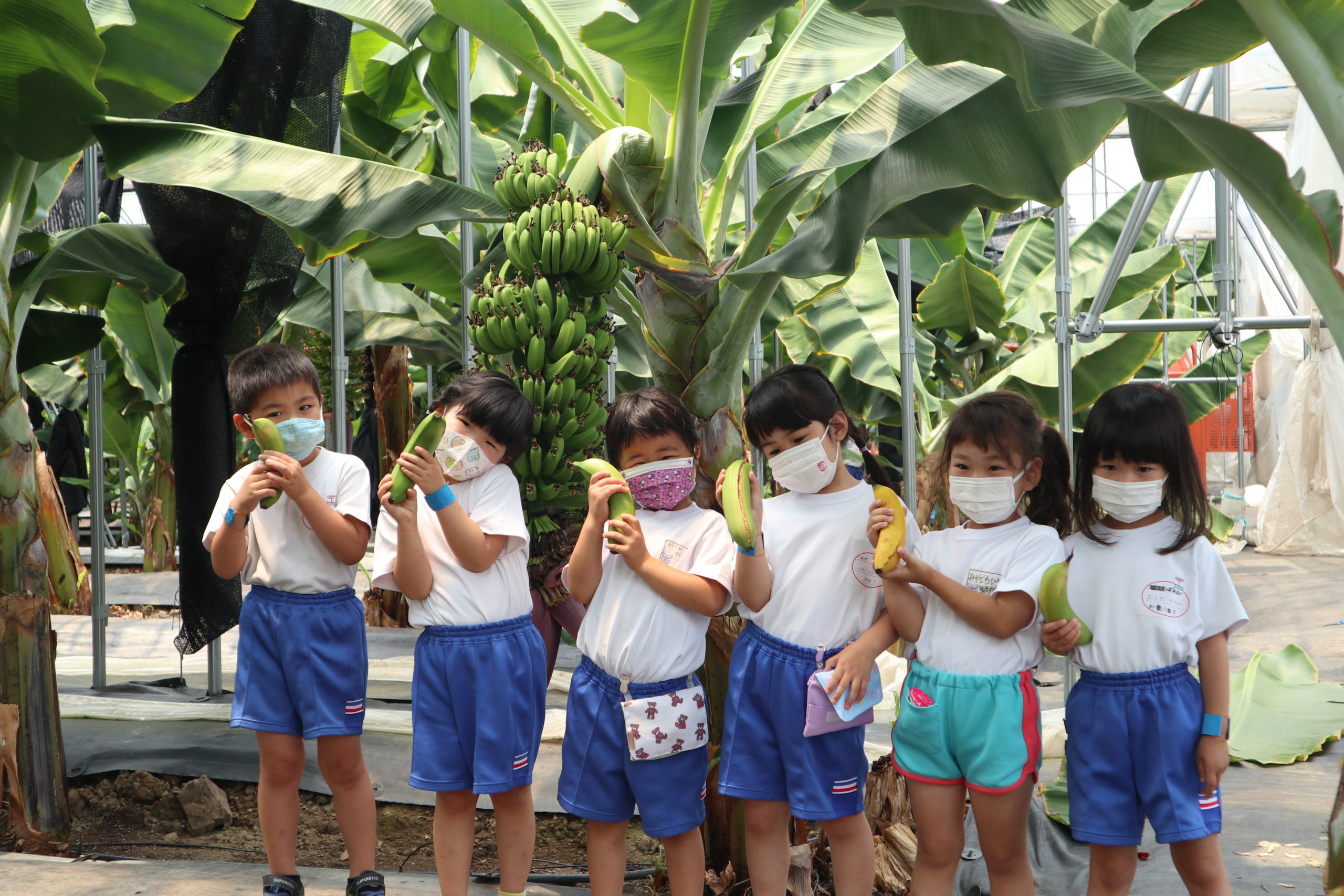 「私このバナナがいい!」「ここのバナナ大きいね。」「いつも食べているバナナより太くてずっしりしてる。」落とさないようそうっと大事に持って記念撮影をしました。
