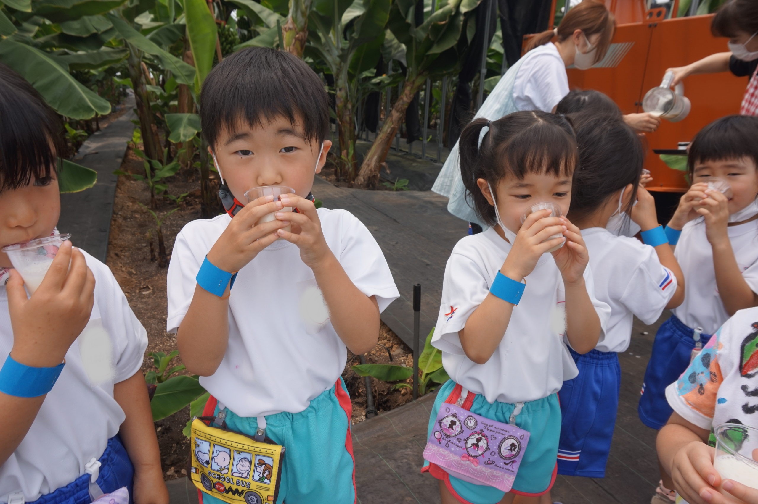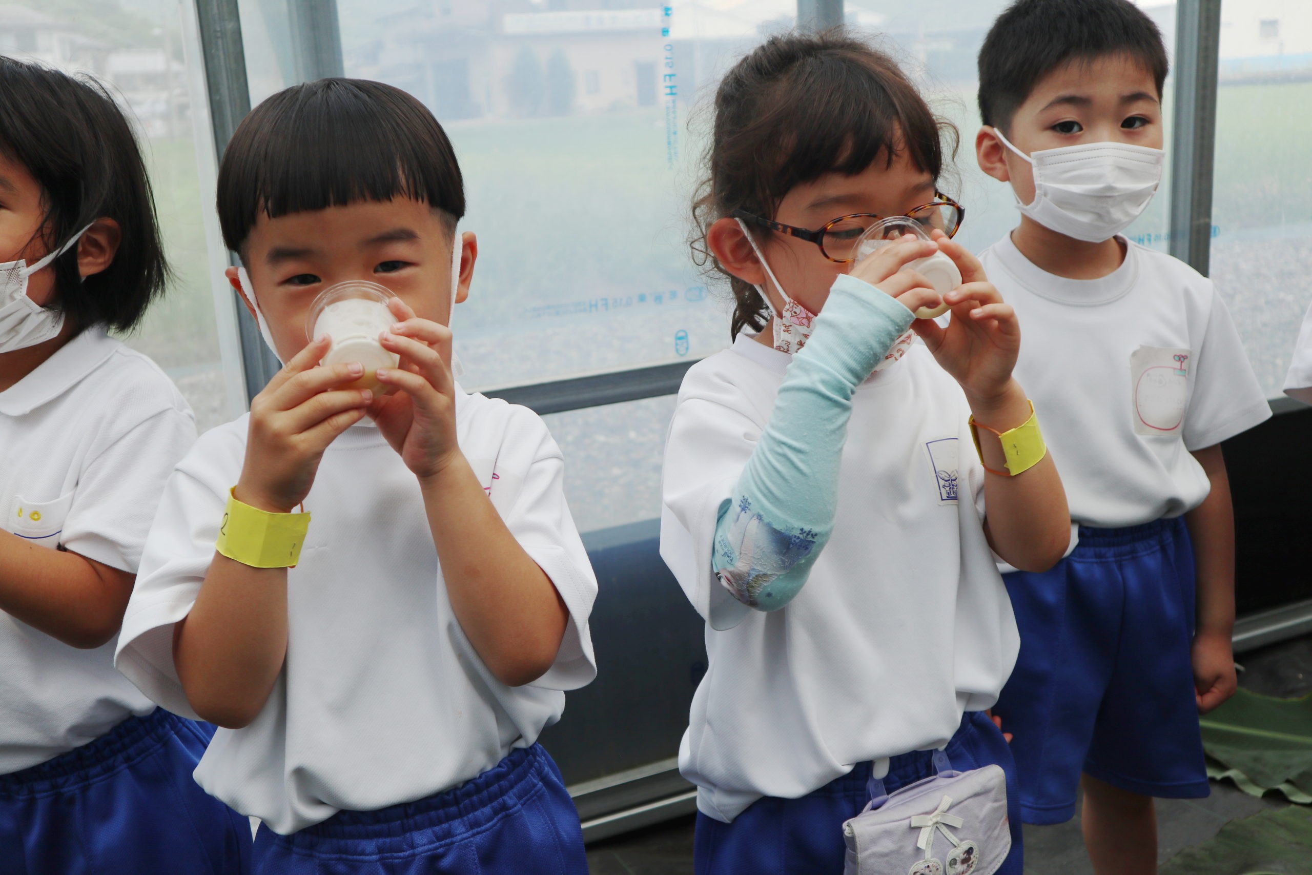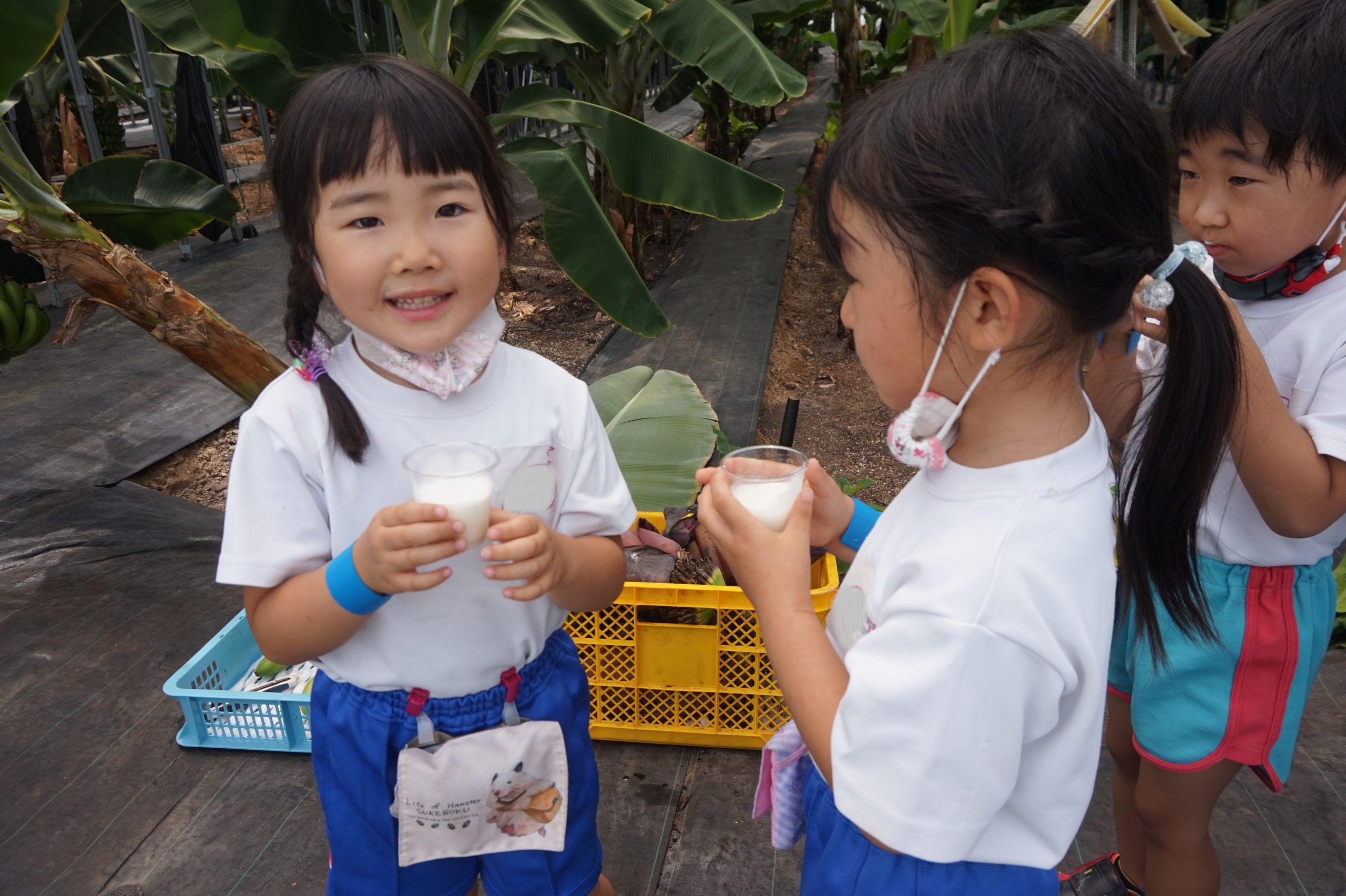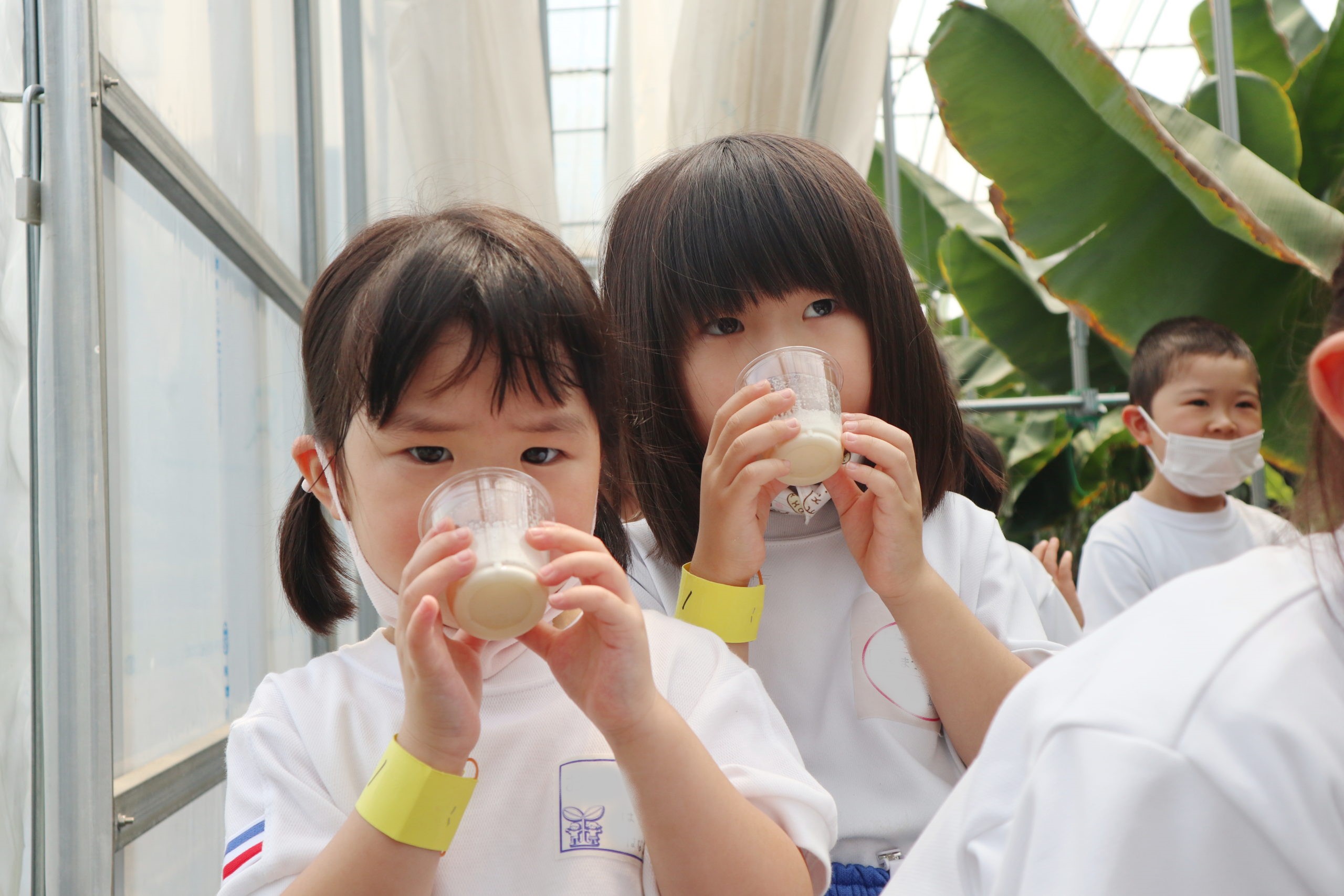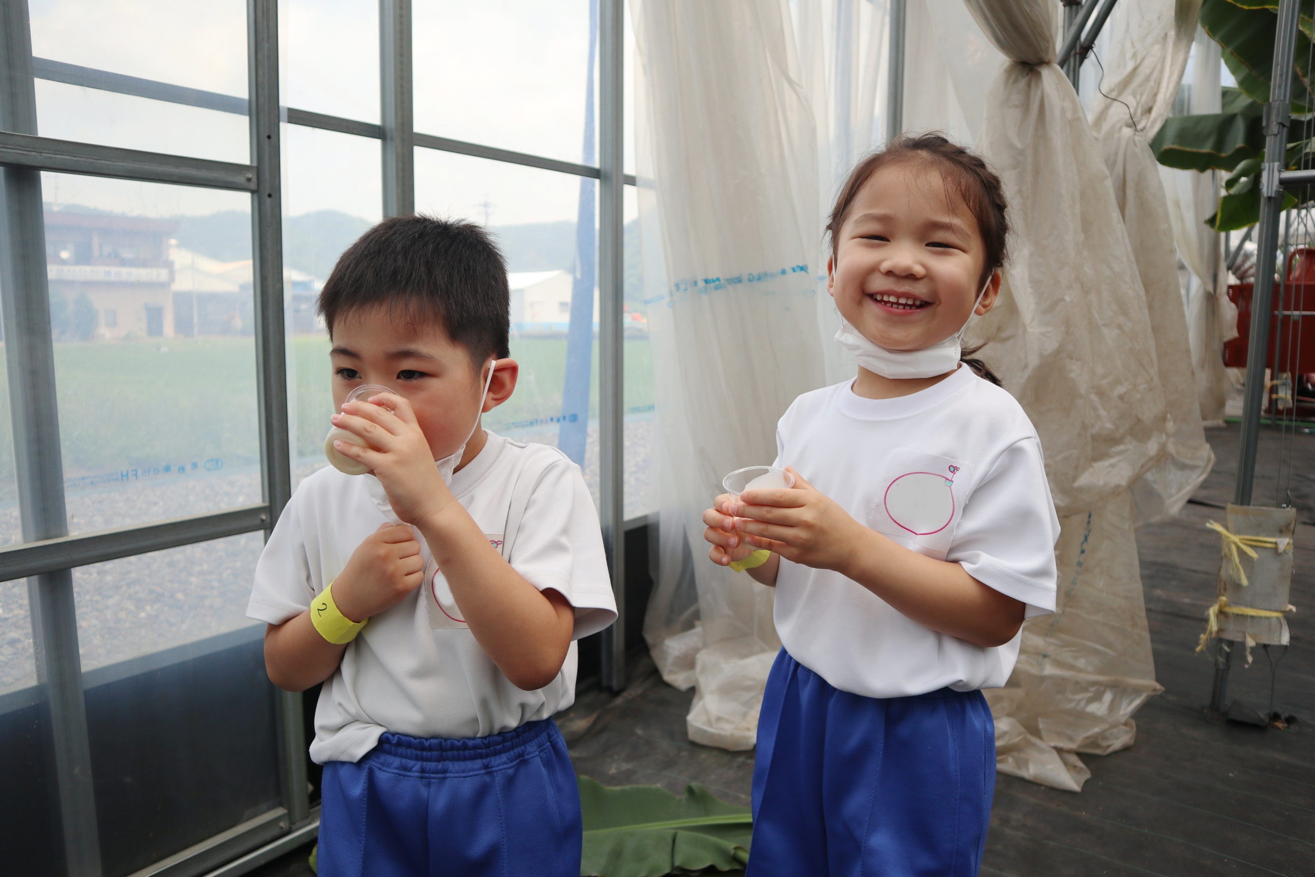 お口に付いたバナナジュースをペロリ!Yummy!「ももみたいな味がするよ!」毎日バナナジュースを飲んでいるよというおともだちも「このジュースお家で飲むのよりおいしい!味が違う!!」と大絶賛でした。「クリームみたい!あまくておいしい!」バナナミルクのおひげが似合ってるね。「おいしかった!もっと飲みたいな」となかなか空のコップを手放せないでいる子もいました。