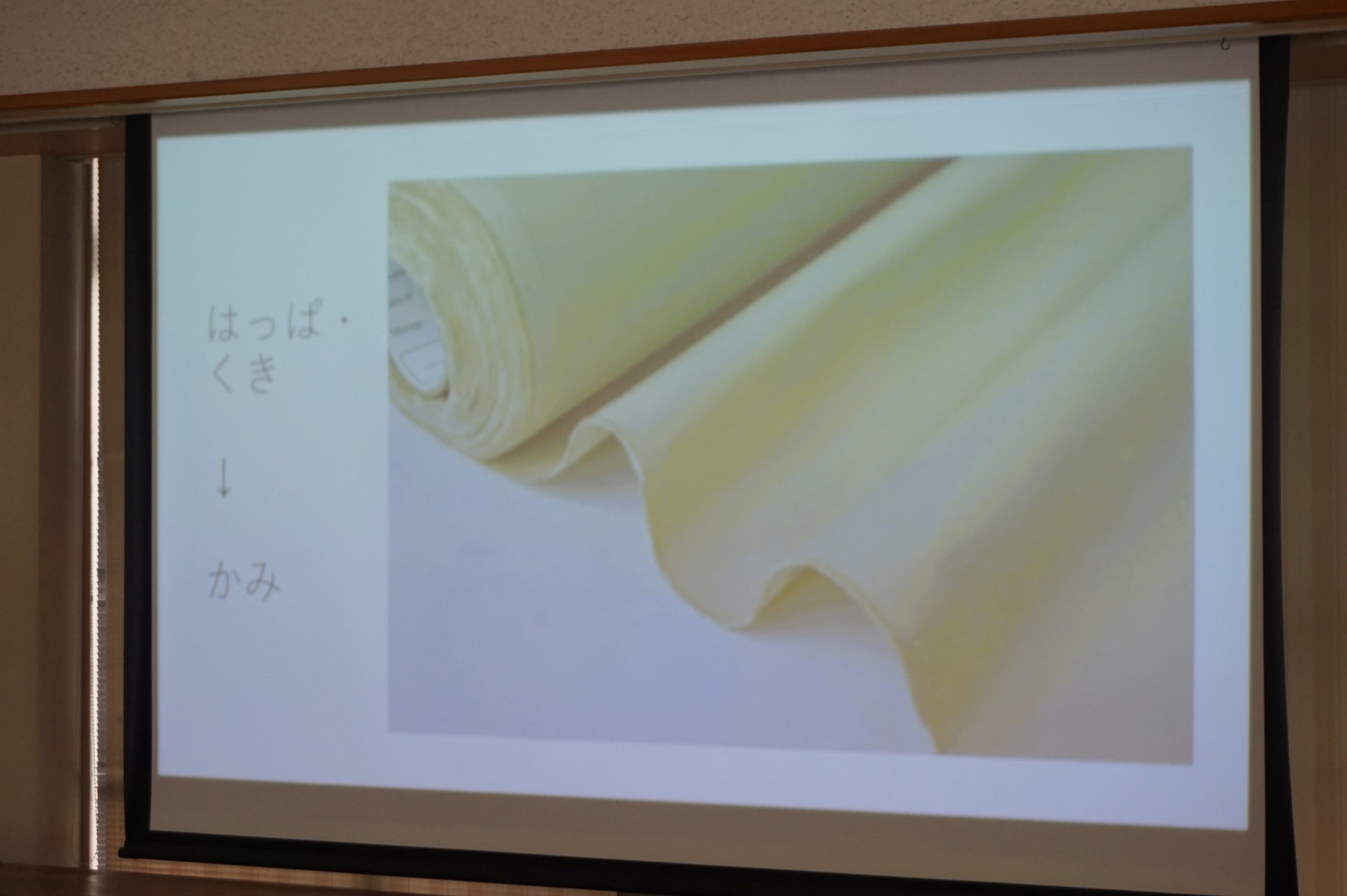 葉っぱや茎から何ができるかな?バナナの茎や葉っぱからできた紙を触らせていただきました。