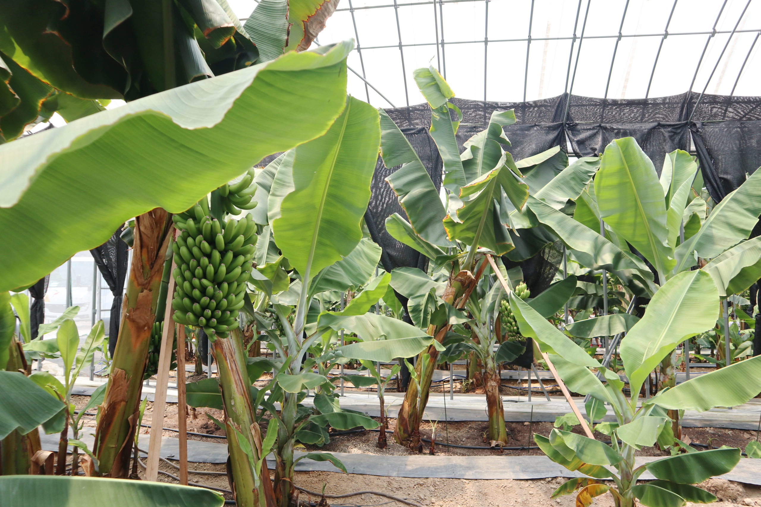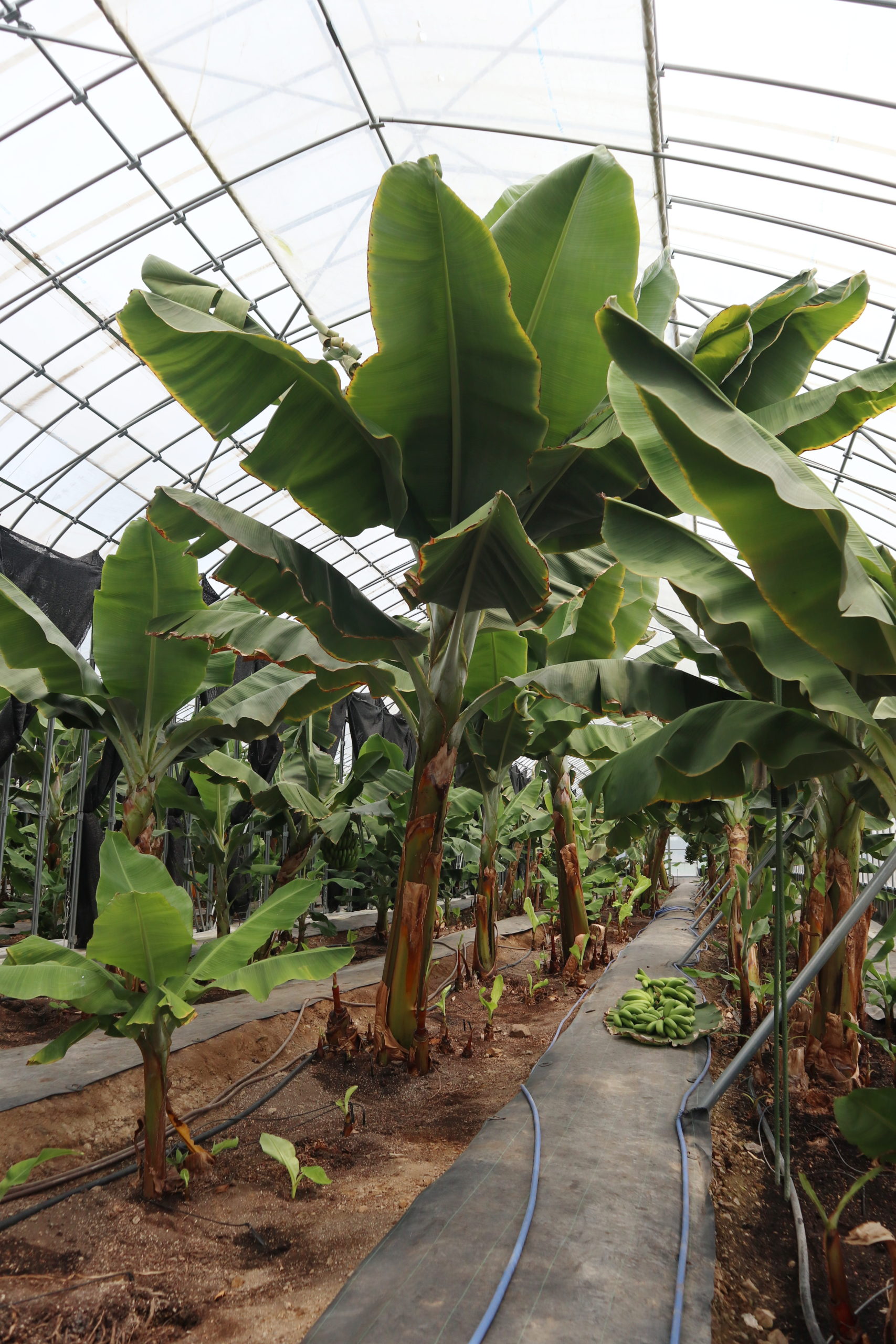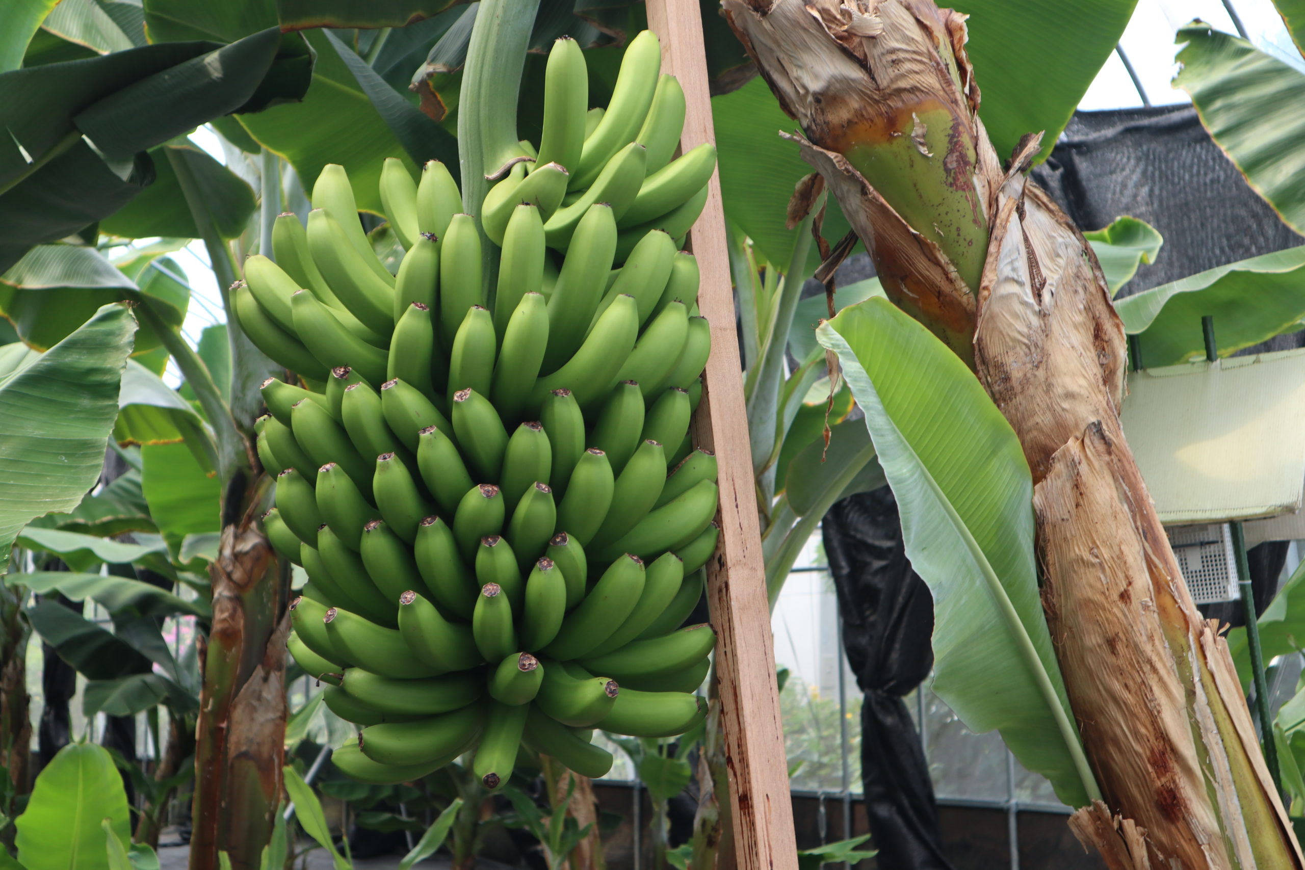 建物の隣には大きな大きな温室が広がっていました。「あっ!バナナ見ーつけた!」「バナナって黄色じゃないの⁈」