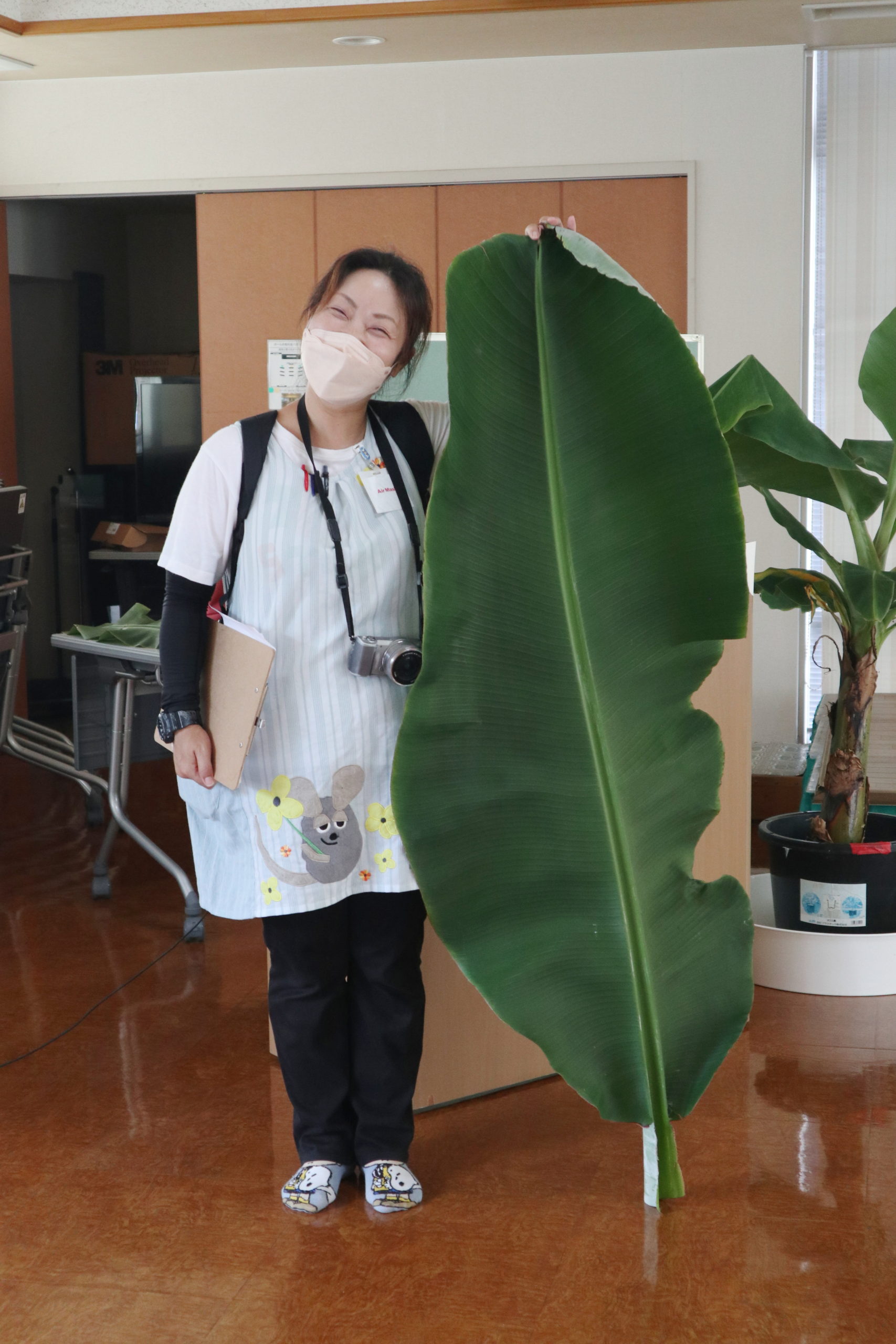 「硬いよ。」そうだね。分厚くてしっかりした紙でしたよ。東山動植物園のイケメンゴリラで知られるシャバーニ君(ニシローランドゴリラ)は、ここのバナナのくきや葉っぱを食べています。手でバリバリっと力強くちぎって食べる様子を映像で見せていただきました。今度東山動植物園へお出かけの際には、シャバーニ君が岐阜で育ったバナナの茎や葉を食べていることにもご注目くださいね。