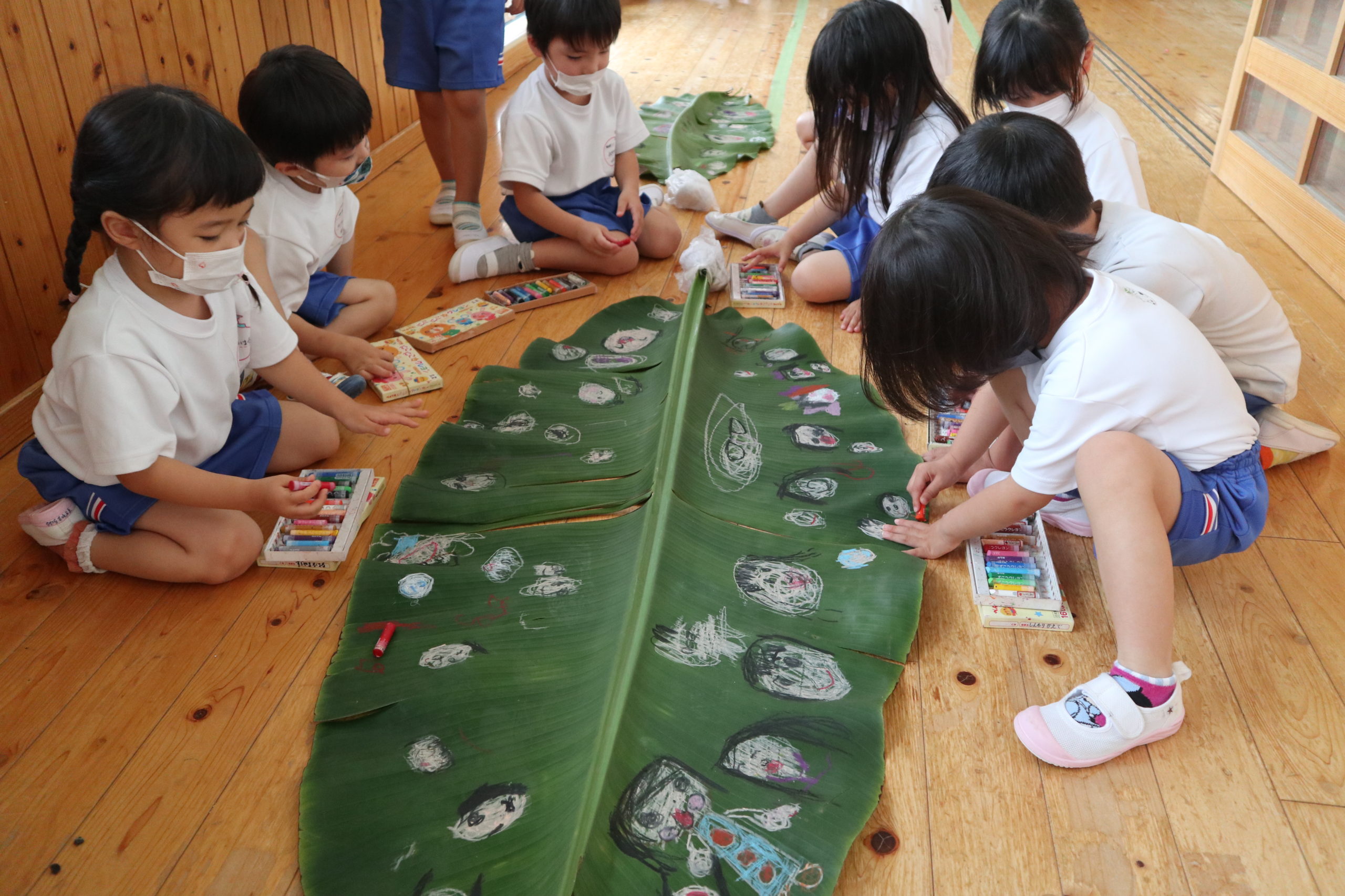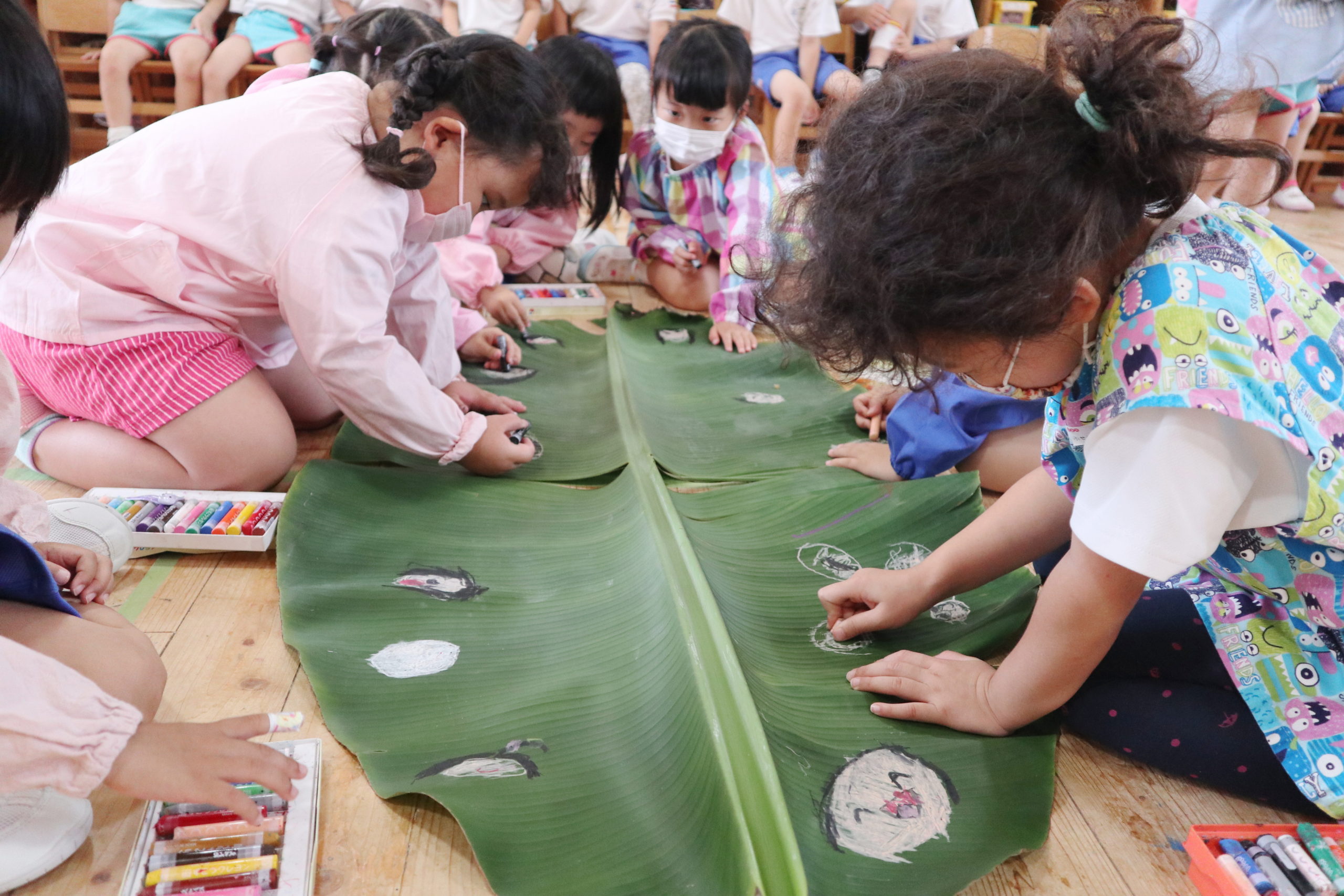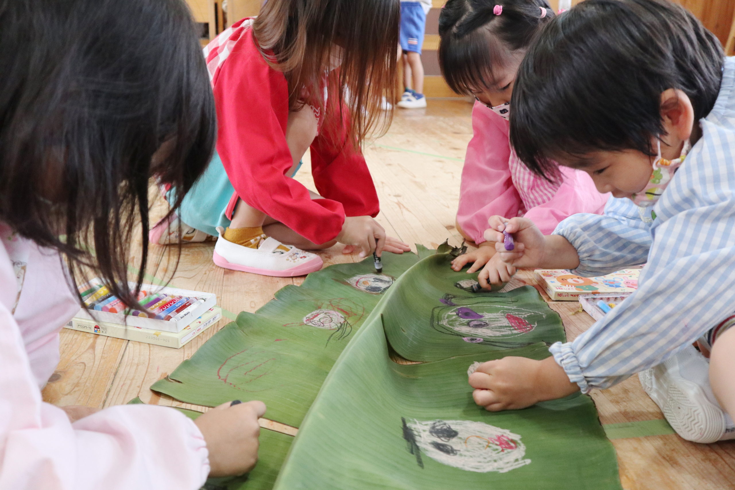 年長組のこどもたちはクレヨンでのびのび描いていましたよ!大きな葉っぱがいっぱい!『どこでもドア』楽しかったよ!よく見ると、絵の中のみんなの手にはバナナジュース!!とってもおいしかったね!