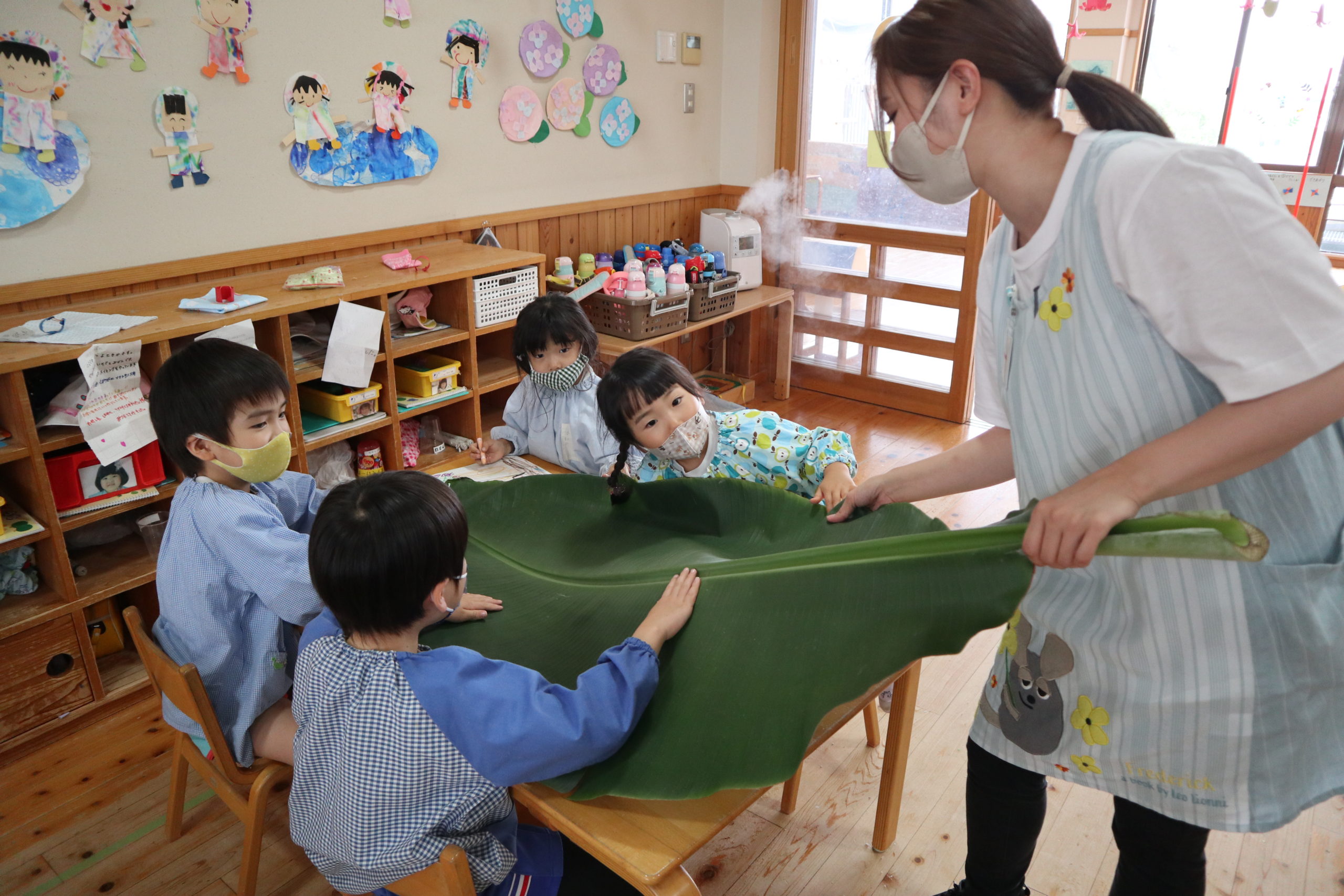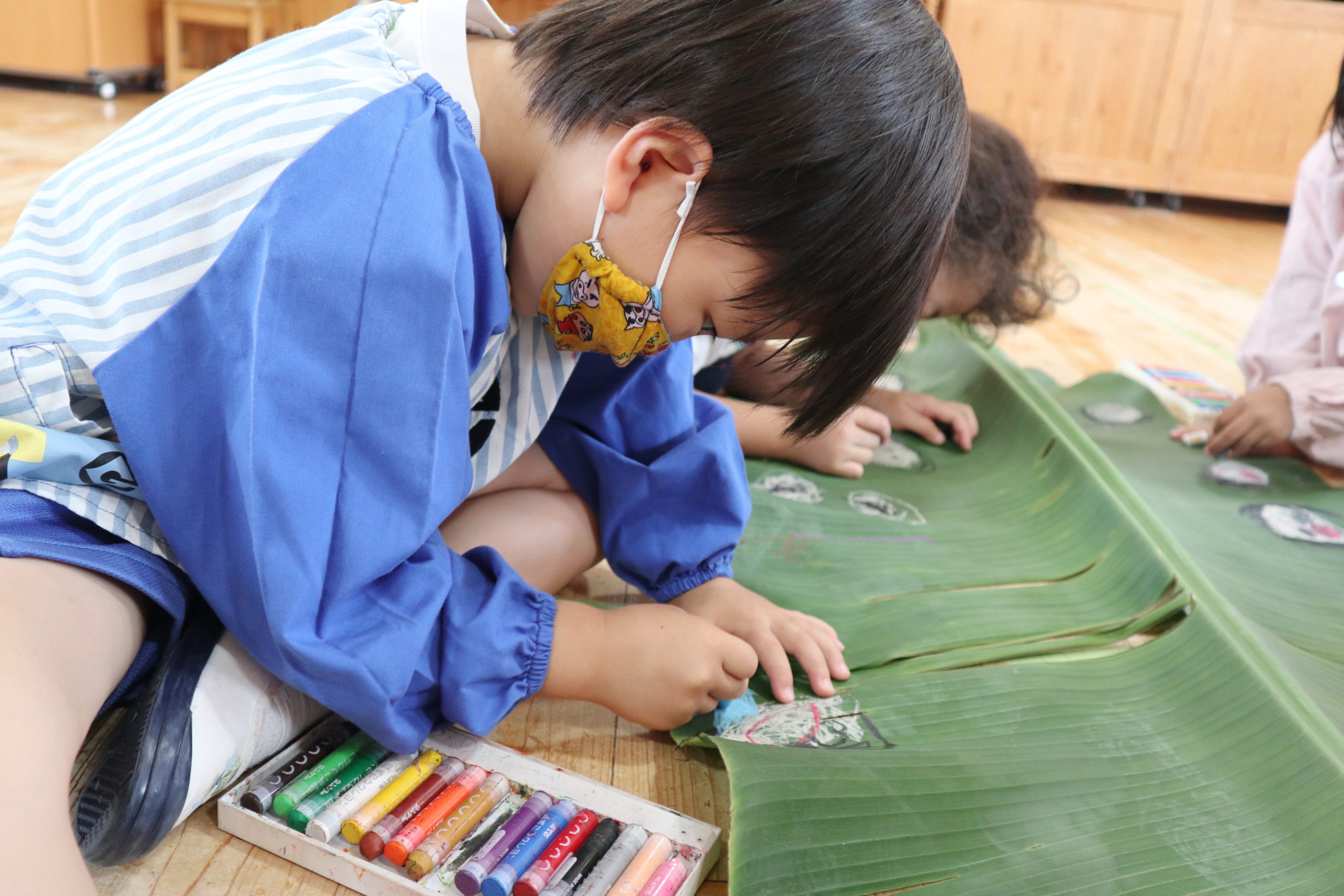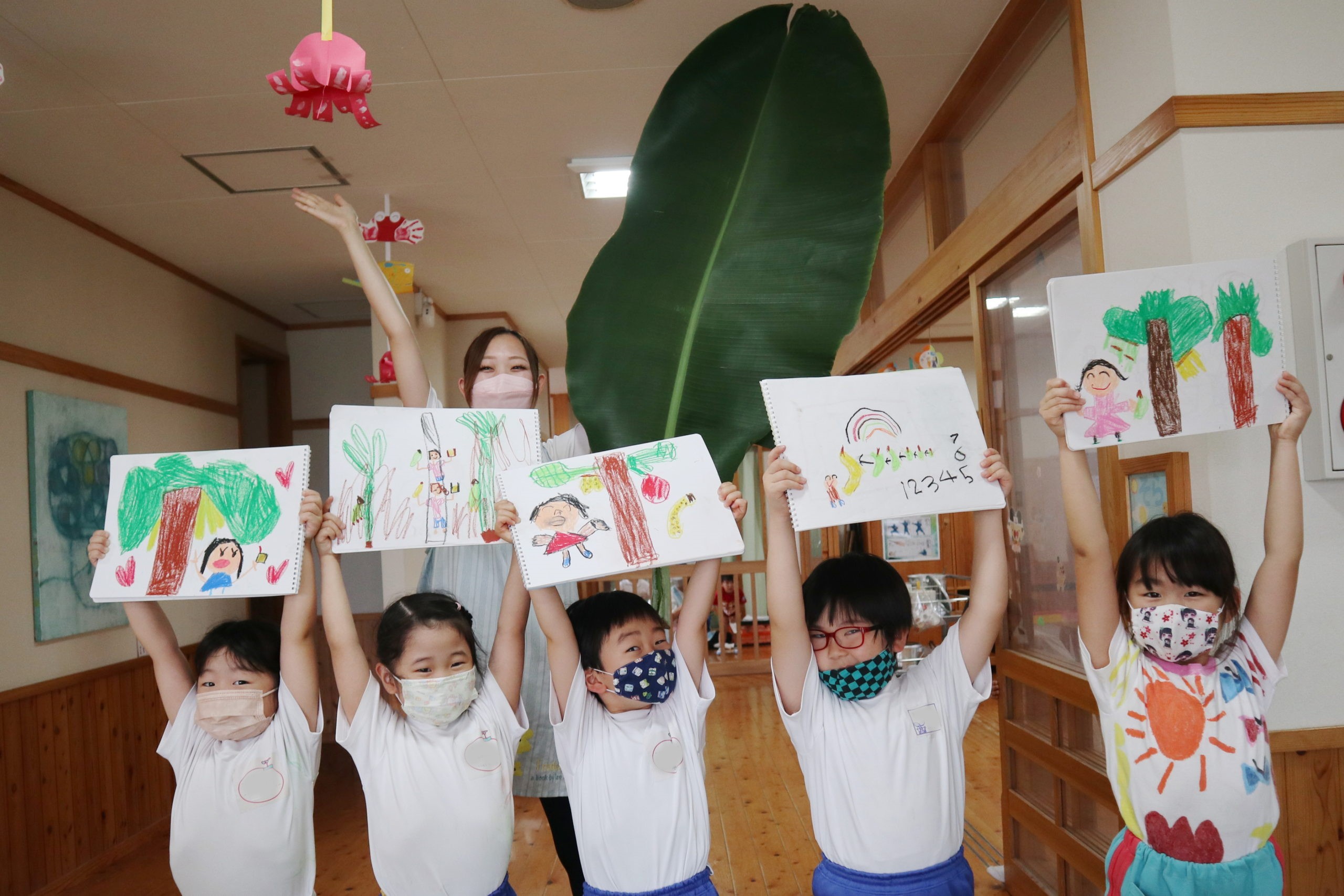 年長組のこどもたちはクレヨンでのびのび描いていましたよ!大きな葉っぱがいっぱい!『どこでもドア』楽しかったよ!よく見ると、絵の中のみんなの手にはバナナジュース!!とってもおいしかったね!