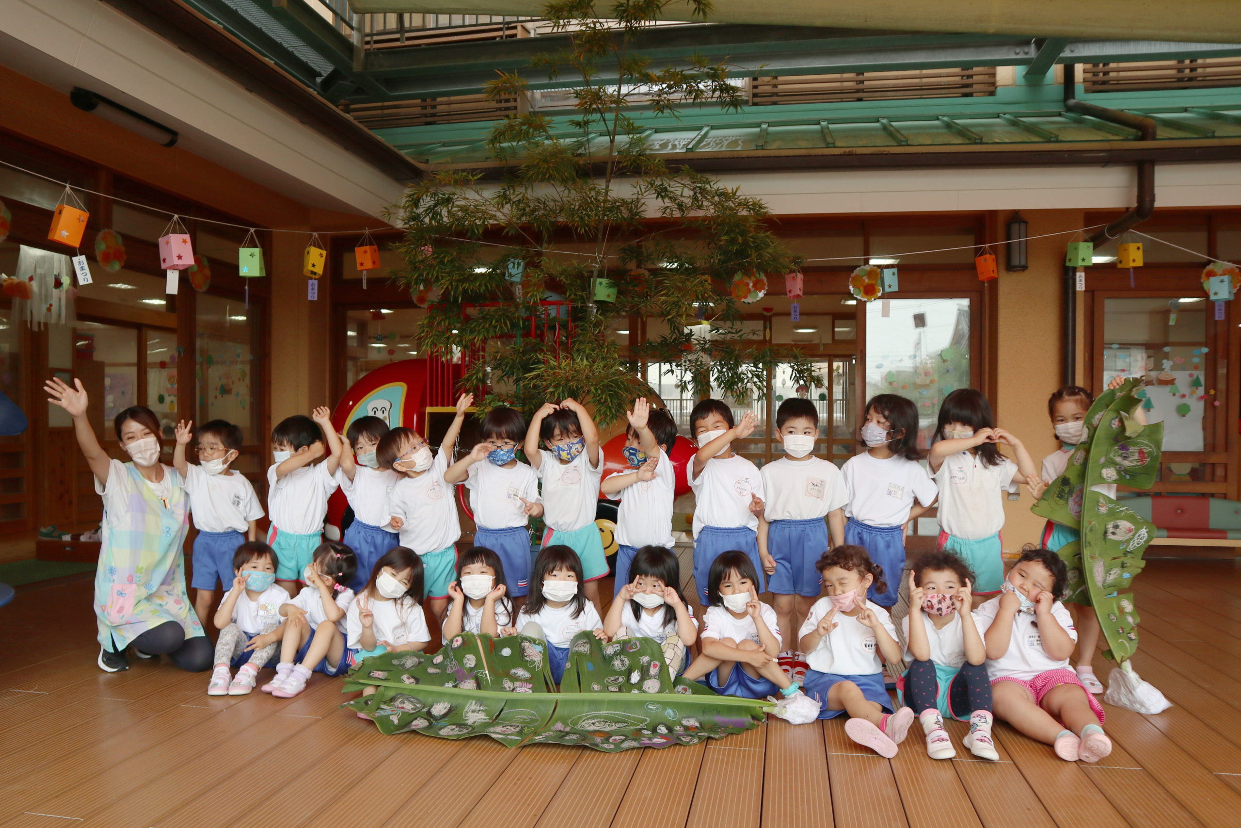 みんなのお顔がならんだバナナの葉っぱとあらじん組さんとハイチーズ!