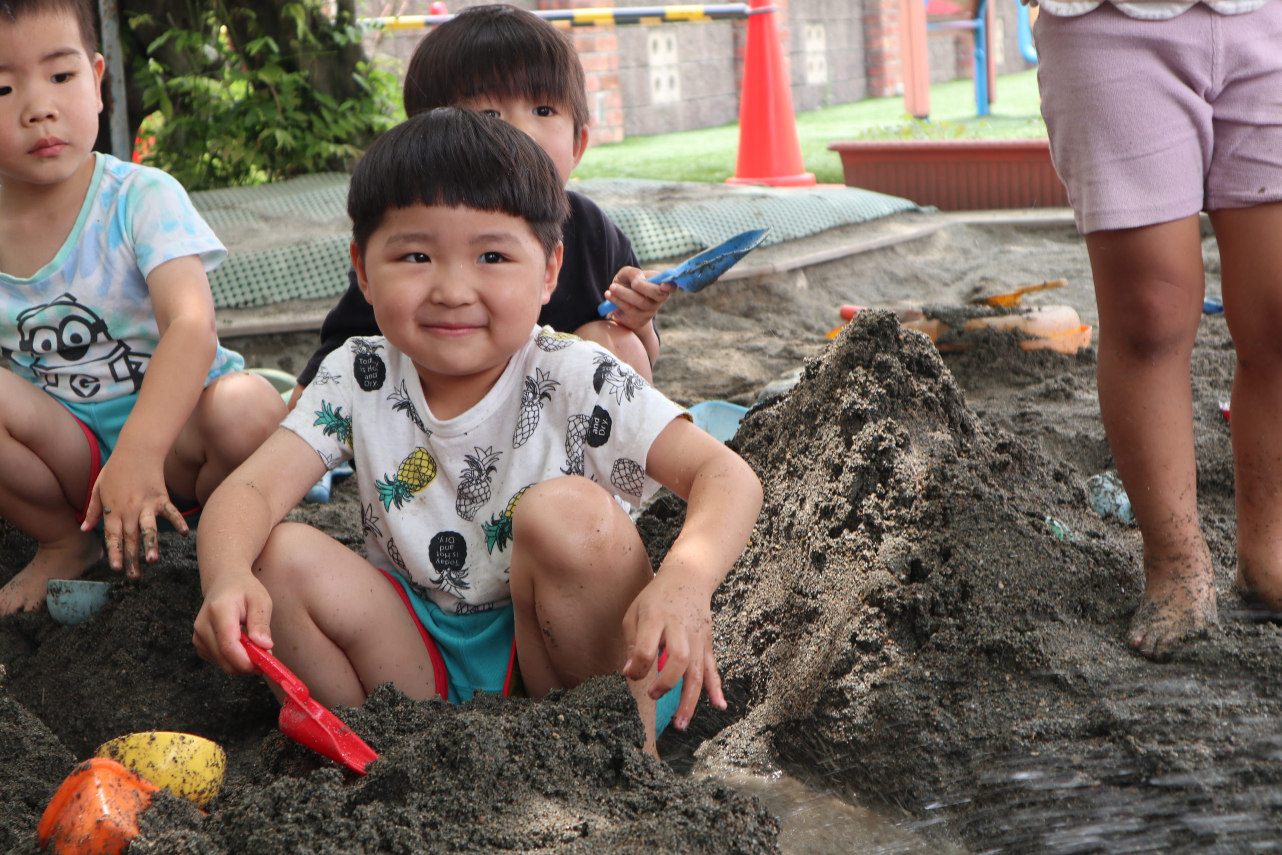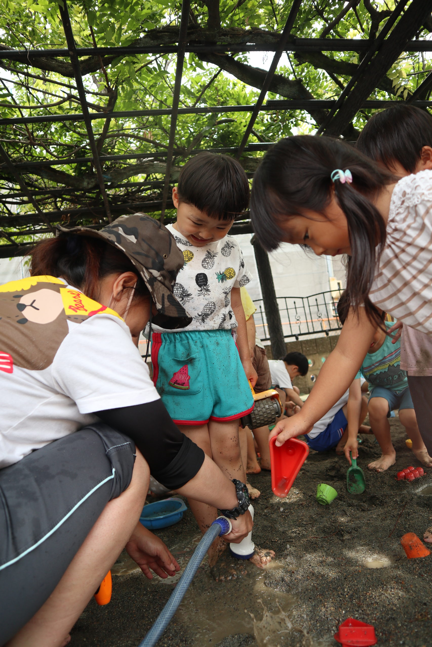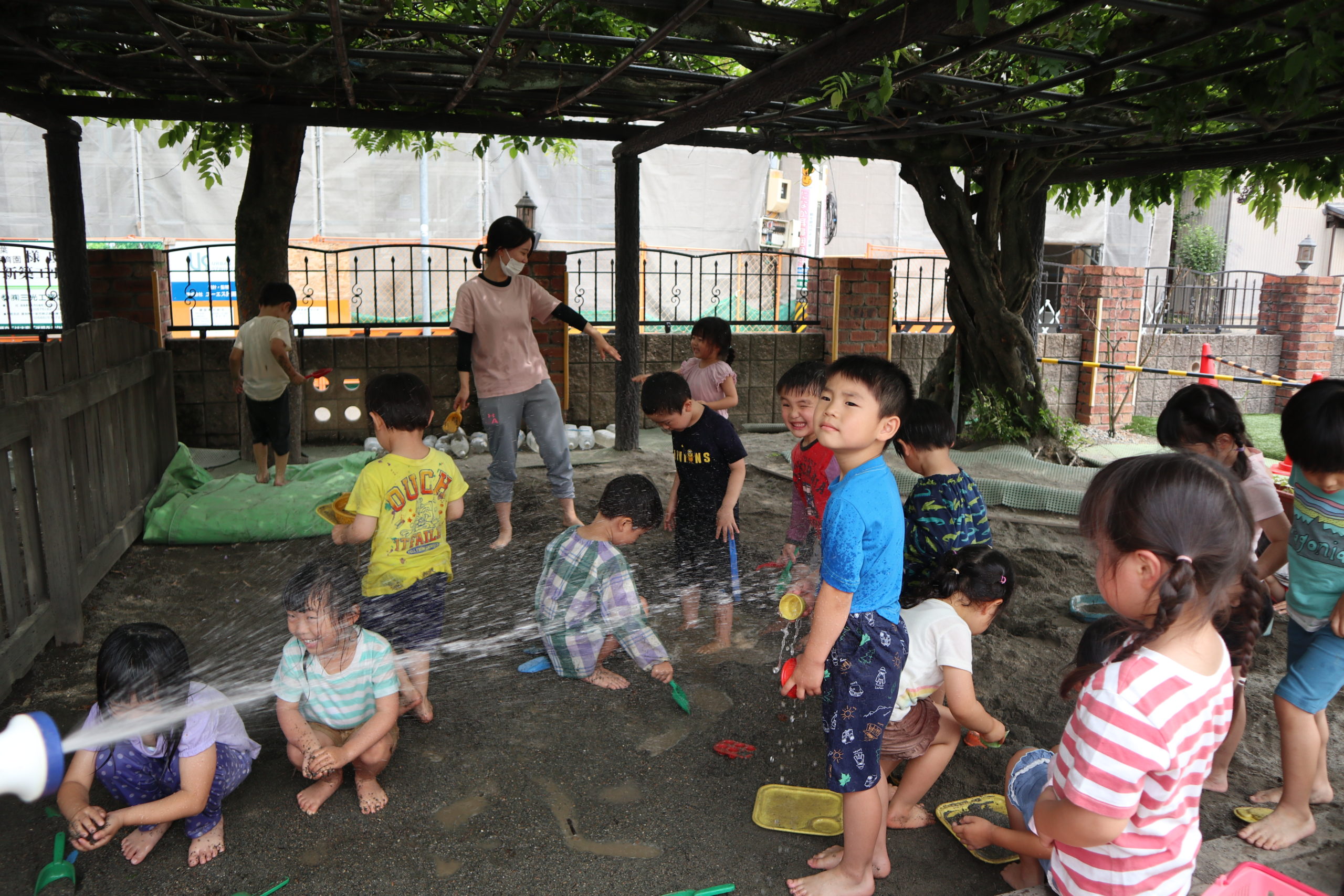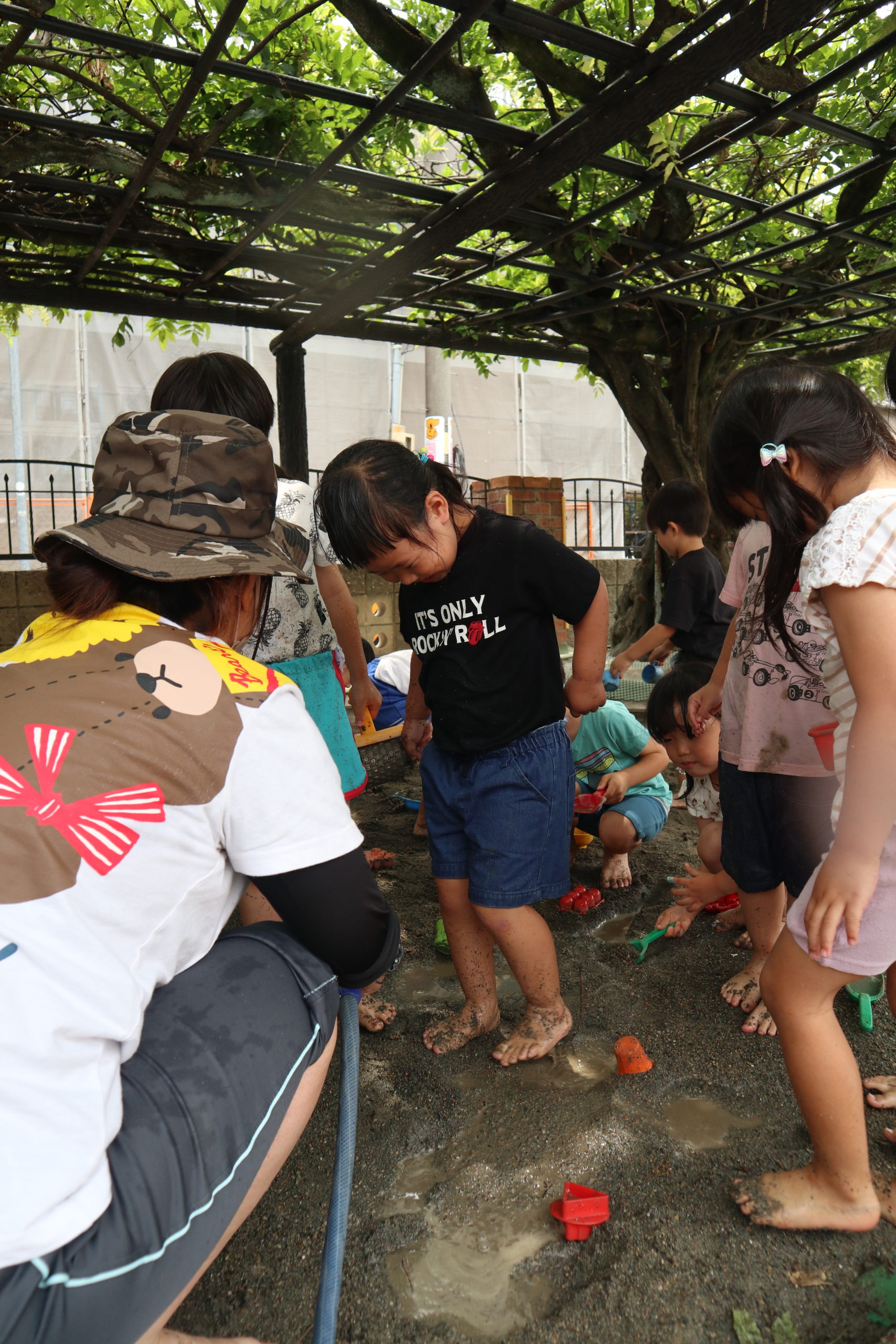 水あそびと砂遊びが一緒にできて楽しいね♪みんなのキャッキャッとはしゃぐ声が園庭に響いていました。