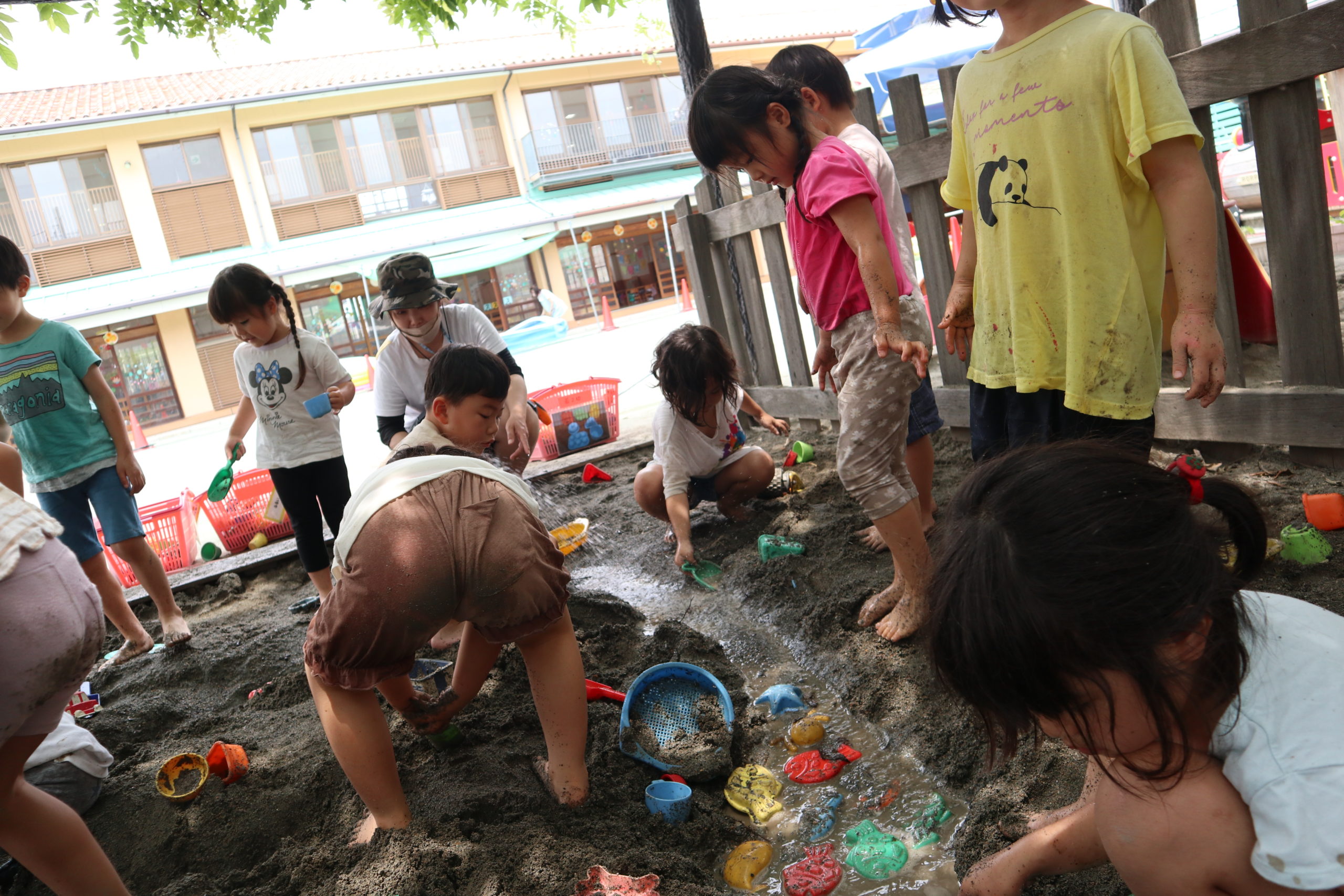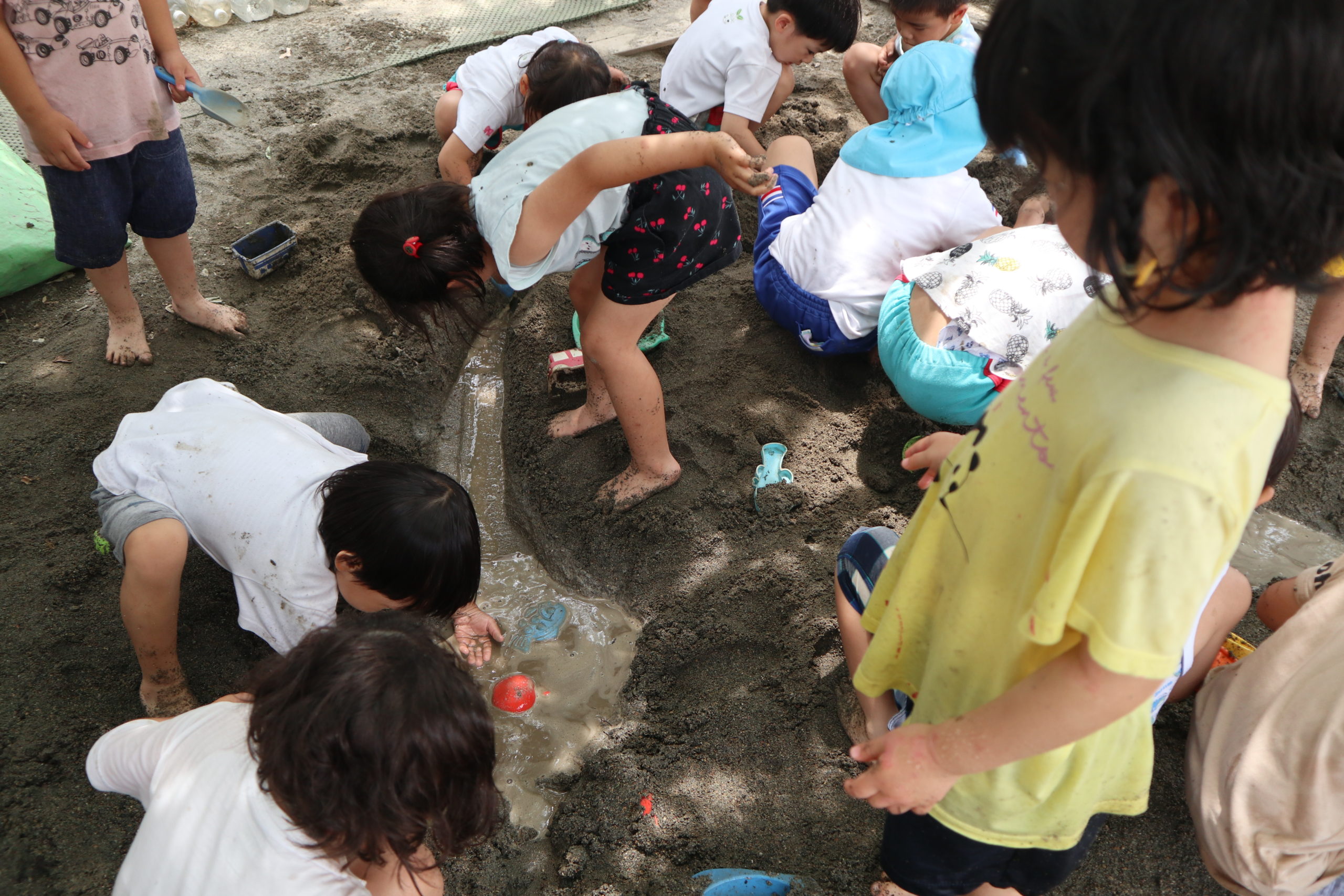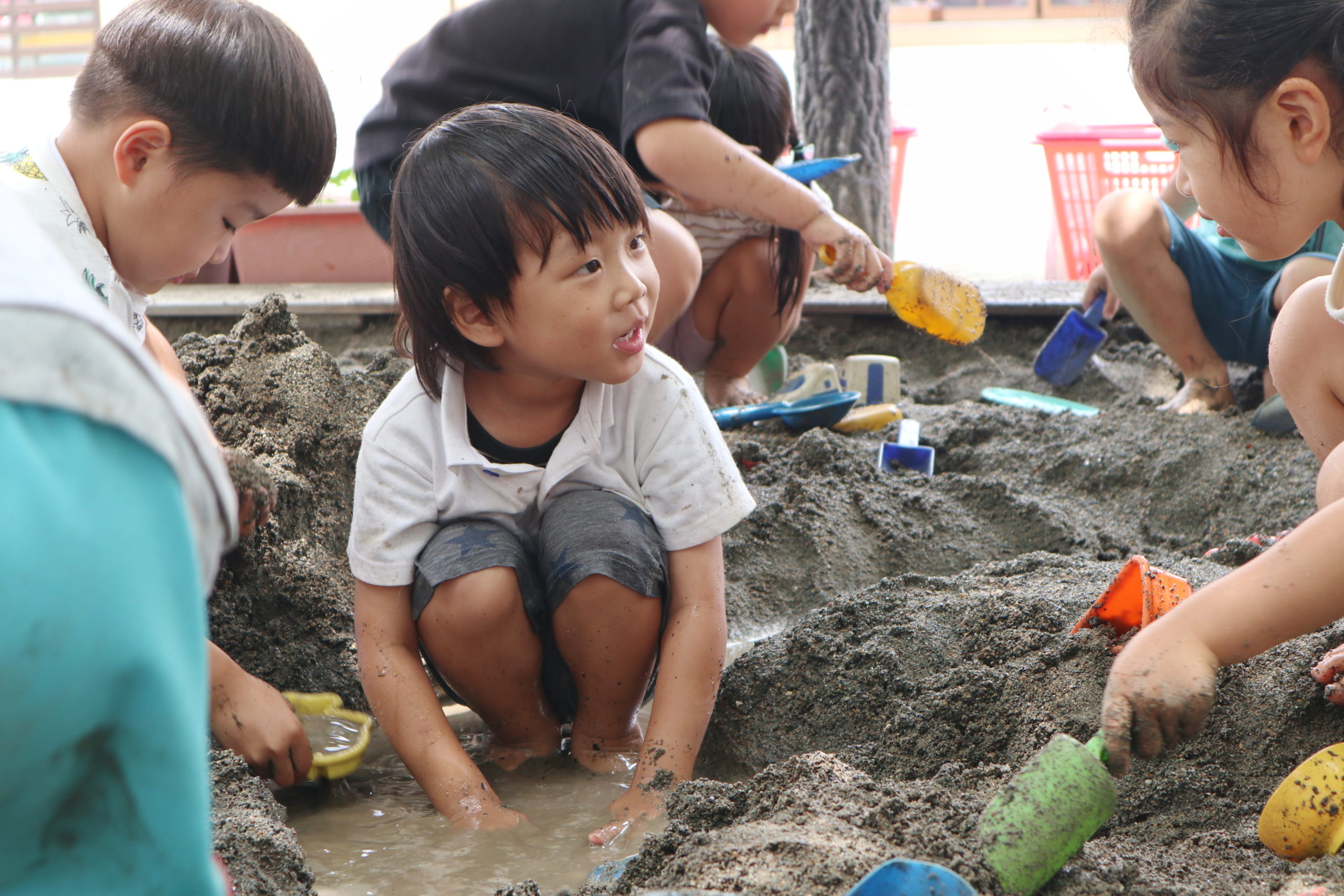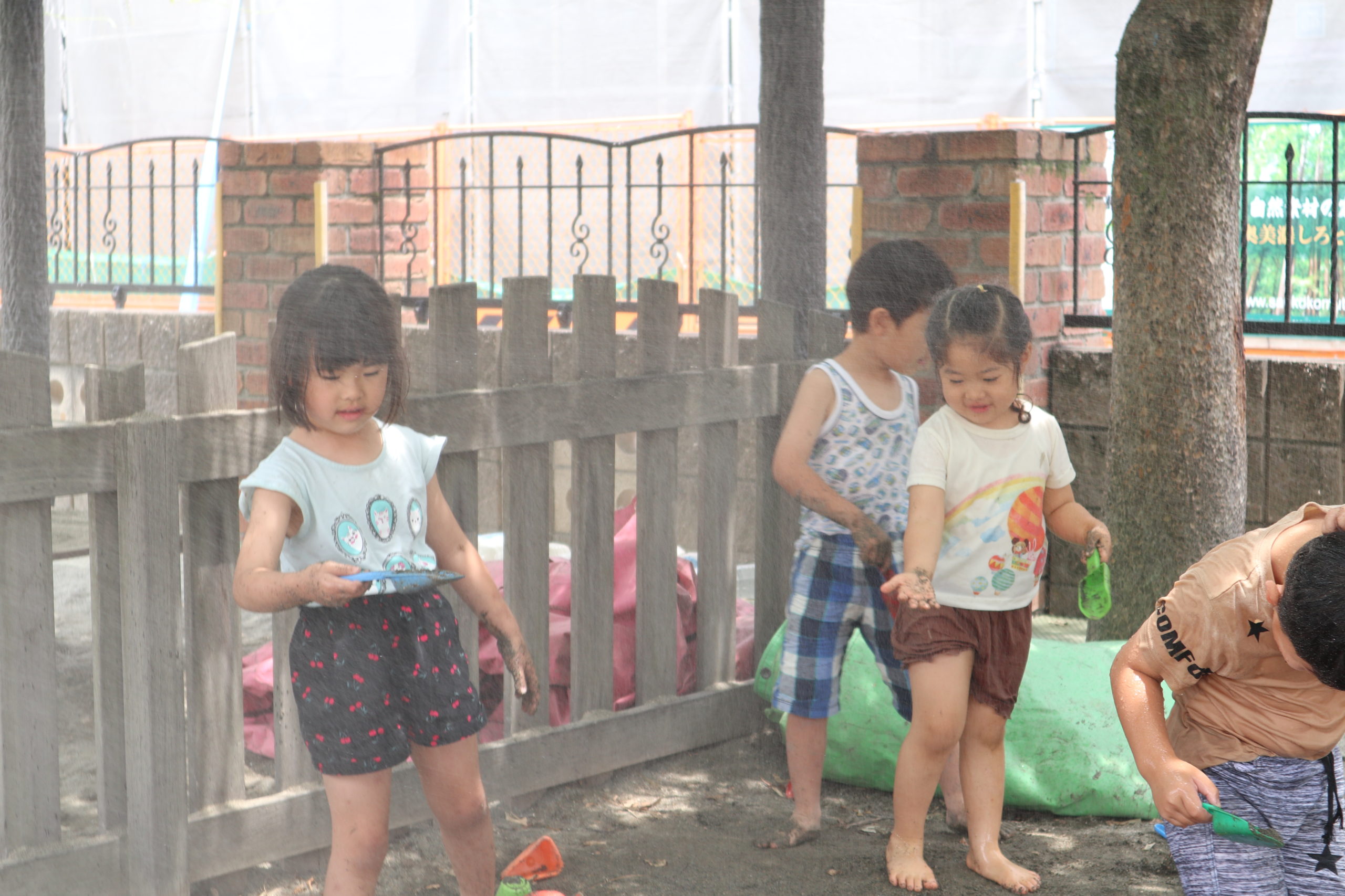 水あそびと砂遊びが一緒にできて楽しいね♪みんなのキャッキャッとはしゃぐ声が園庭に響いていました。