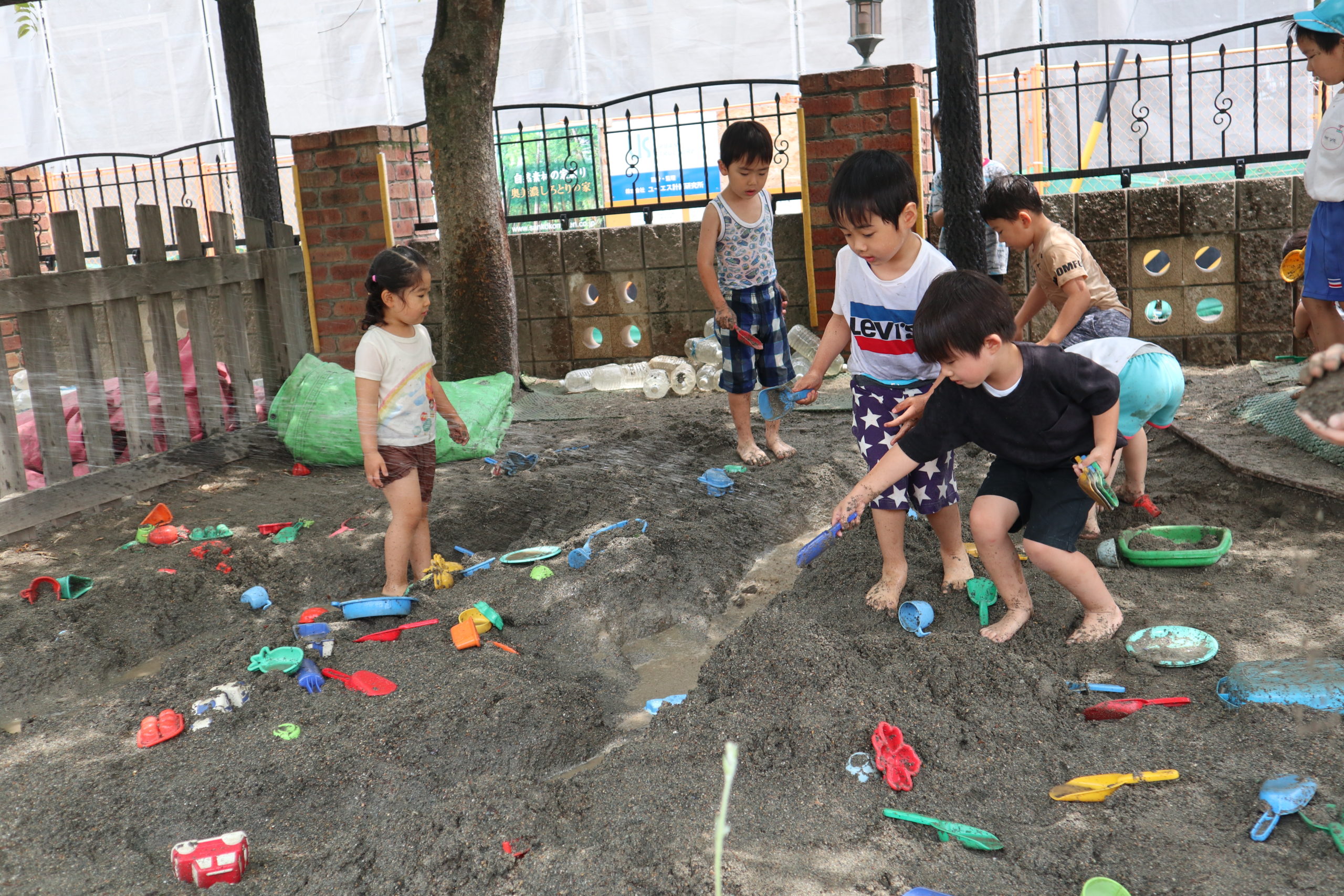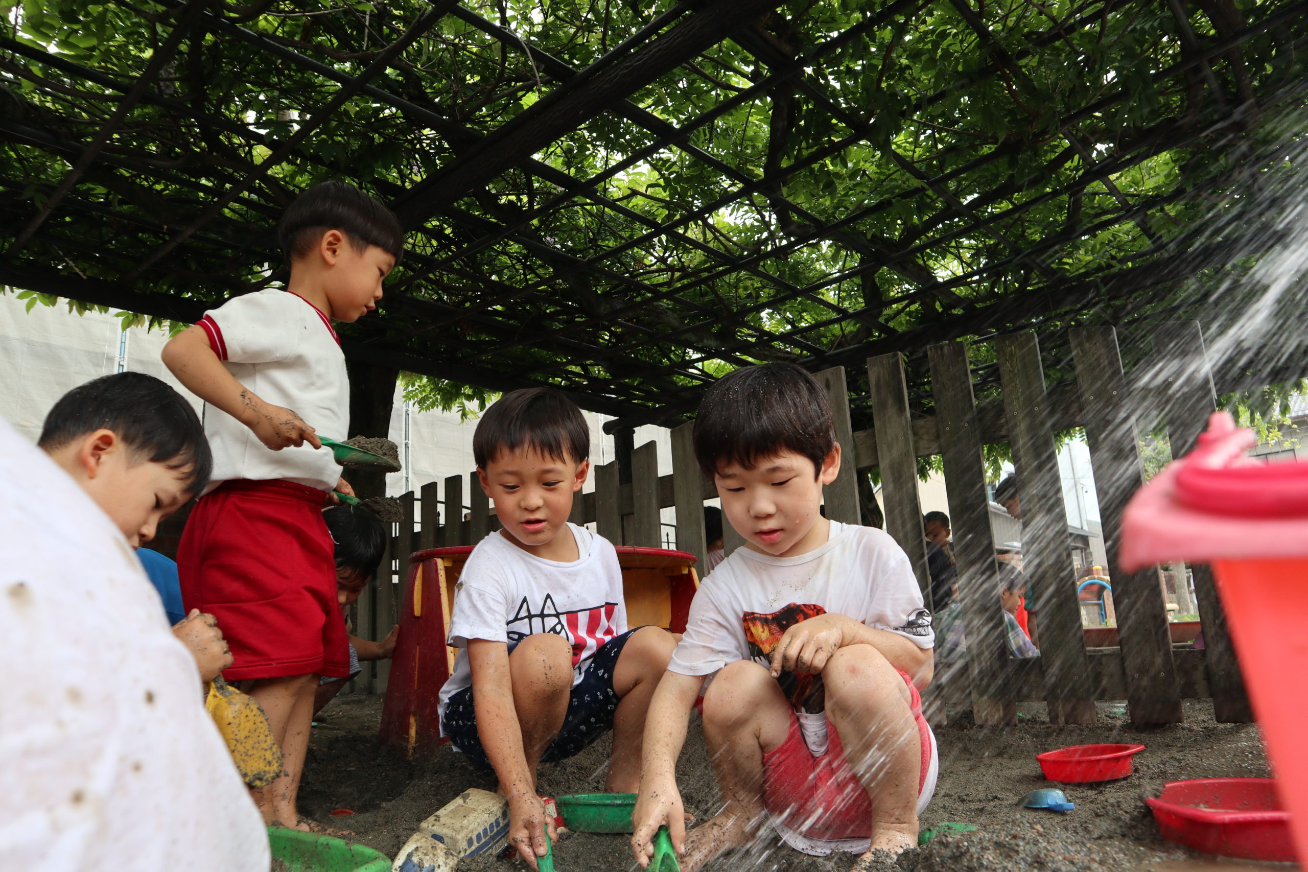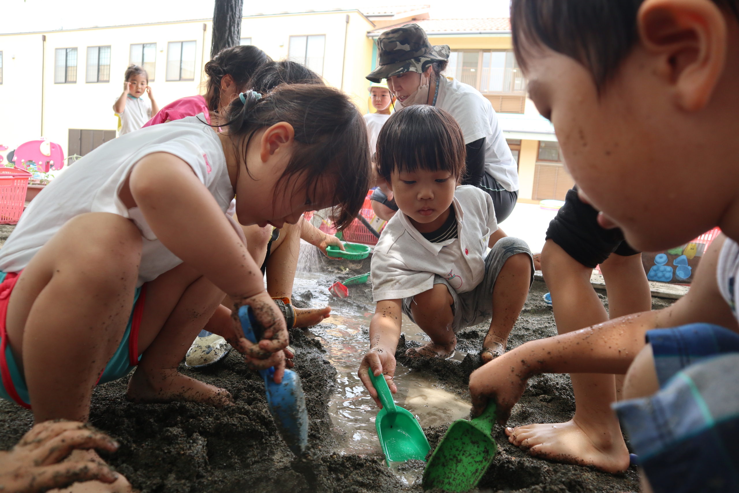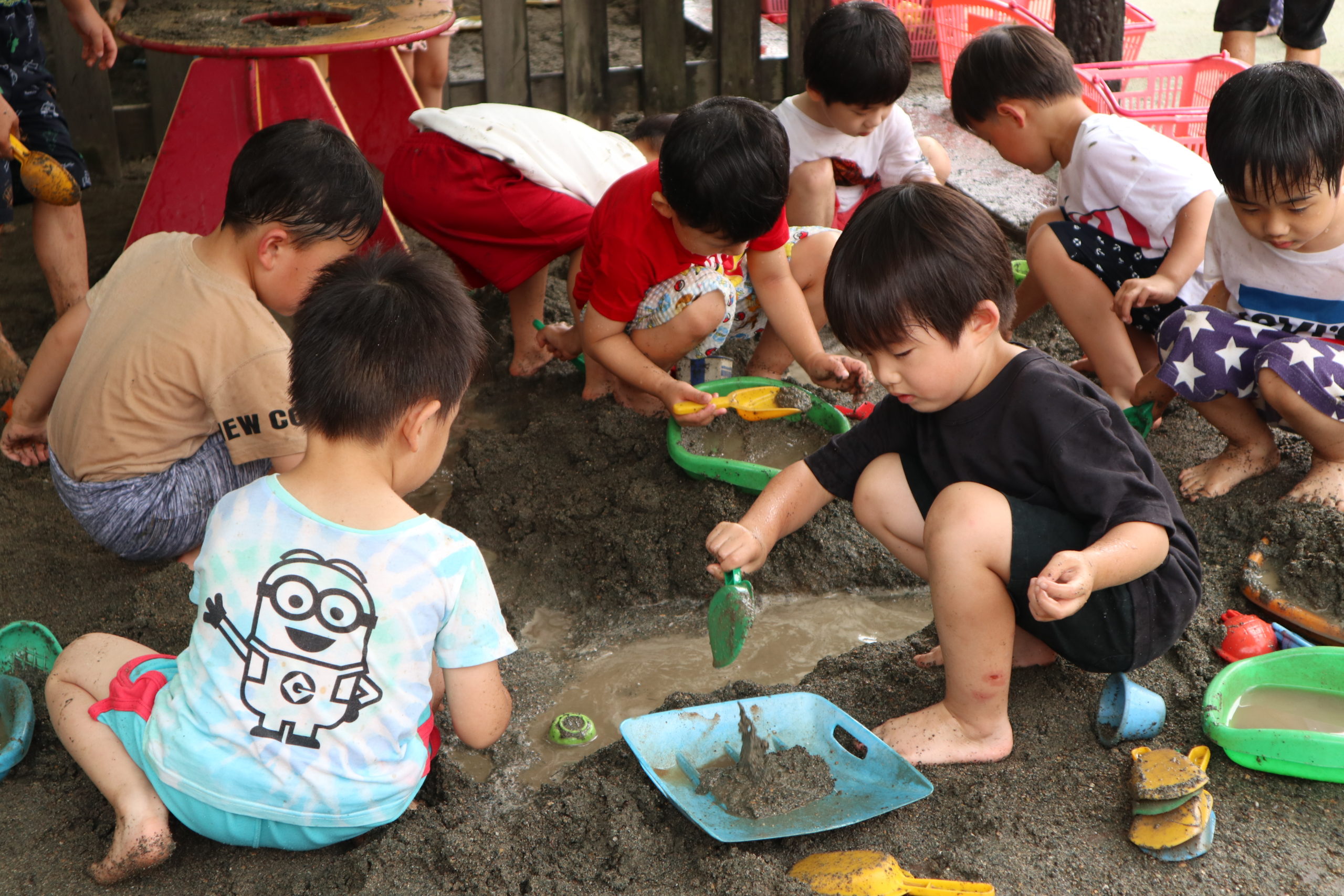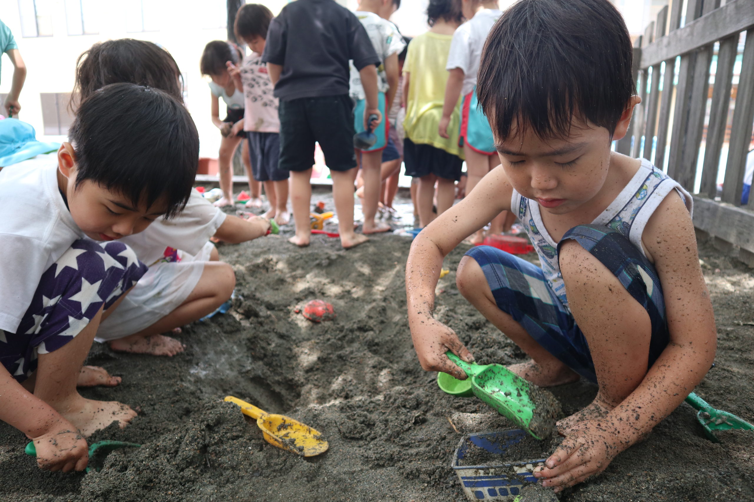 水あそびと砂遊びが一緒にできて楽しいね♪みんなのキャッキャッとはしゃぐ声が園庭に響いていました。