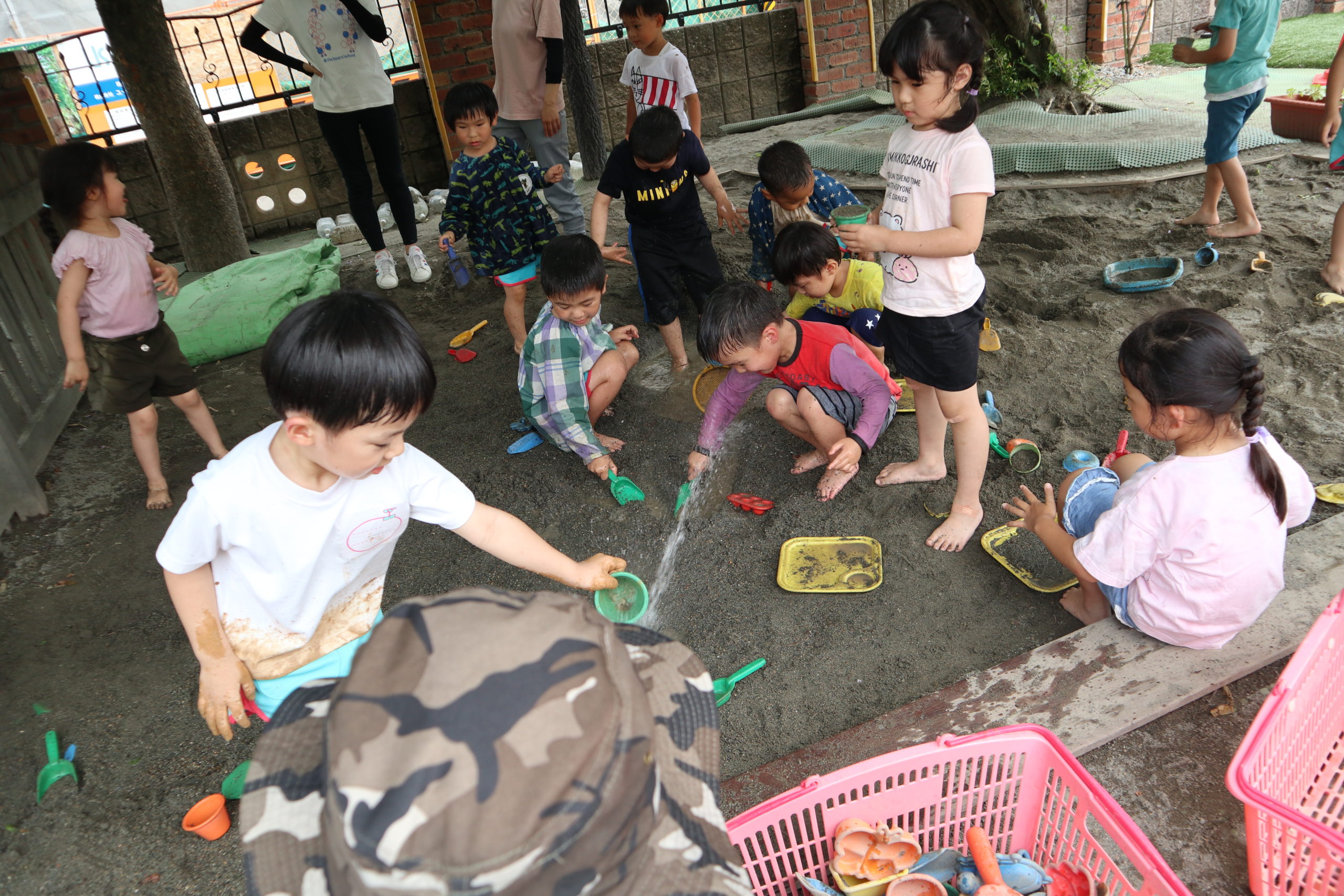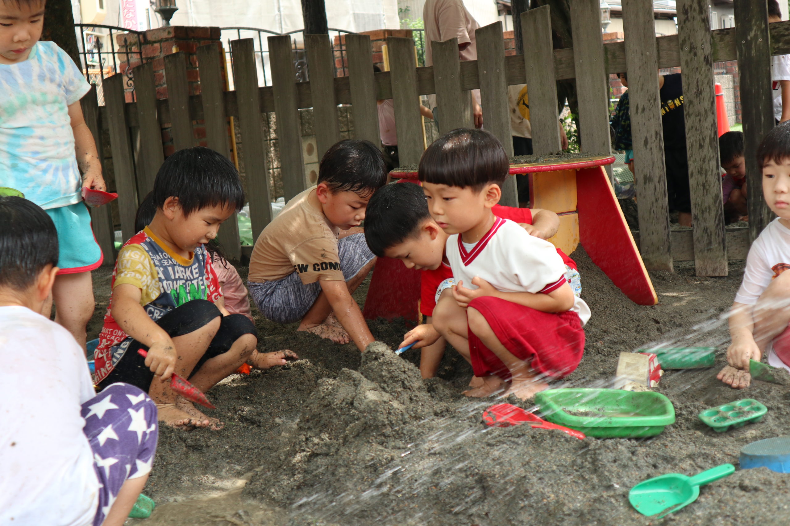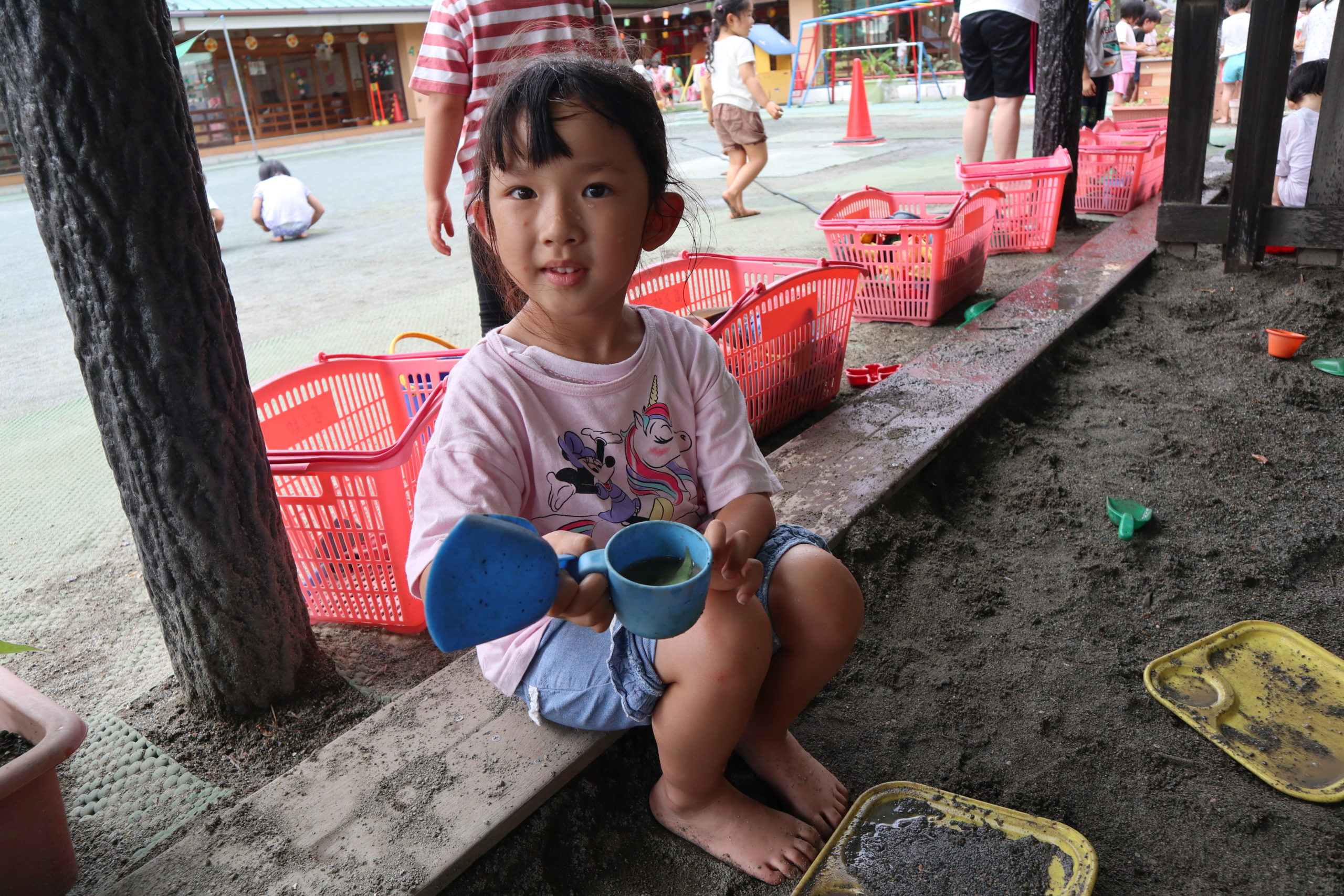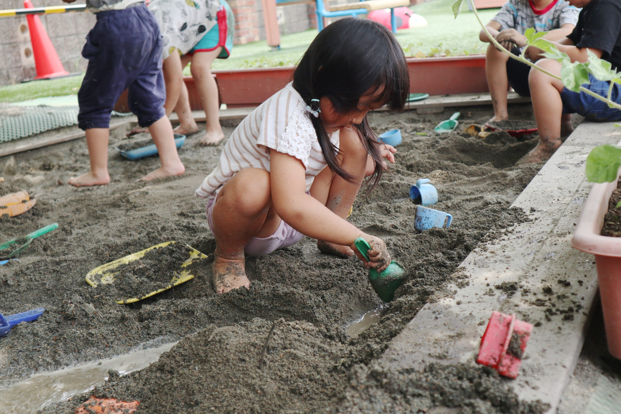 水あそびと砂遊びが一緒にできて楽しいね♪みんなのキャッキャッとはしゃぐ声が園庭に響いていました。