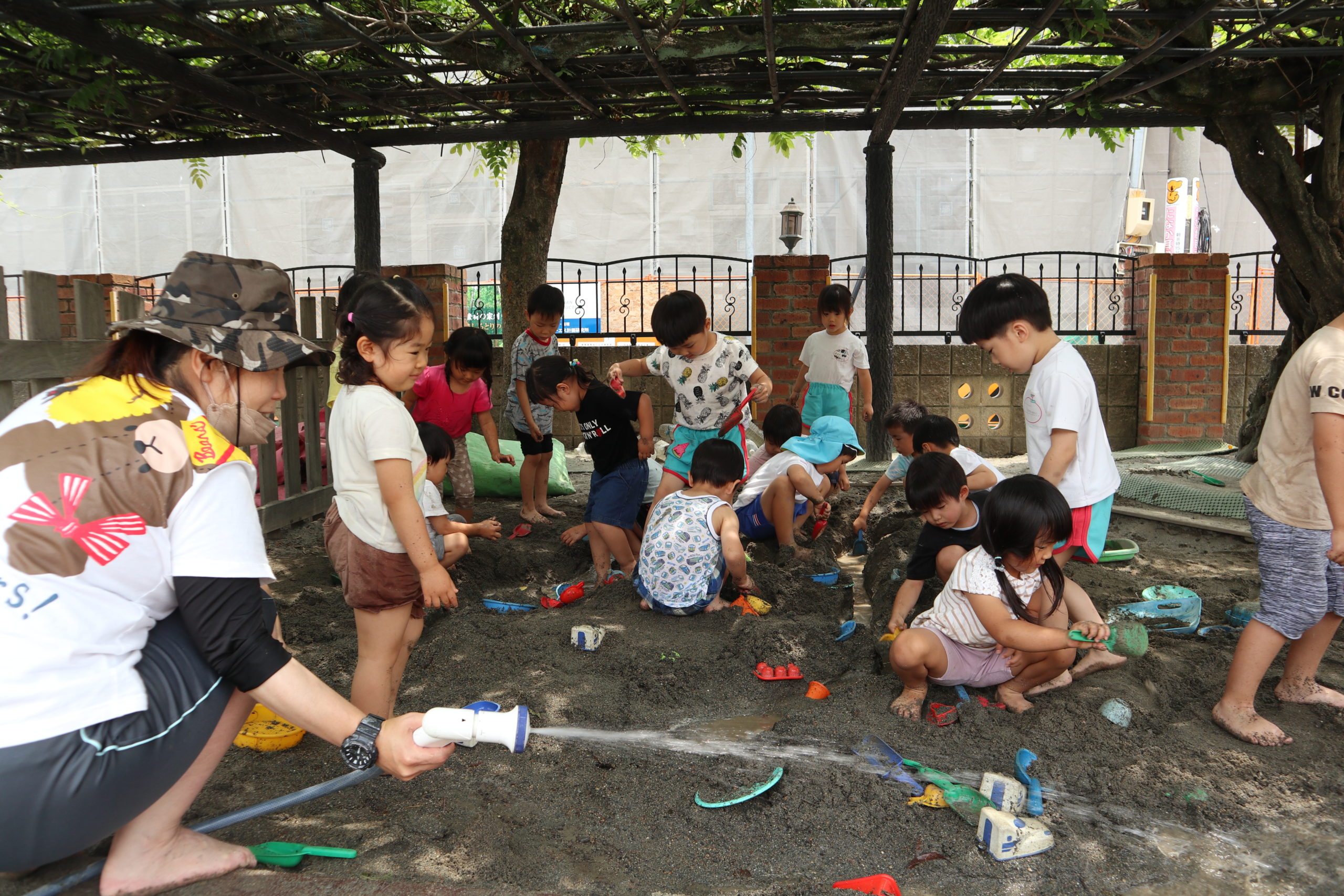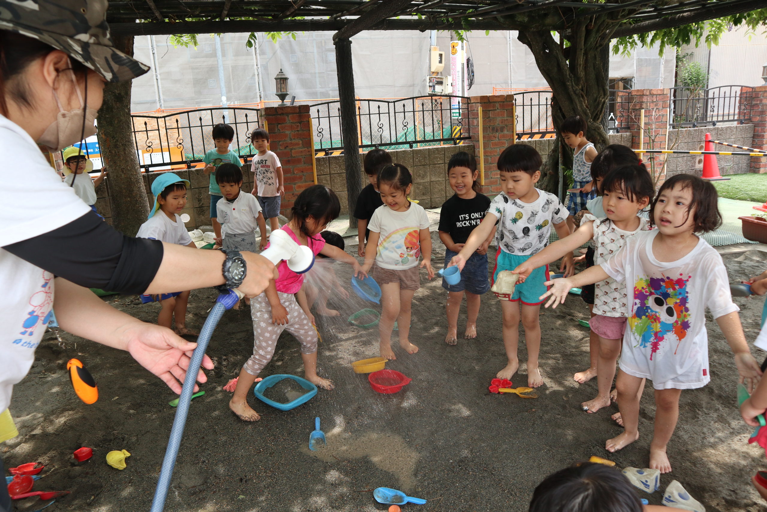 「あきこ先生お水ちょうだい」「私も!」うんと気温が上がって冷たいお水を触るのがとても気持ちいいね!