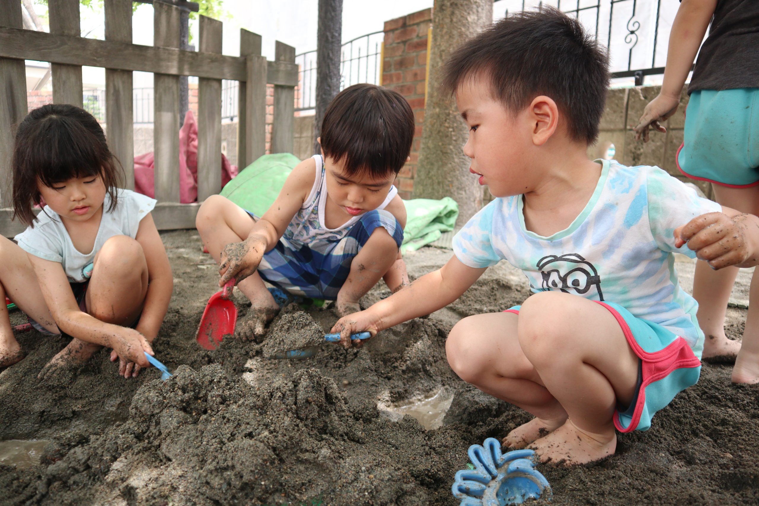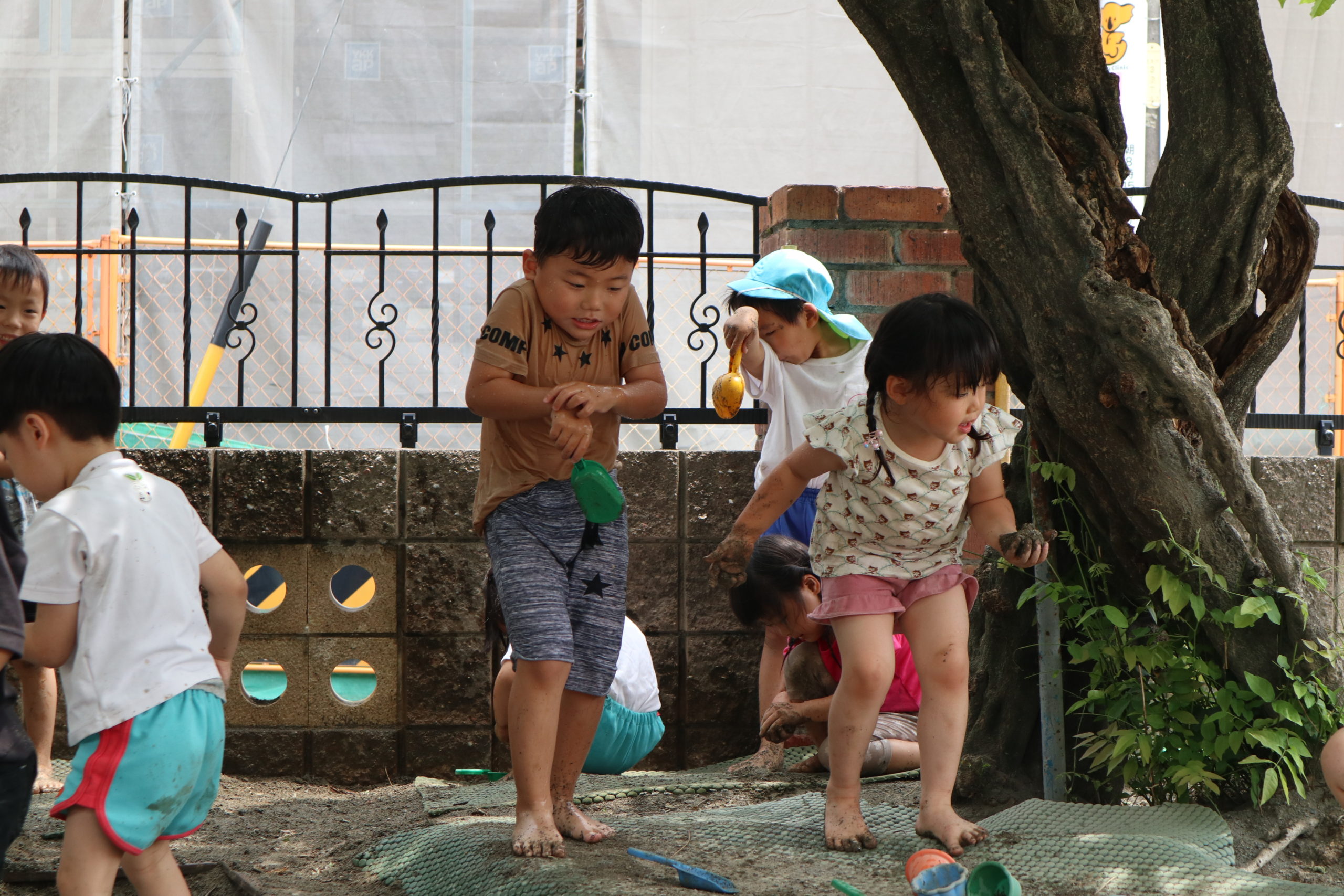 先生たちは感謝しています。泥んこ遊びが日常化しています。