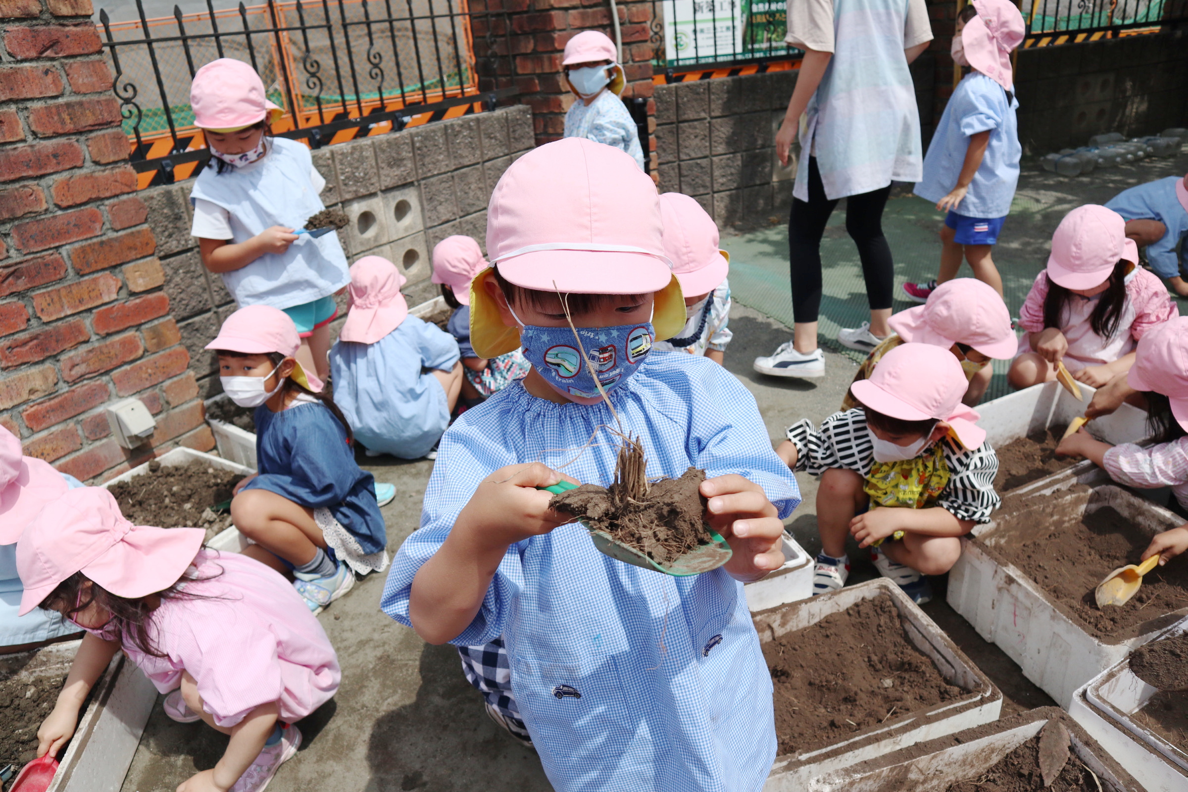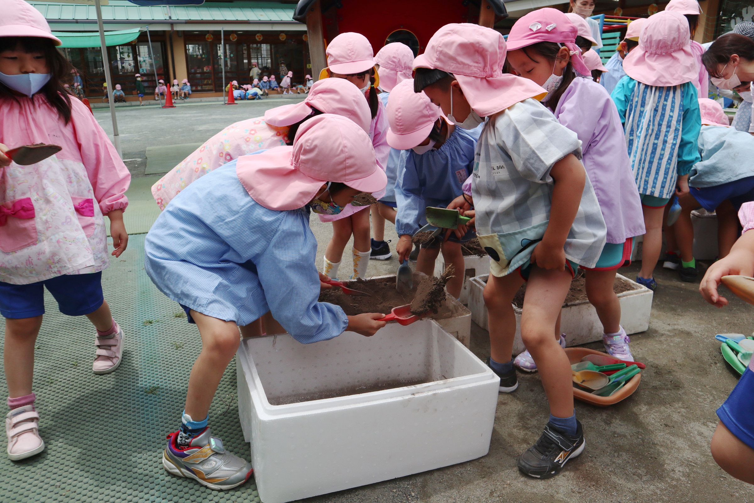 せっせと土を空の発泡スチロールに入れていきます。こちらは昨年の幼稚園の田んぼの土。「サラサラしているね。」風で飛び散らないようそうっと移し替えていたよ。