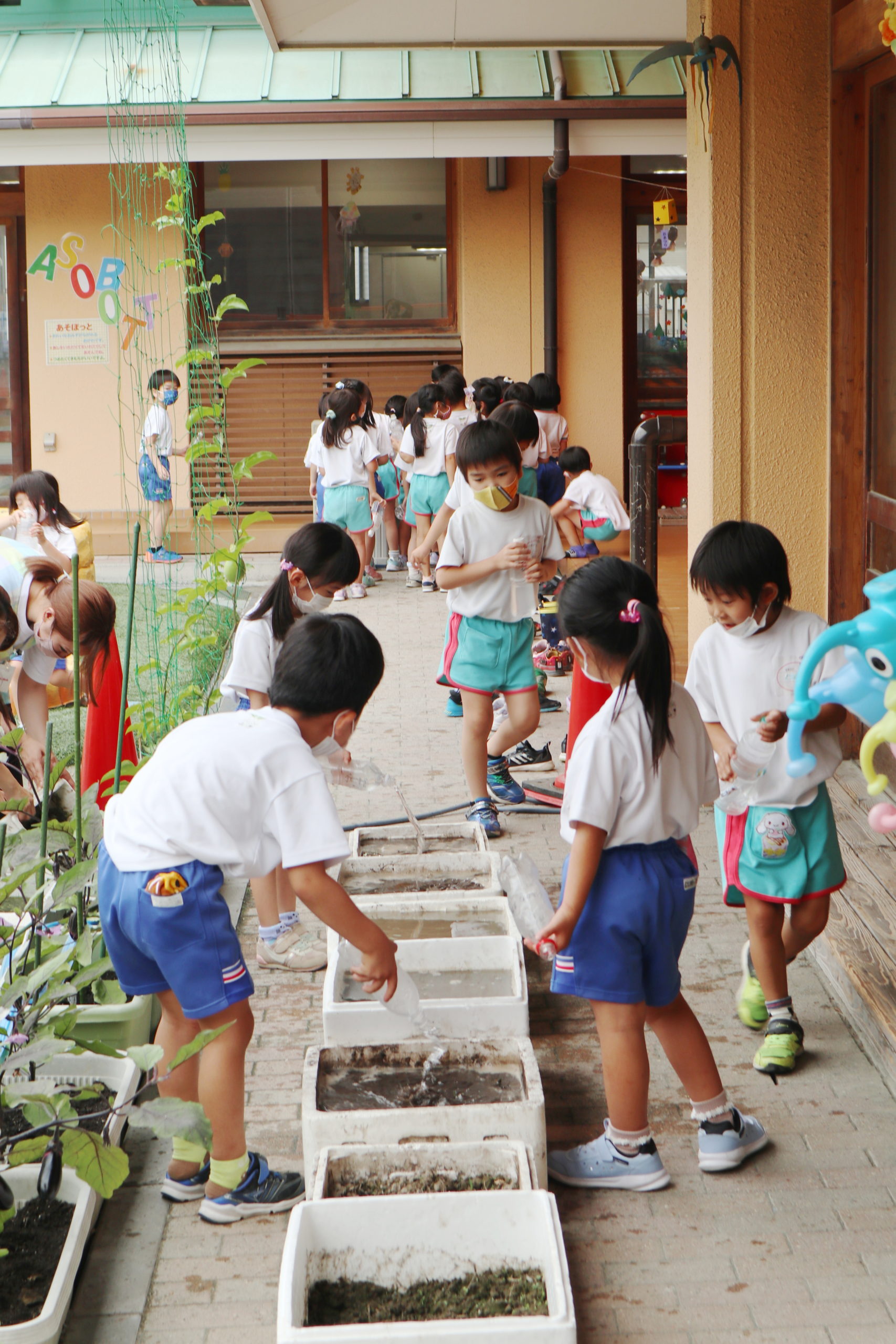 6月21日 マイペットボトルで何度も何度も汲みに行っては自分たちのグループのたんぼに水を入れました。