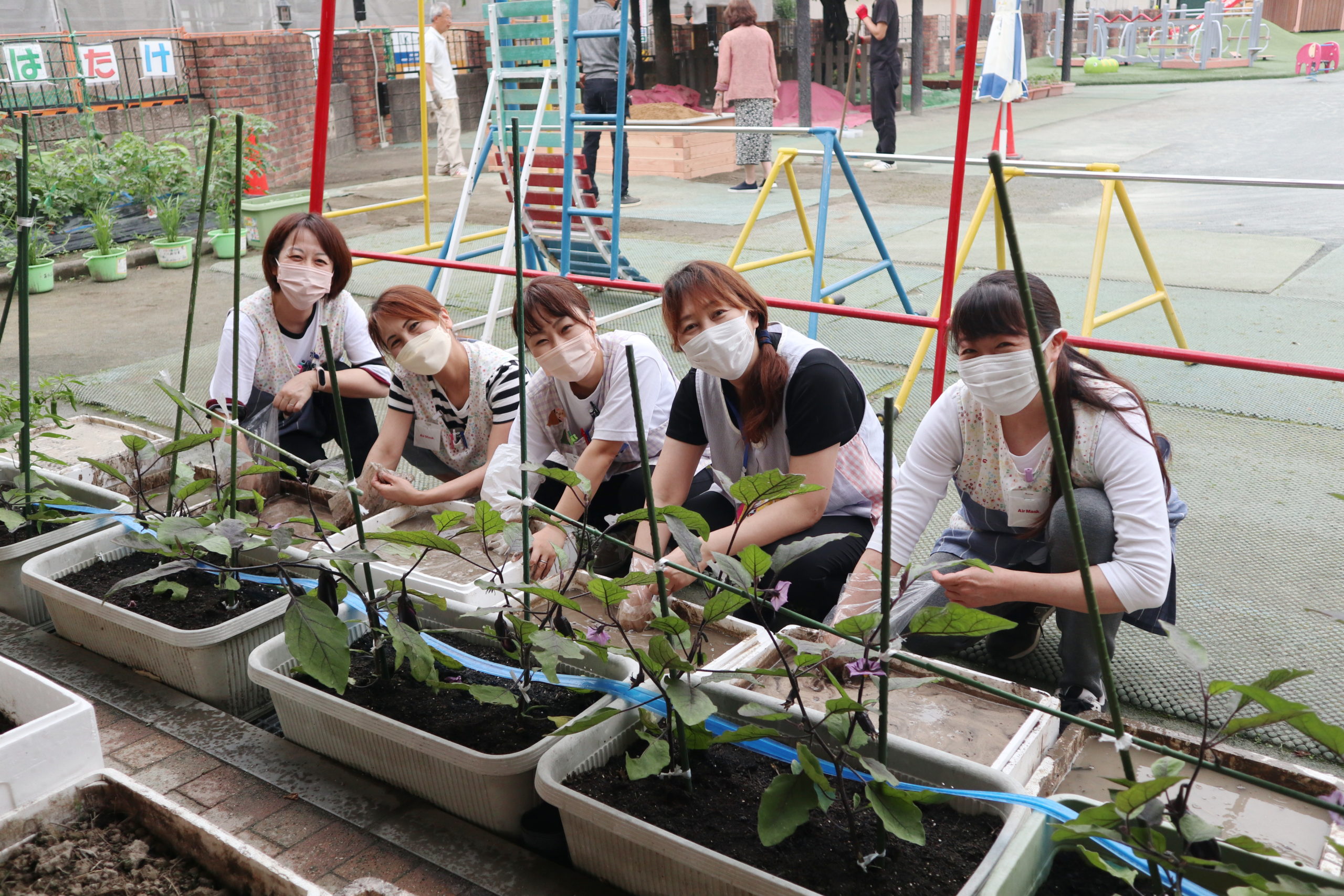その日の夕方JAの方に肥料を入れていただきました。先生たちも土と肥料をまぜましたよ。