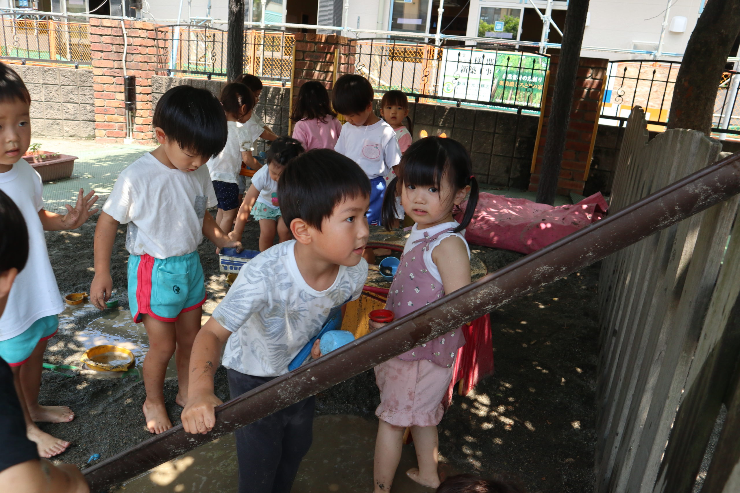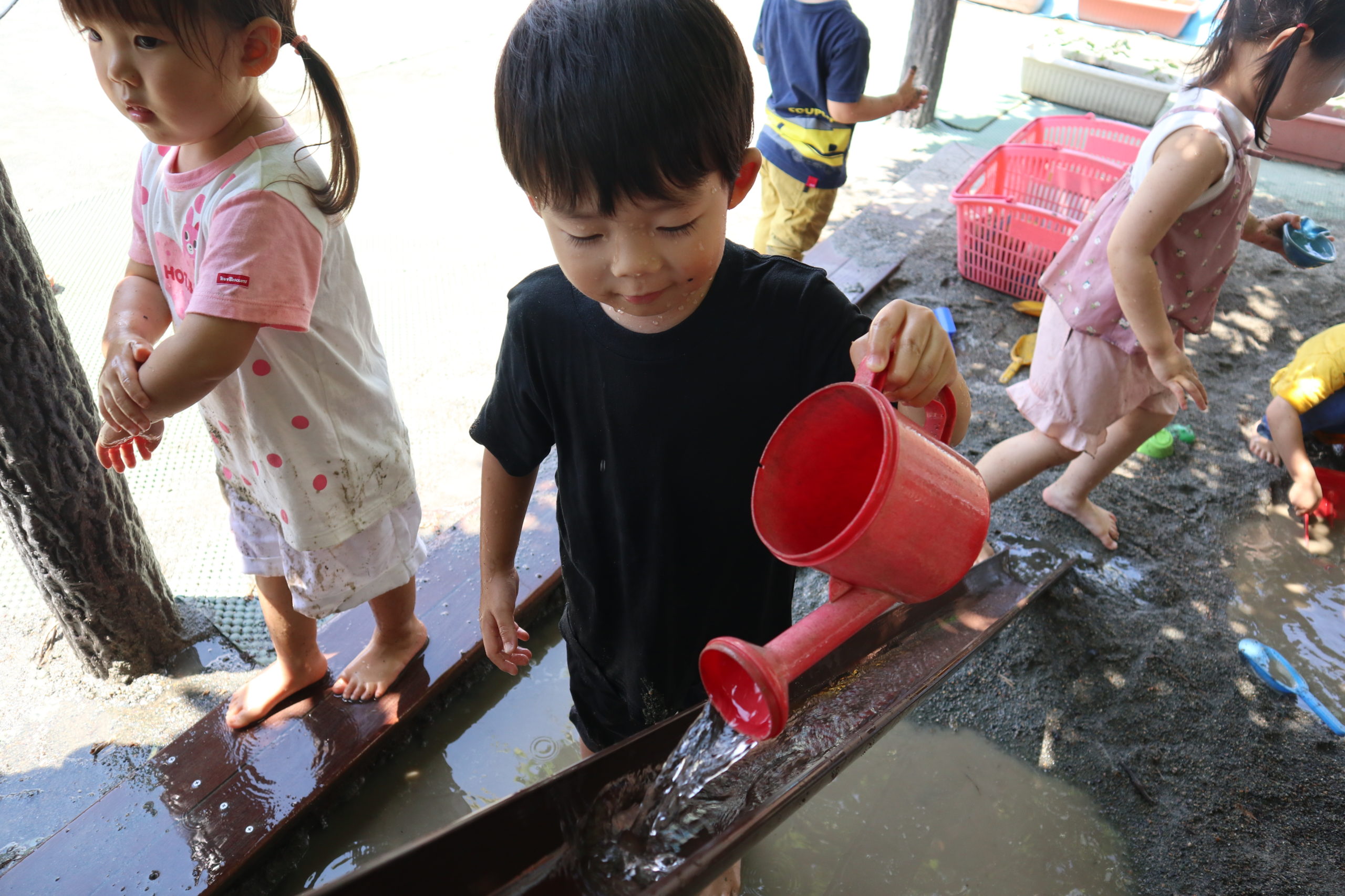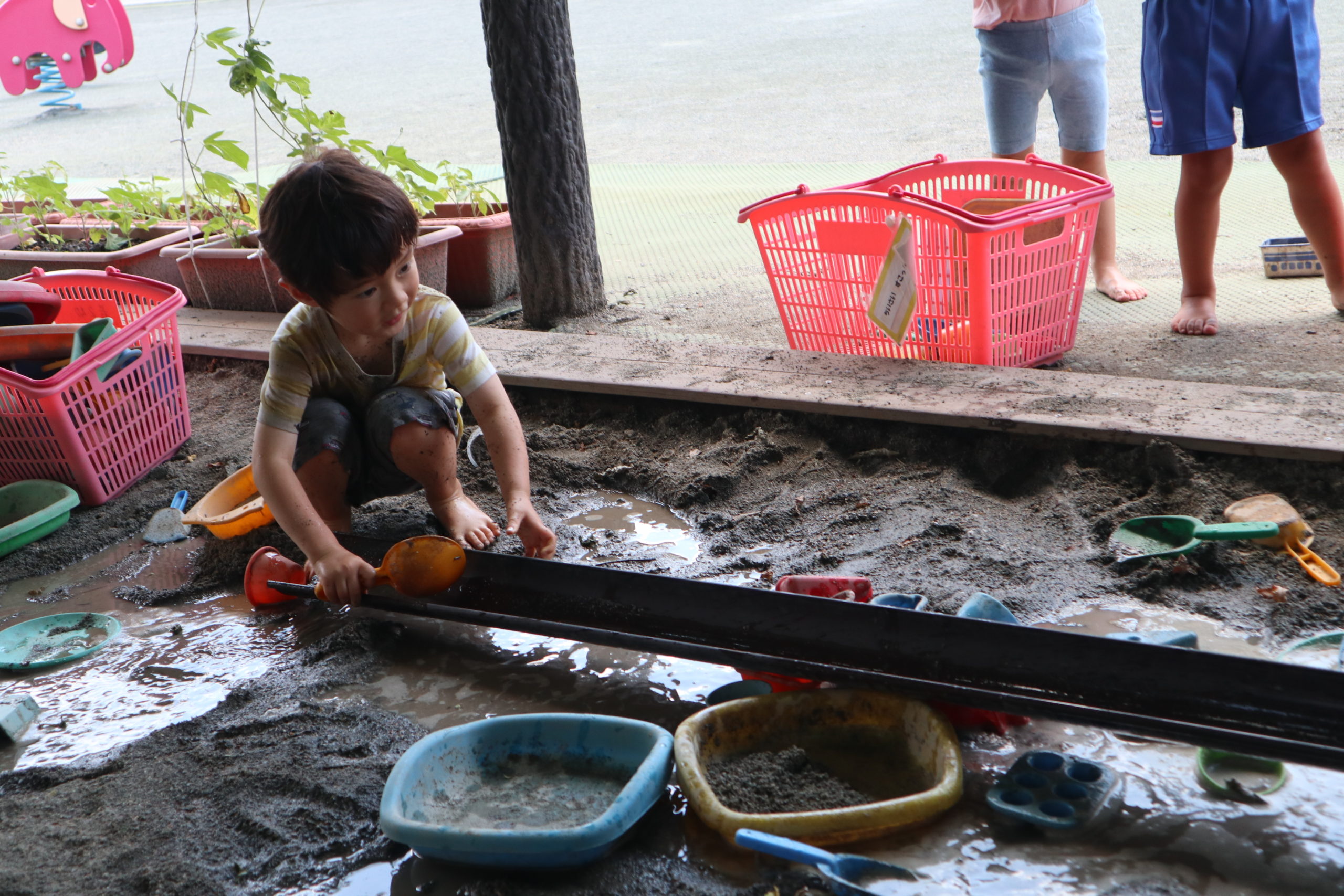 みんなで樋を囲んでお水が流れる様子を楽しみました。砂を入れてお水と一緒に流れるのを喜んでいましたよ。
