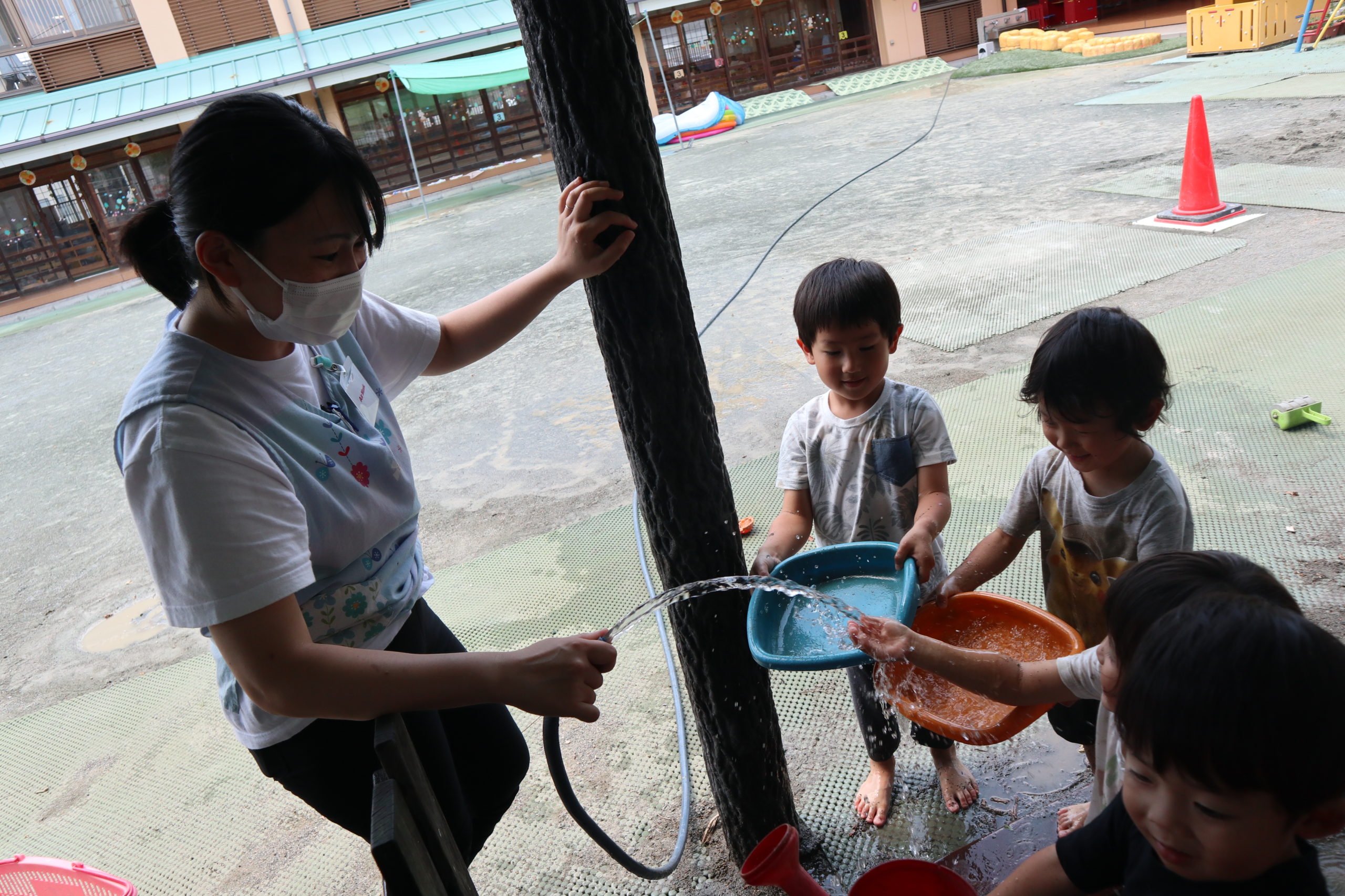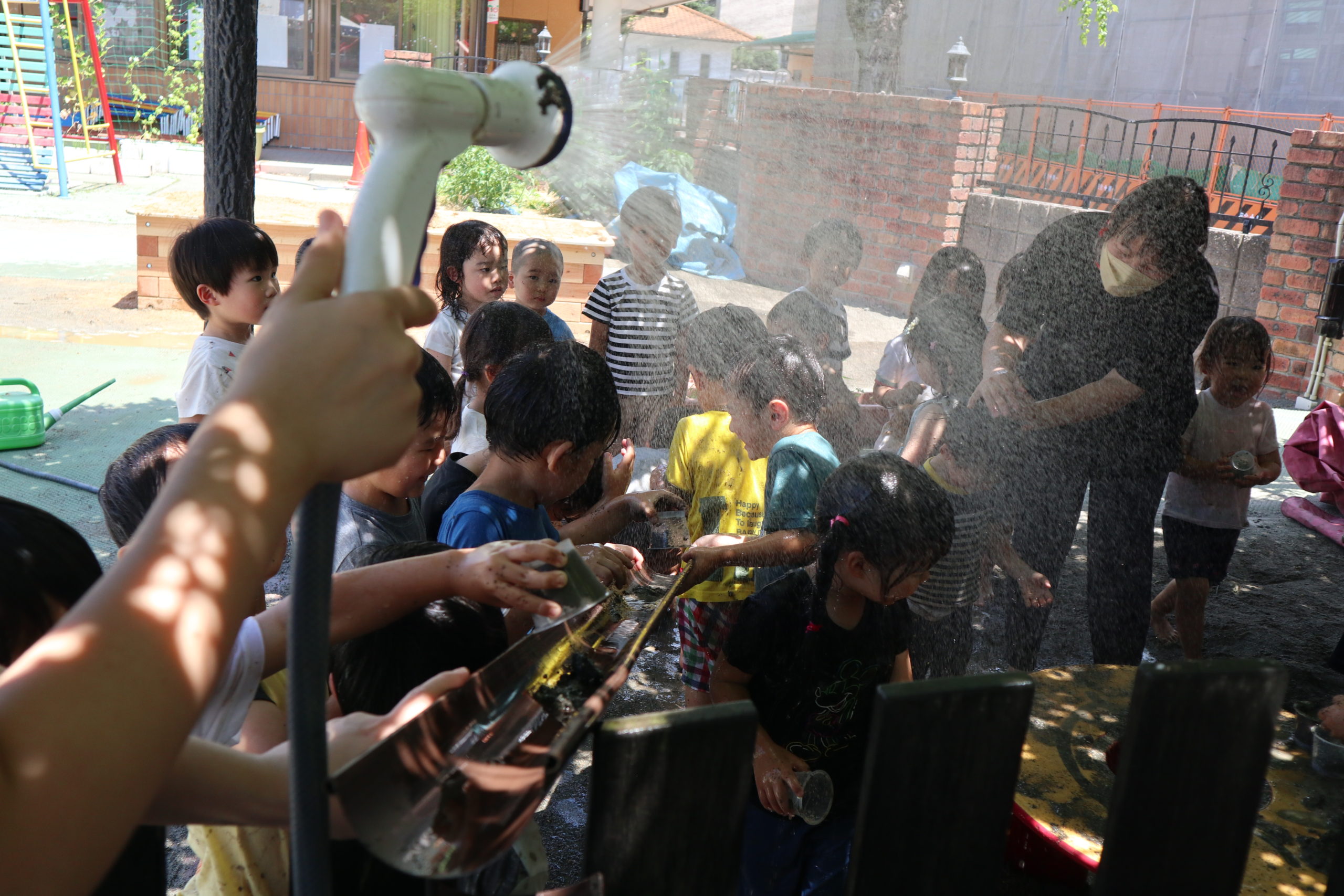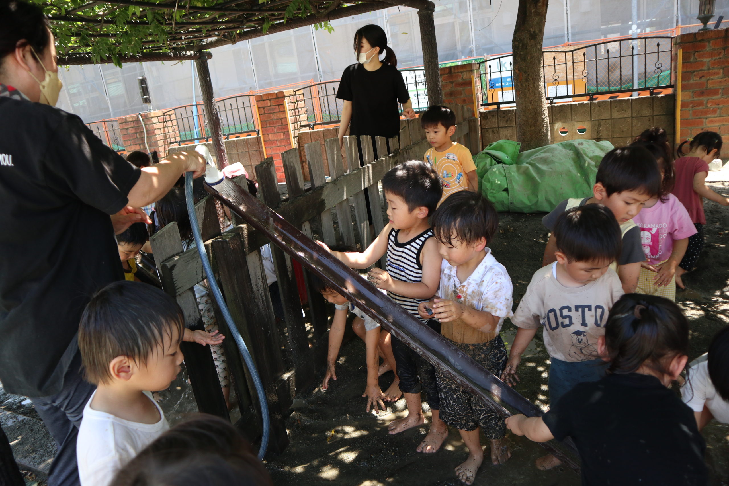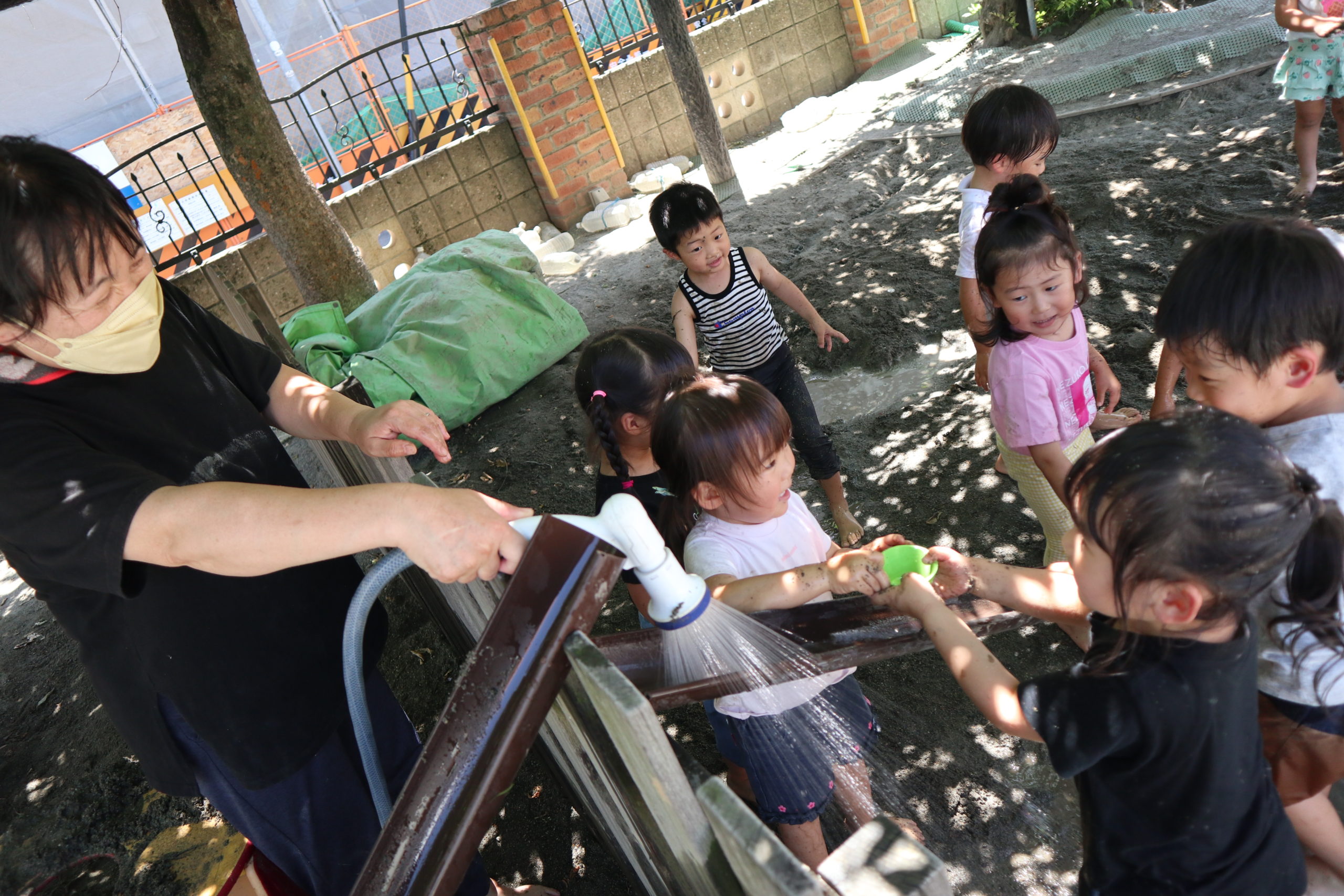 みんなで樋を囲んでお水が流れる様子を楽しみました。砂を入れてお水と一緒に流れるのを喜んでいましたよ。