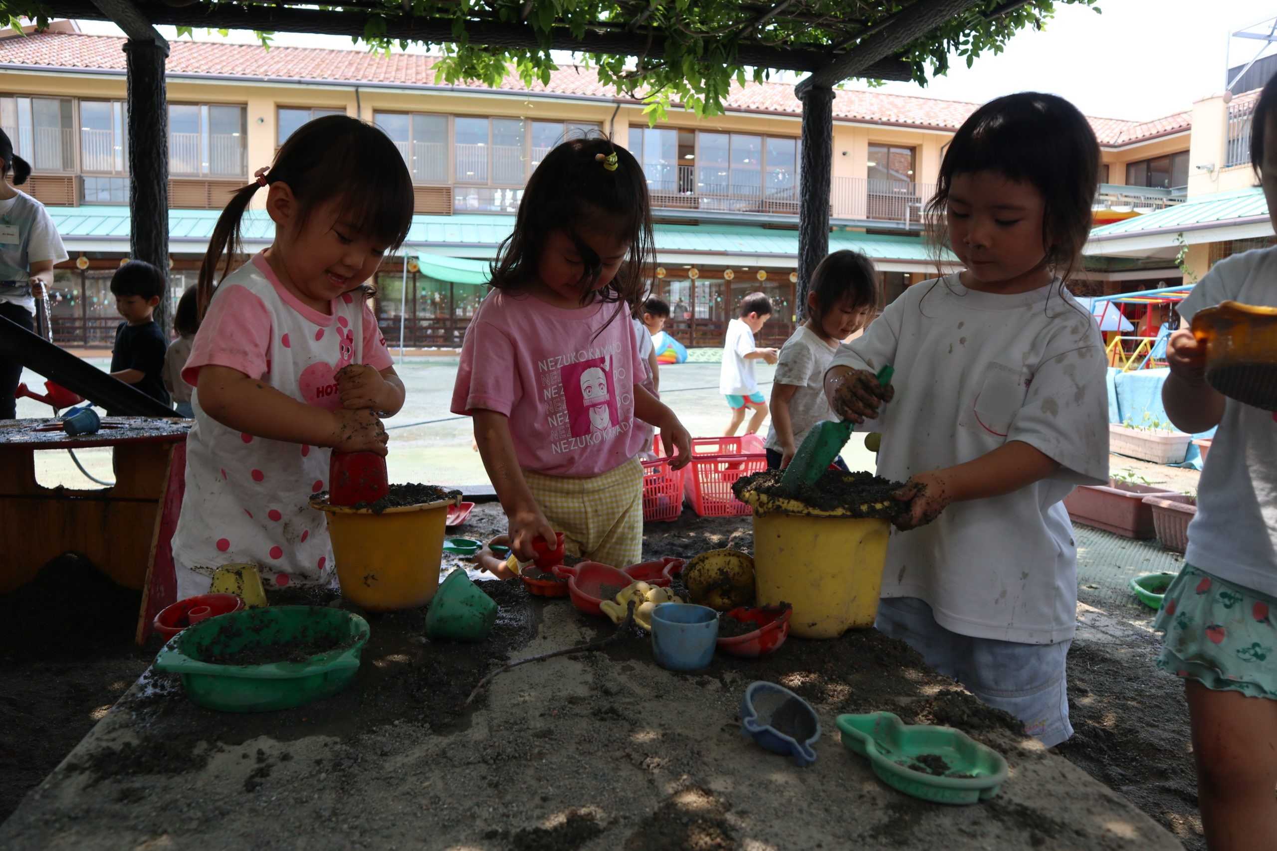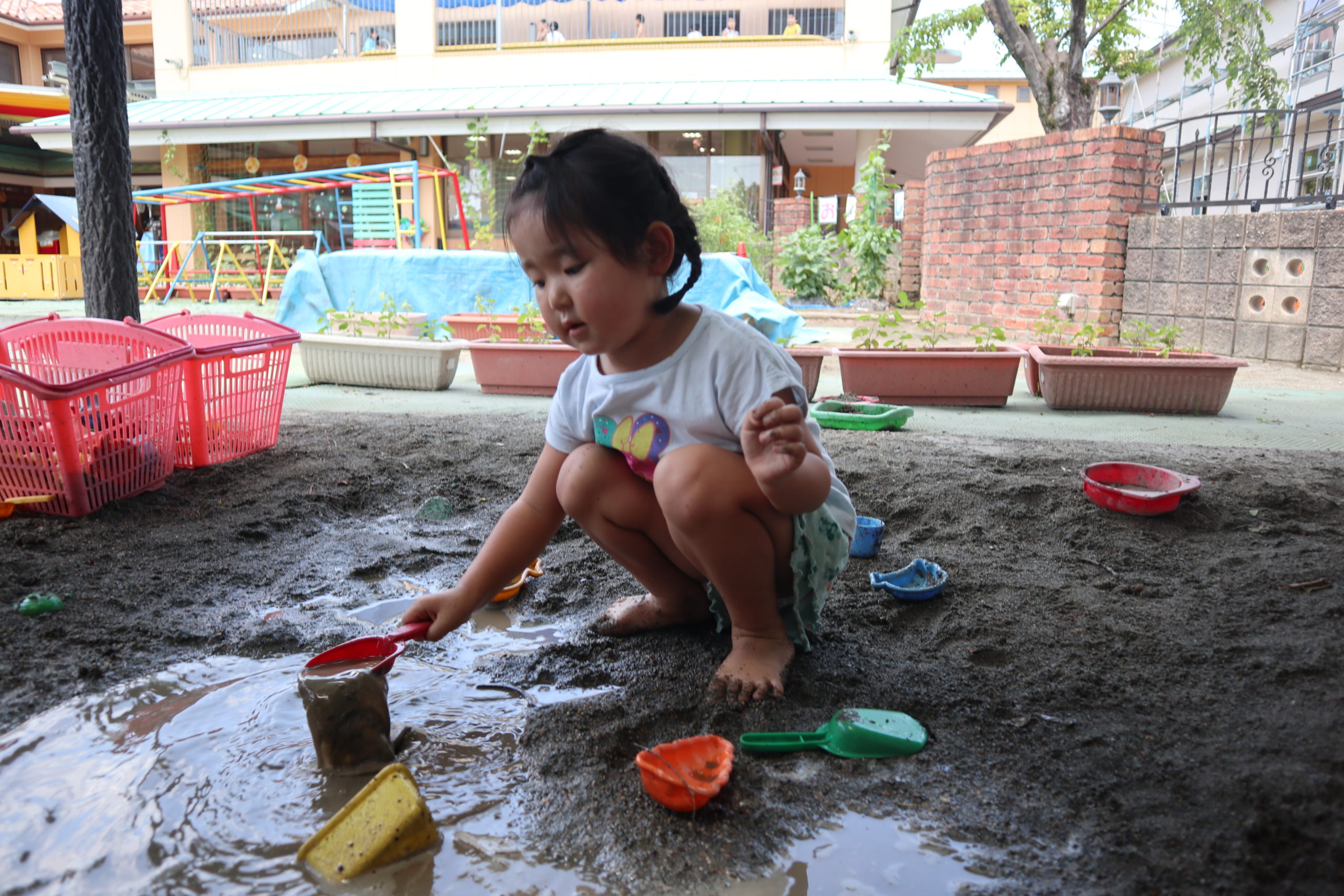 乾いた土の硬い感触を味わったり、お水のかけ具合でやわらかくなったり、とろとろの液状になったり、いろいろな状態になる土を楽しみながらあそんでいます。