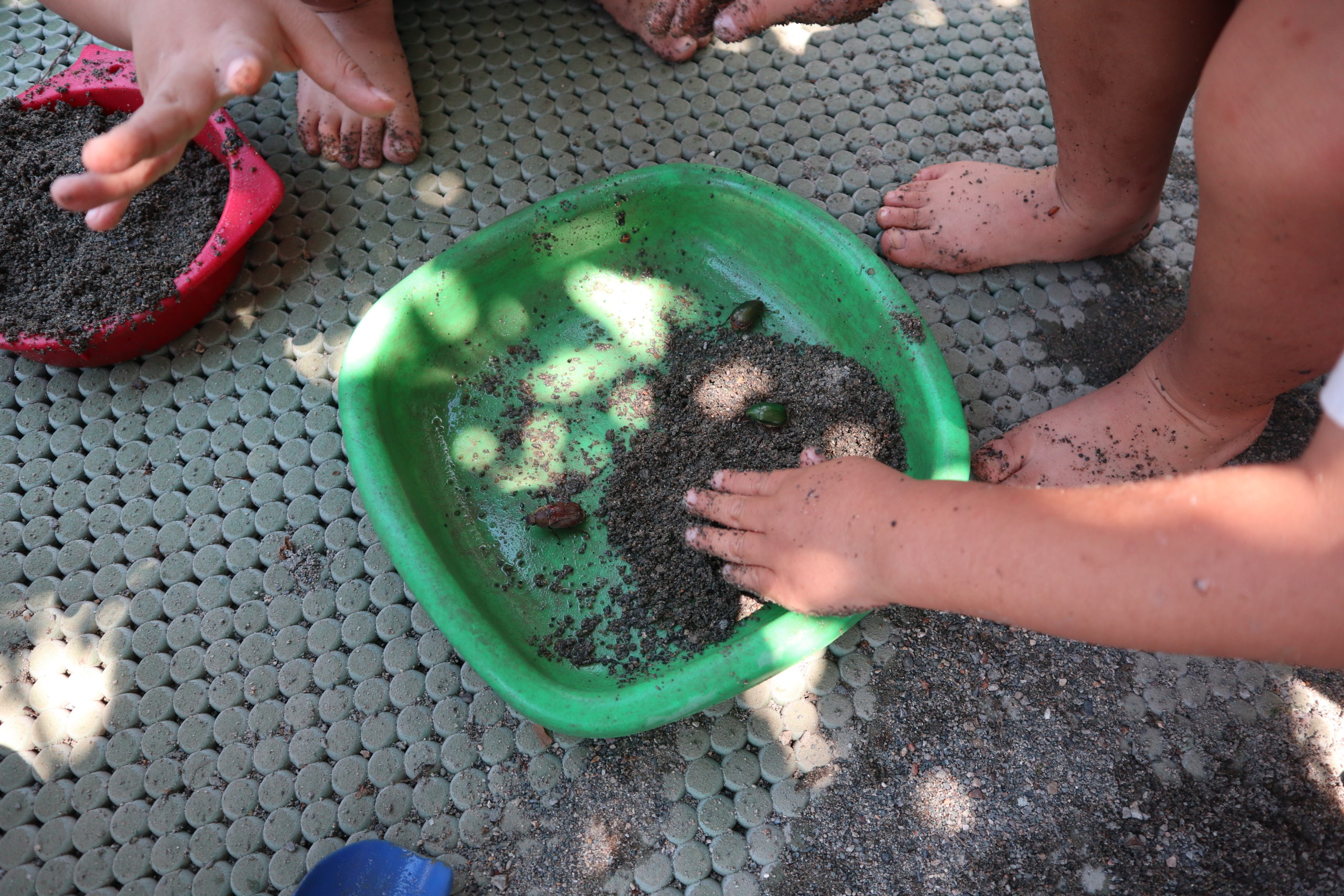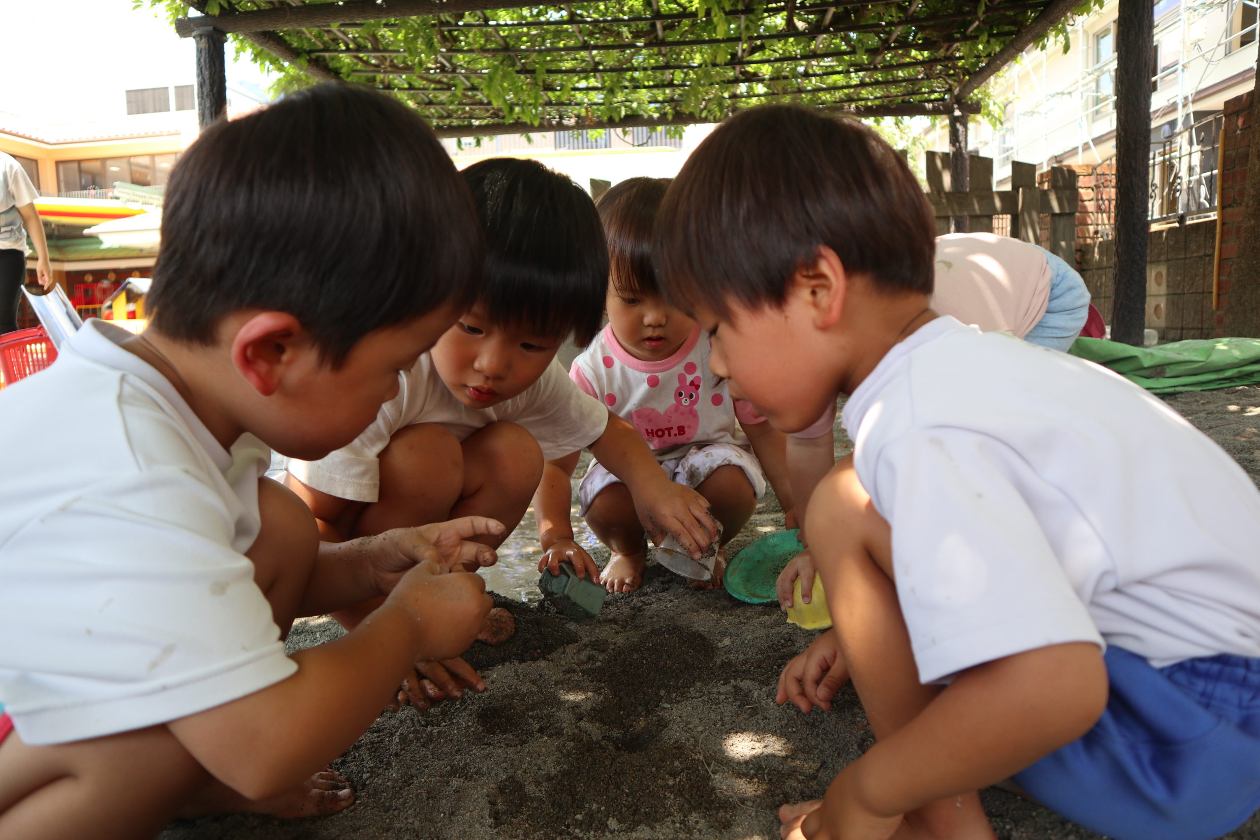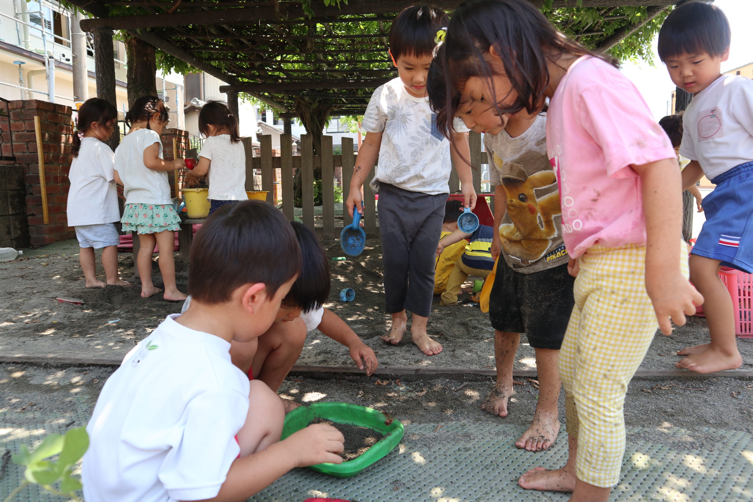 「中には何が入ってるか?」「はっぱかな?」「ぶぶー、ちがうよ。」会話を楽しみながらよいしょよいしょと砂をかき出していたね。