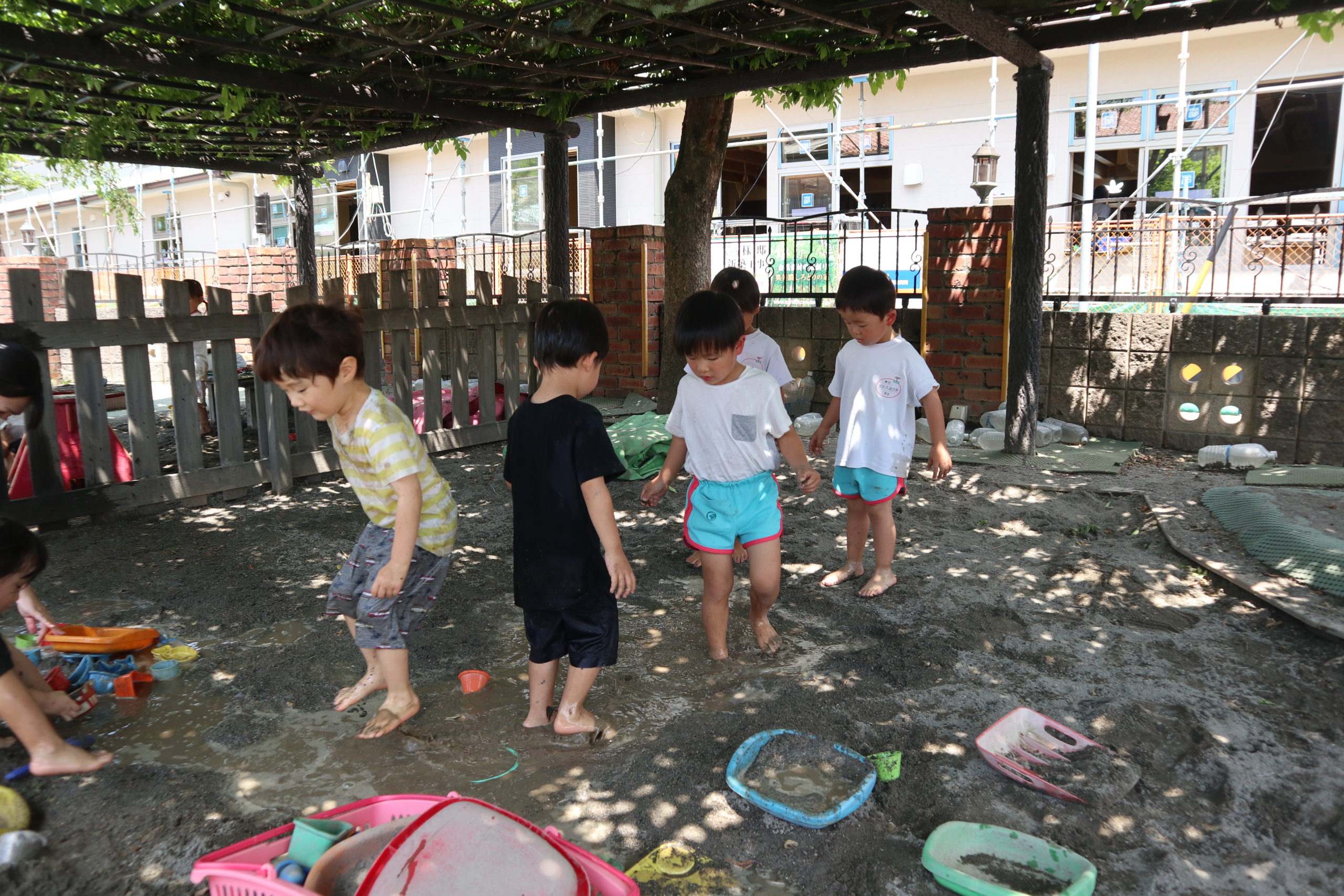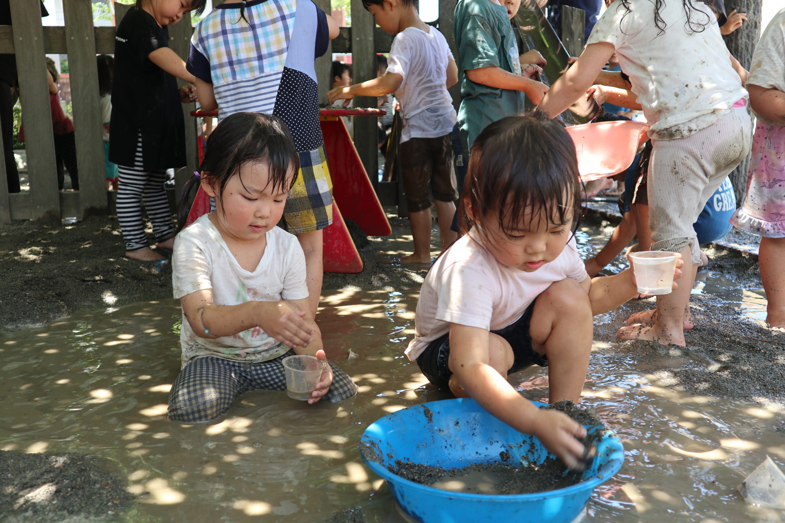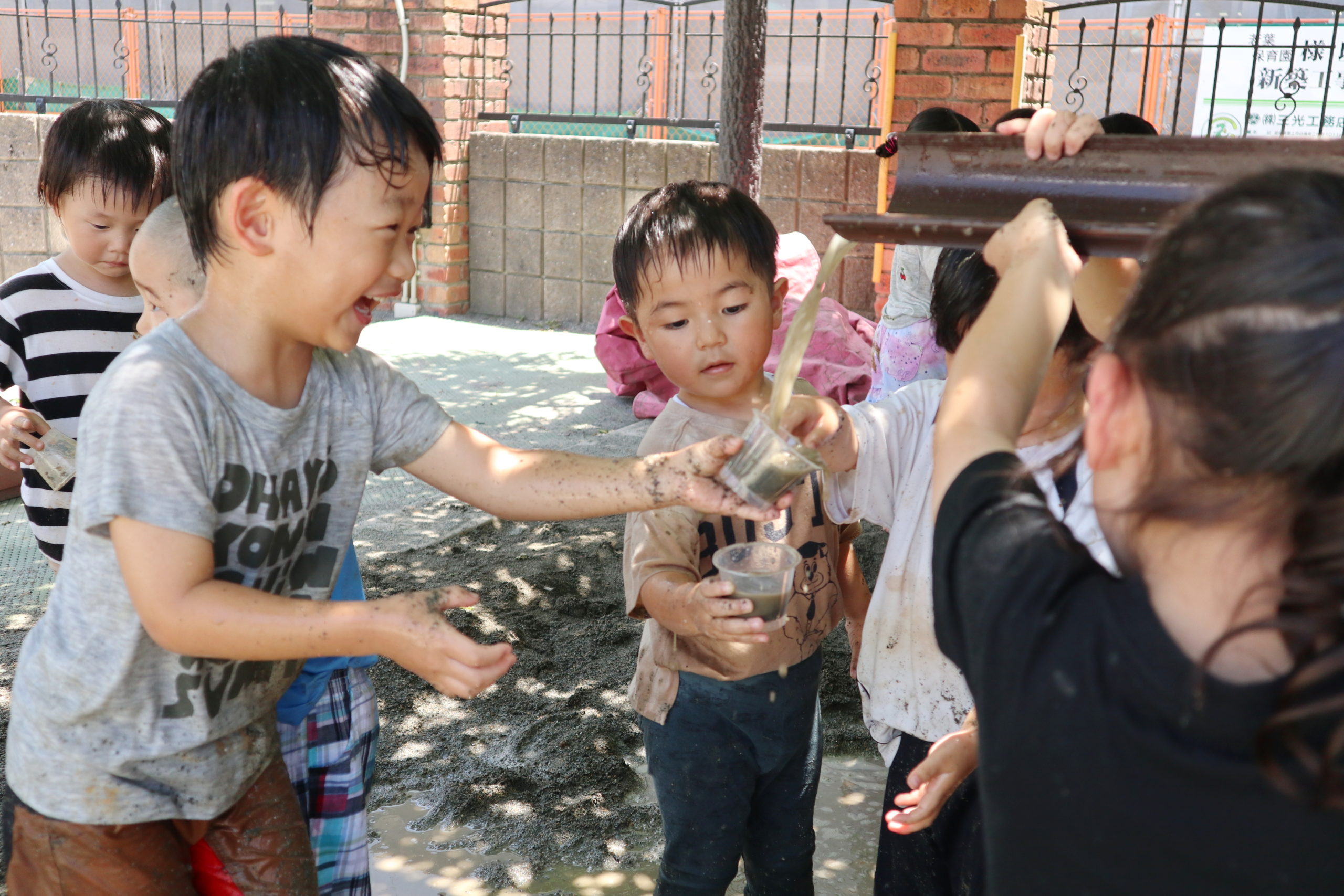 水が流れてできた大きな海。わたしも入ろうっと。どろ水やどろんこをすくったり器に入れたり、夢中になって遊んでいたよ。