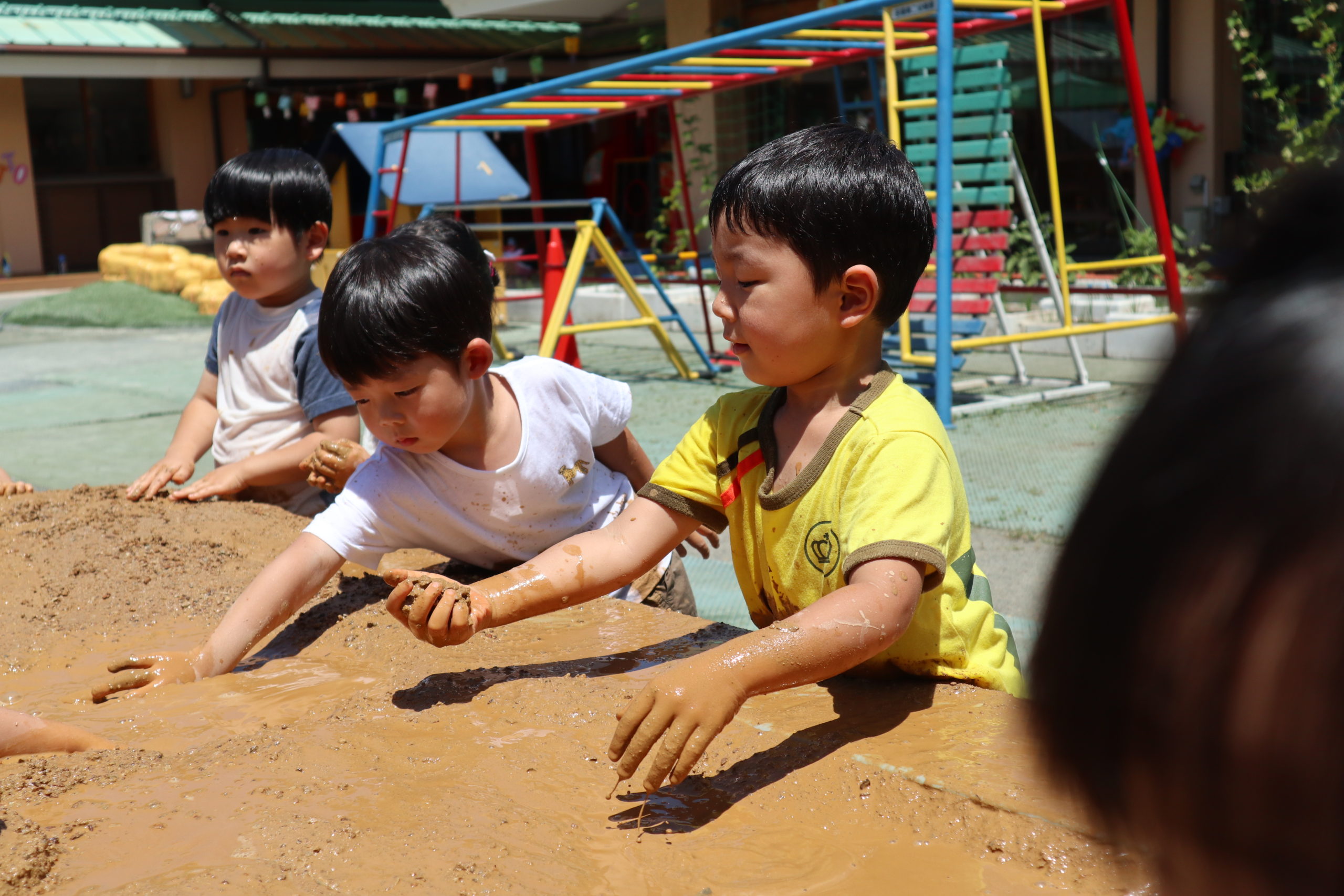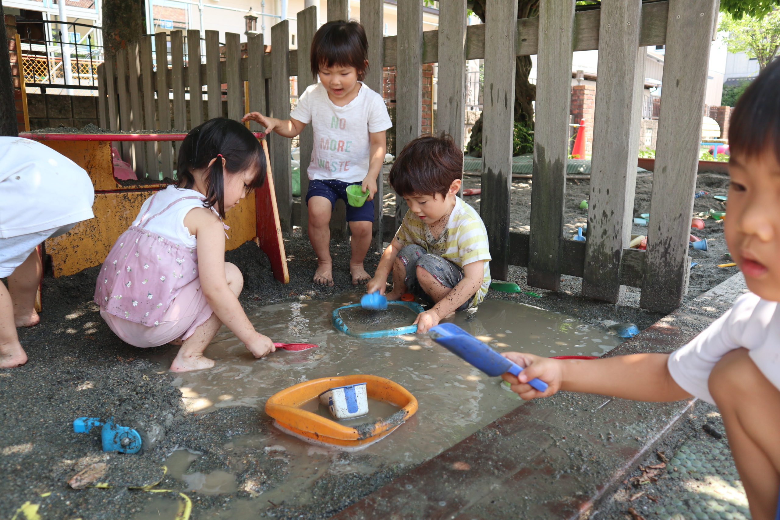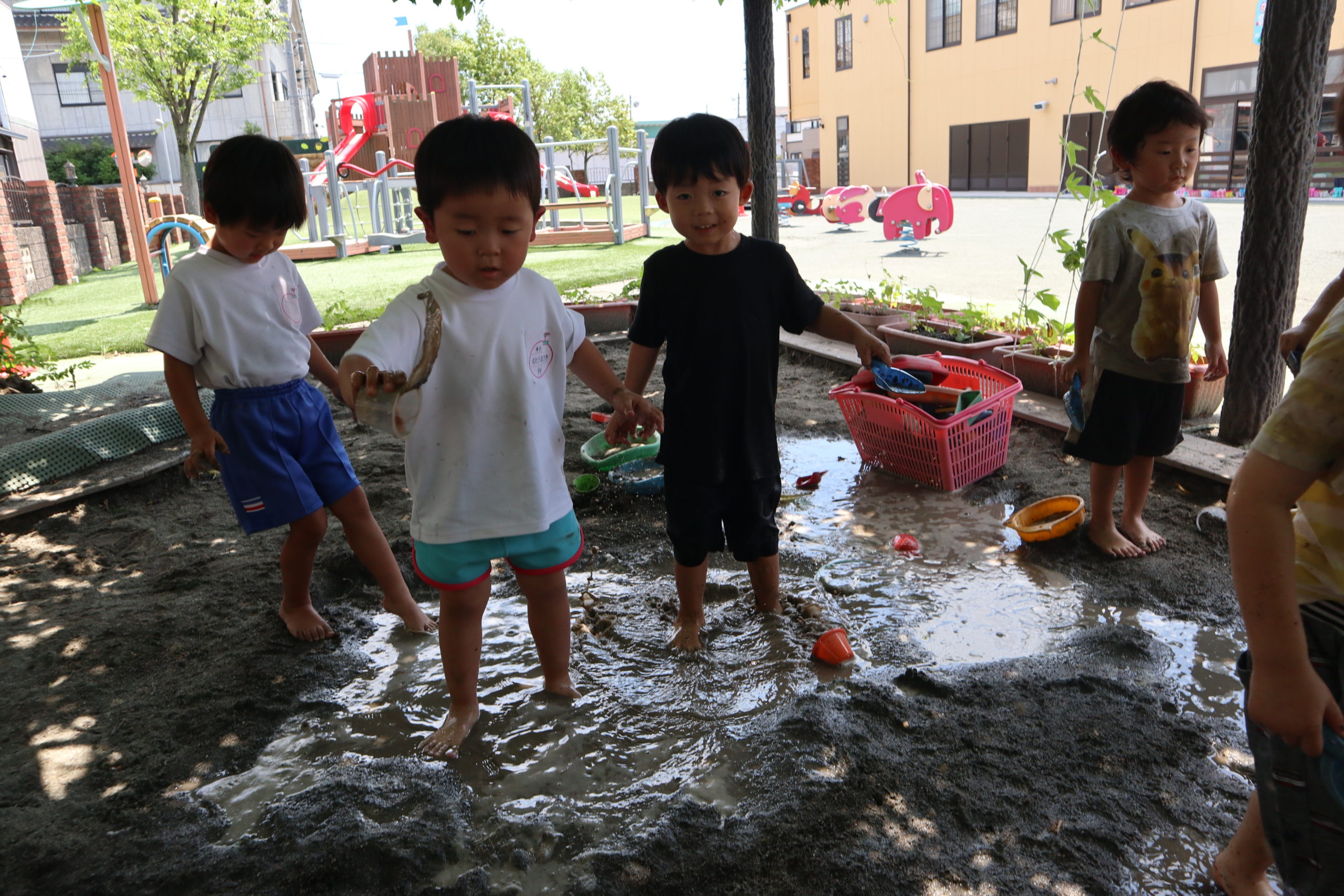 水が流れてできた大きな海。わたしも入ろうっと。どろ水やどろんこをすくったり器に入れたり、夢中になって遊んでいたよ。