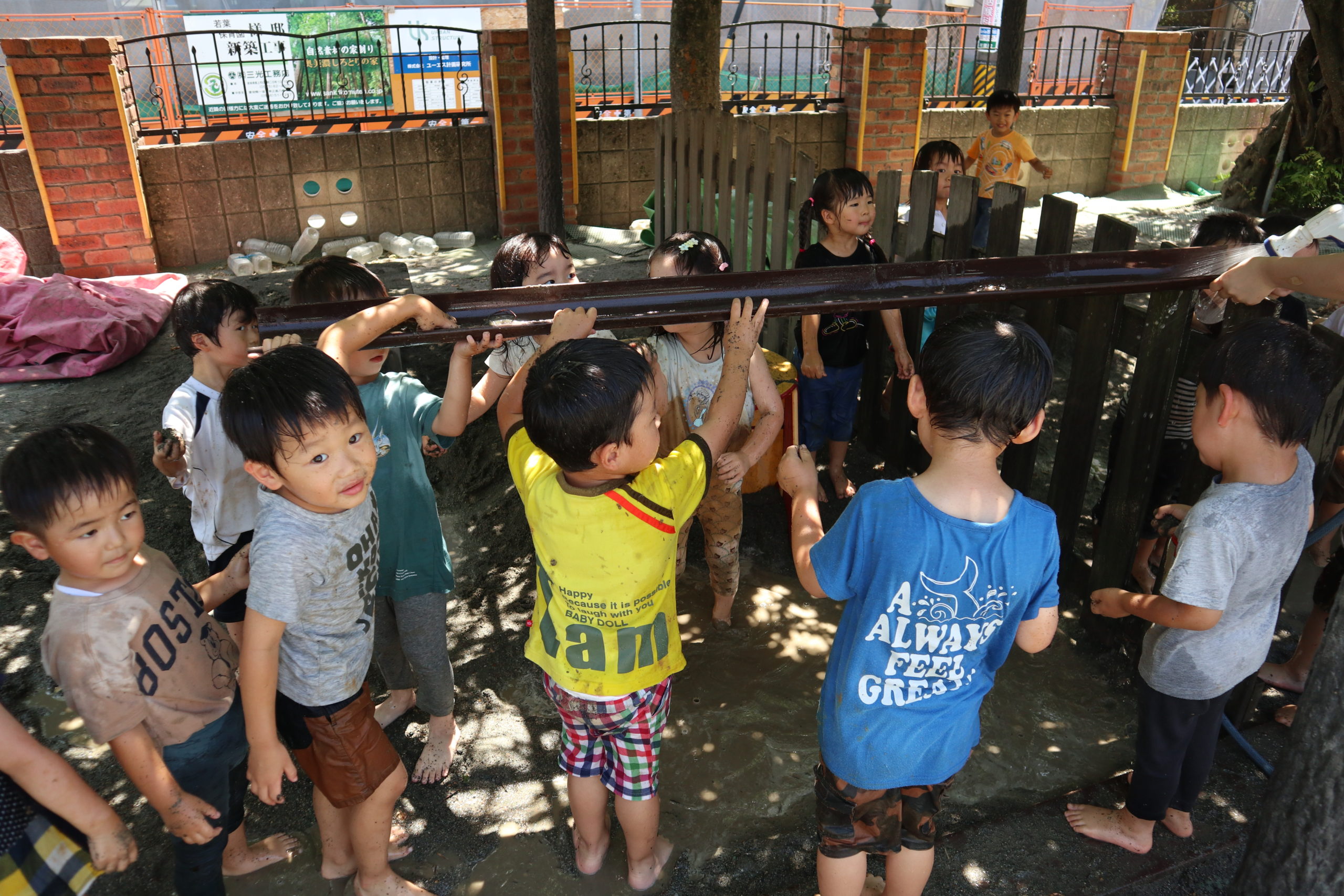 年少組さんも樋を持ち上げたり、角度を変えてみたりといろいろな工夫をして遊んでいる姿がありました。