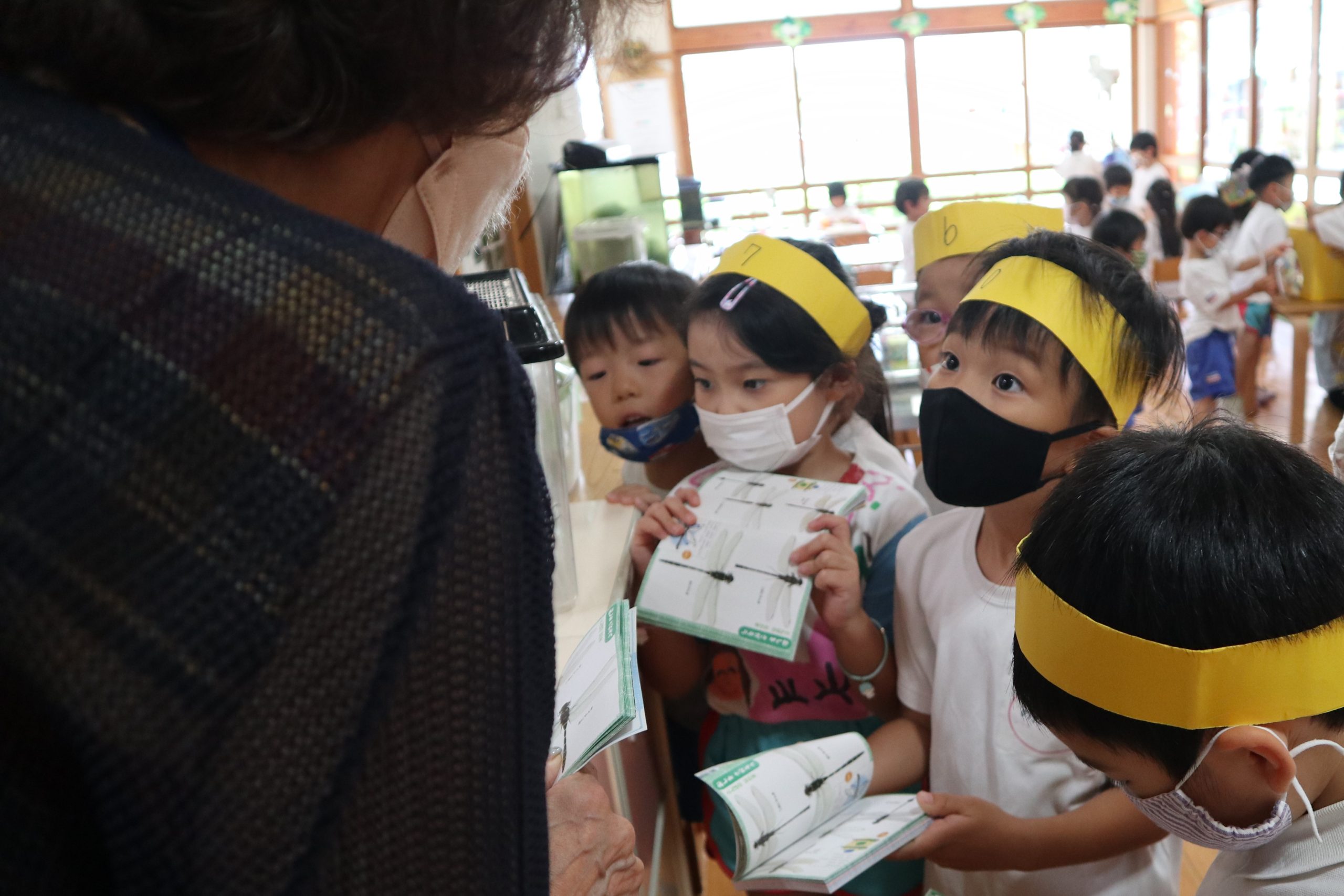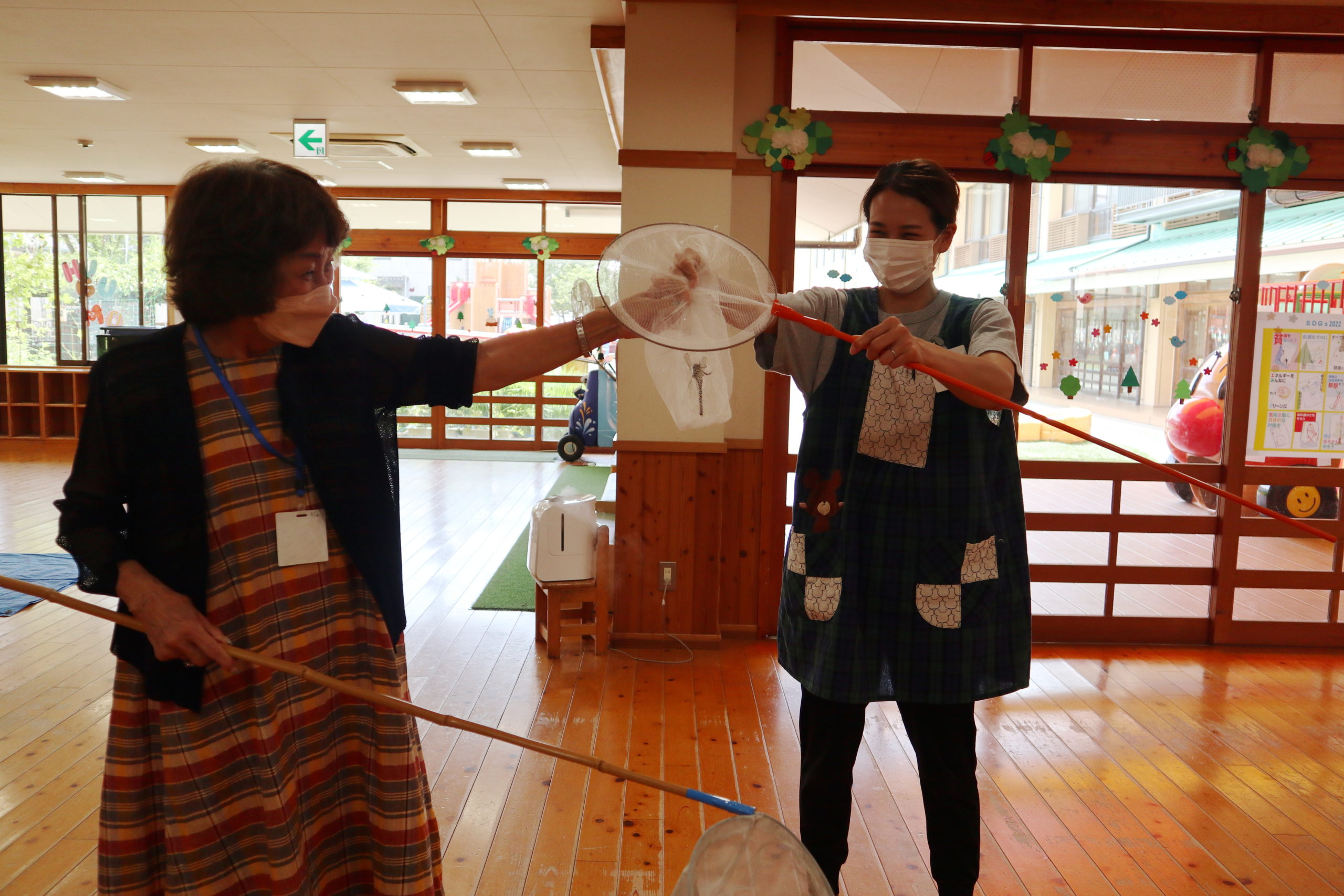まきこ先生が「どうやってオニヤンマを捕まえたのですか?」と尋ねると、園長先生が「むみ先生と一緒にたもでエイッと捕まえたよ。」と教えてくれました。