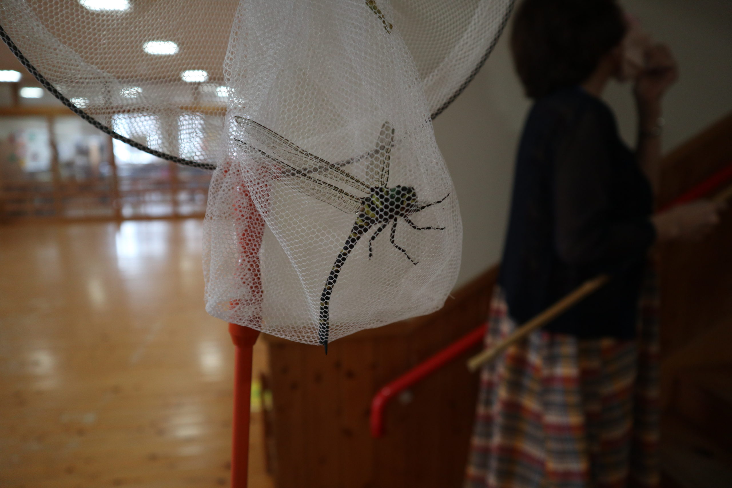 8月24日 突然幼稚園にあるお客さんが遊びに来ました。誰かといえば・・・。早速園長先生とむみ先生と二人でたもでゲットしたのはなんと大きなとんぼ!!