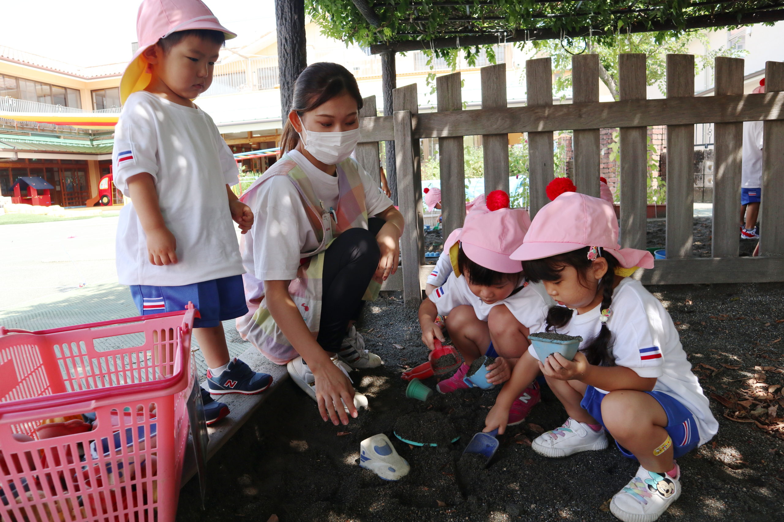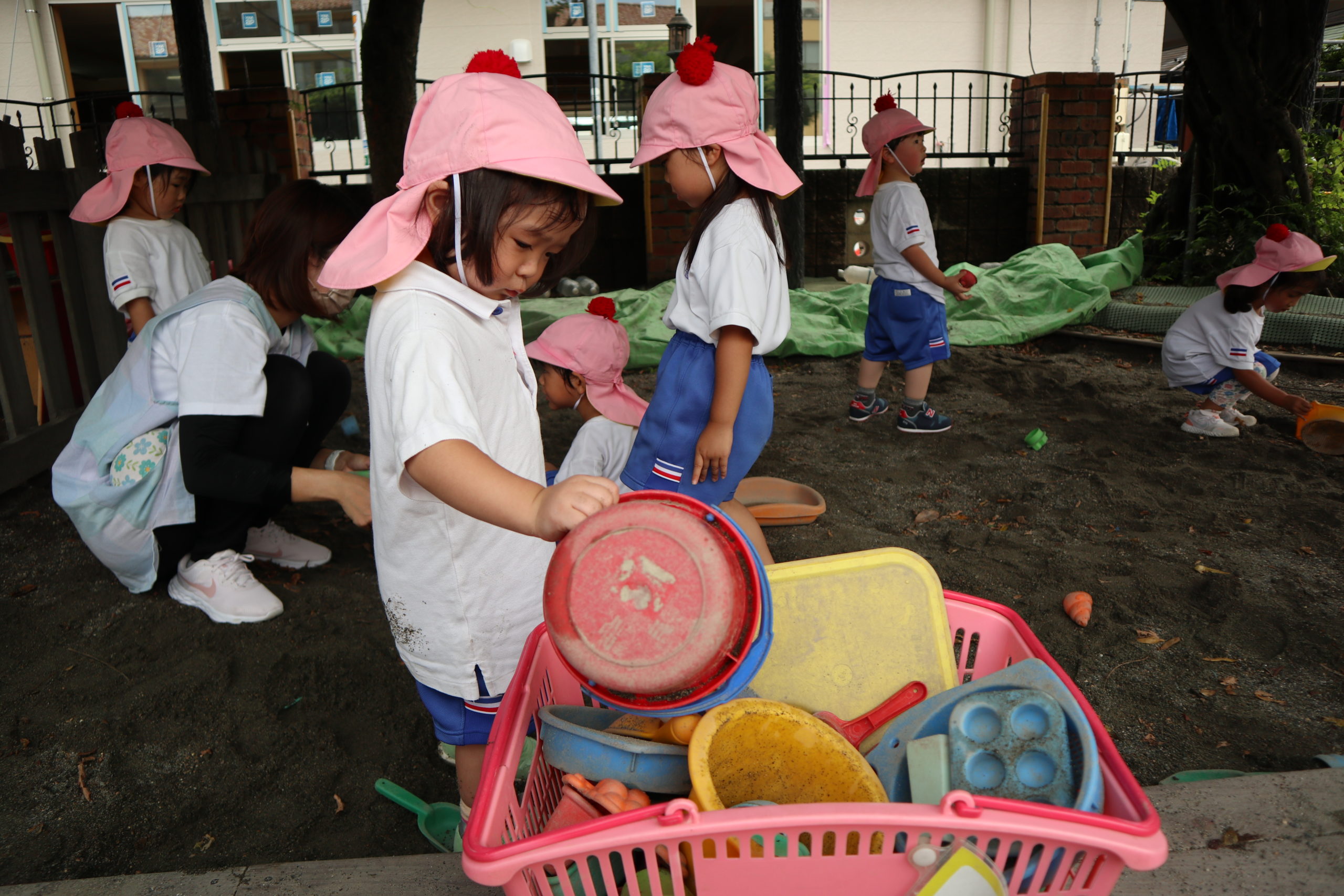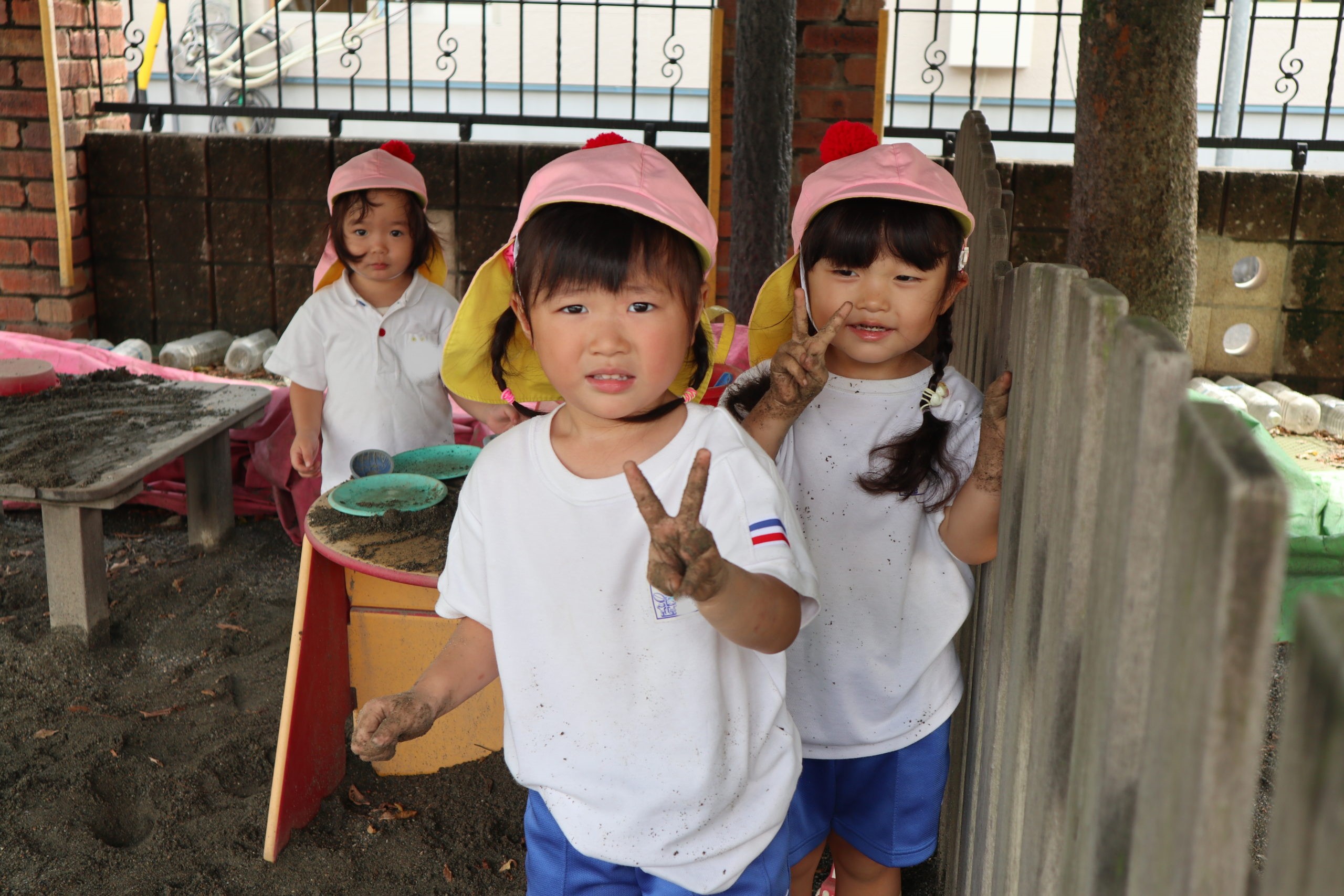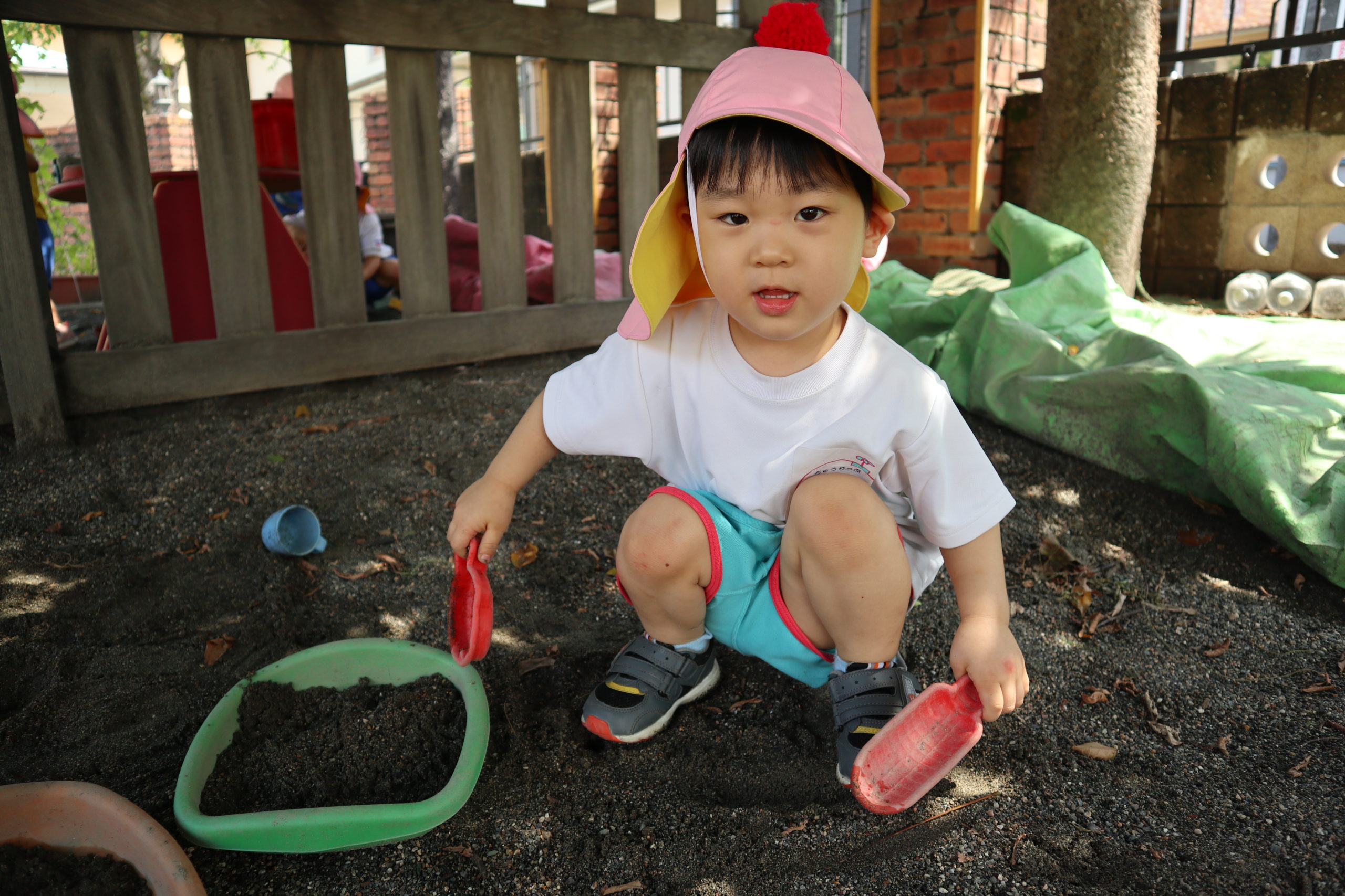 今日もちゅうりっぷさん、外で元気に遊んでいるよ。おもちゃにシャベルで砂を入れてはパンパンパン。おともだちと肩を並べて夢中だね。