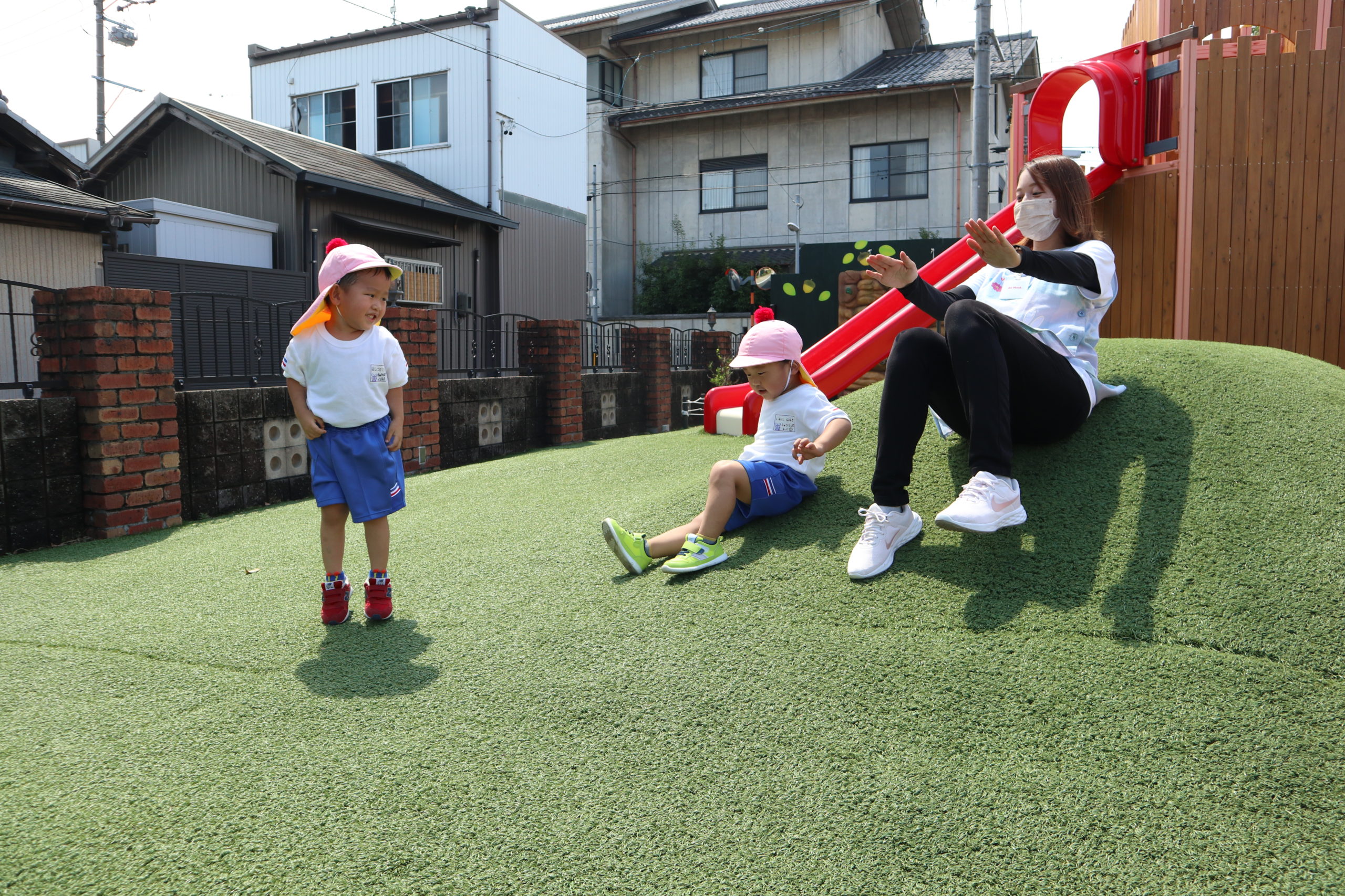 お山でかえで先生と一緒に滑り台。