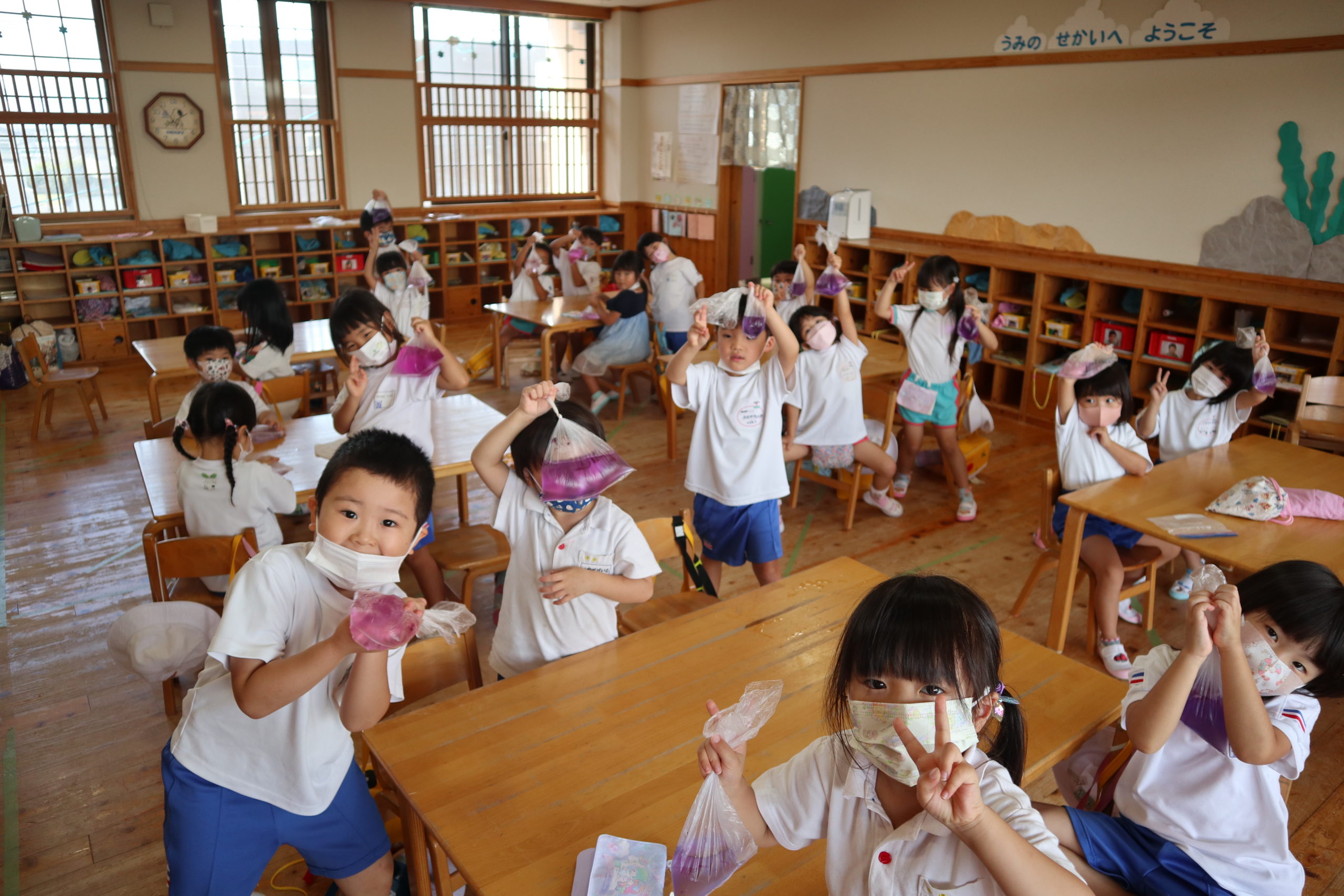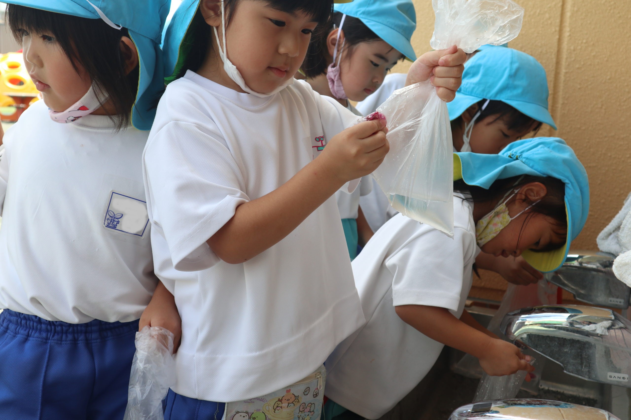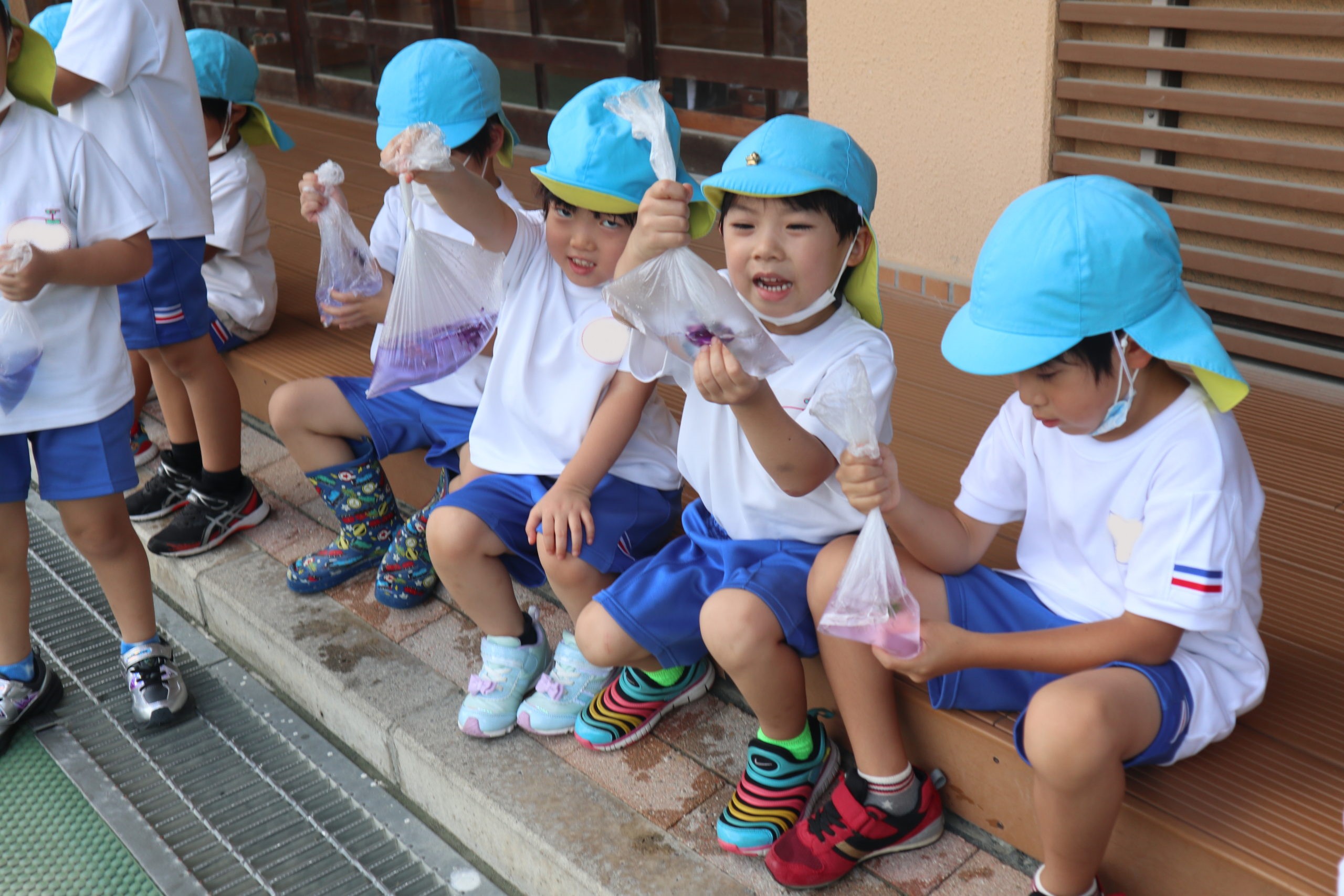ビニール袋の中の水が少しずつ変化していくことにドキドキしながらみんながきれいな朝顔の色水を作ることができました。