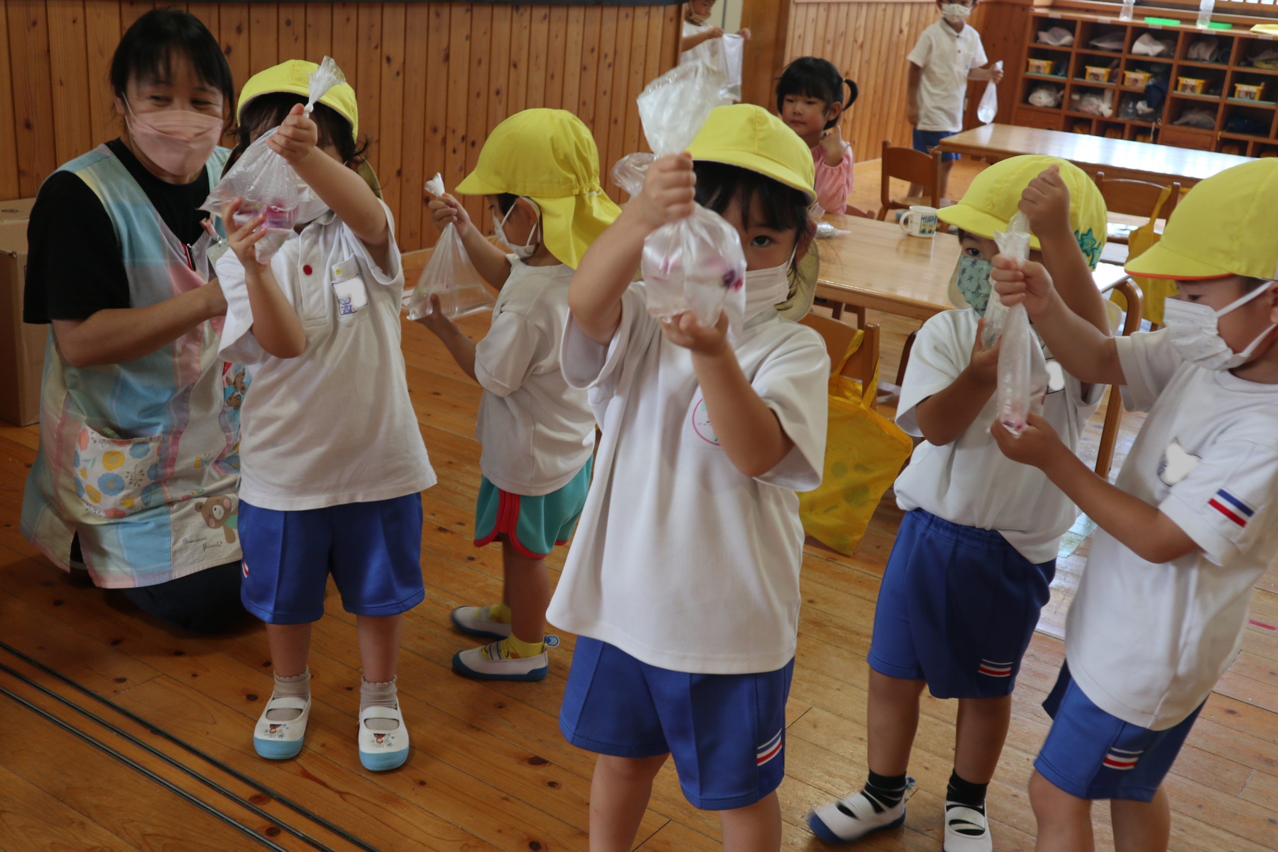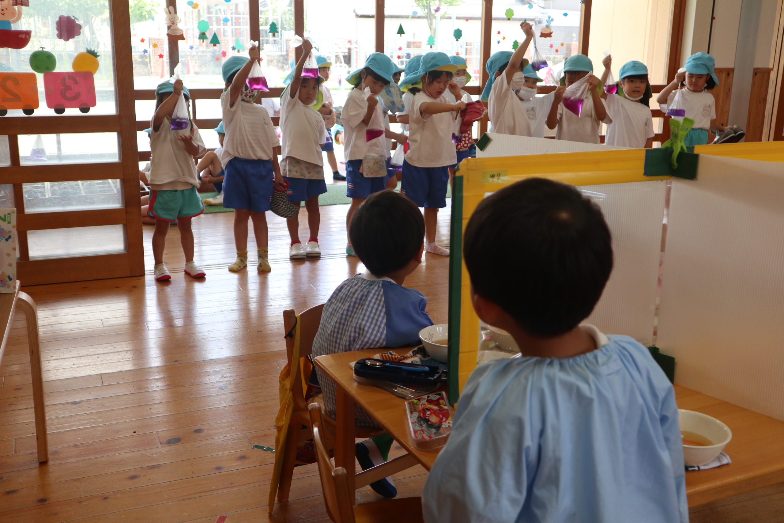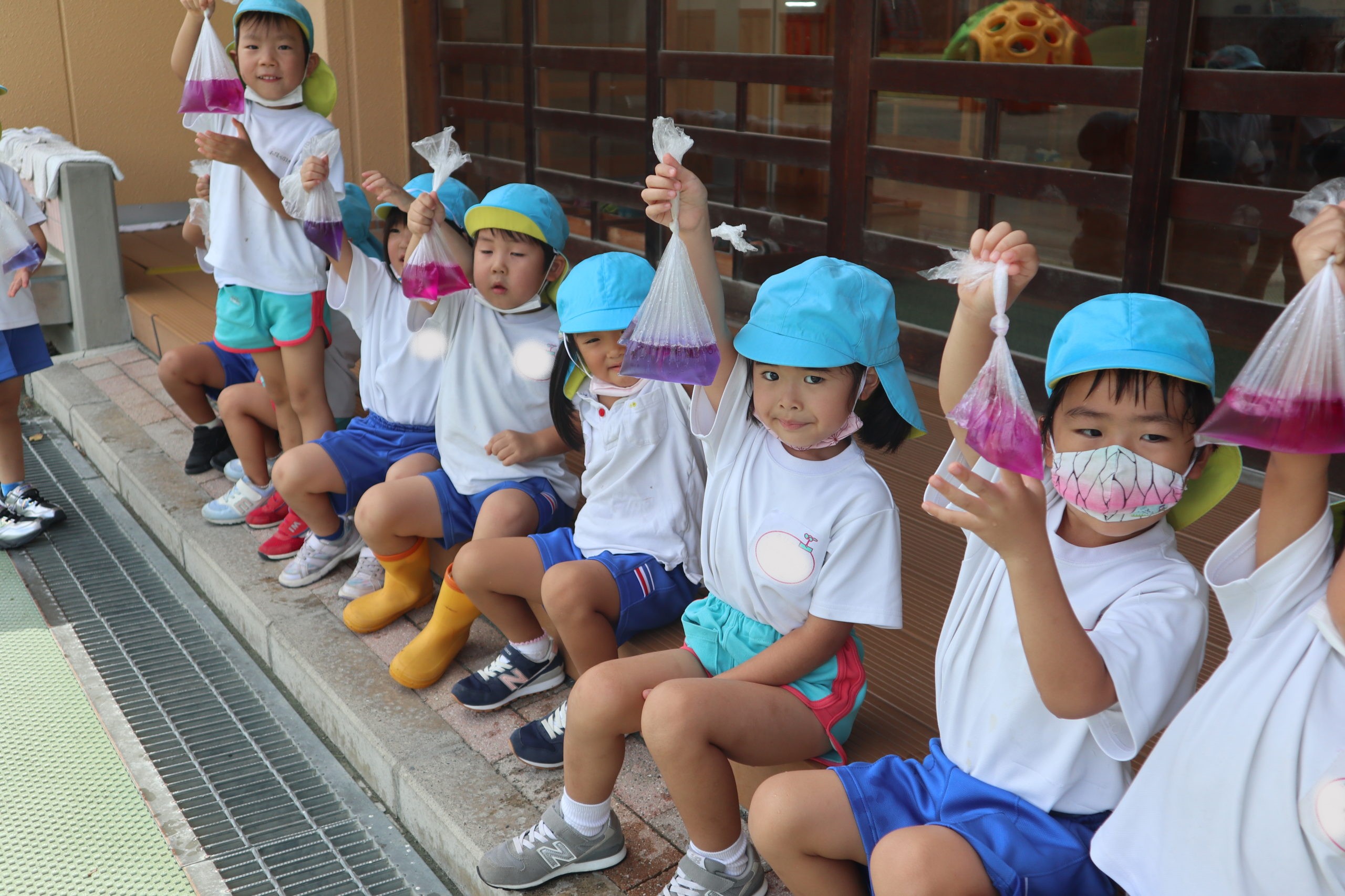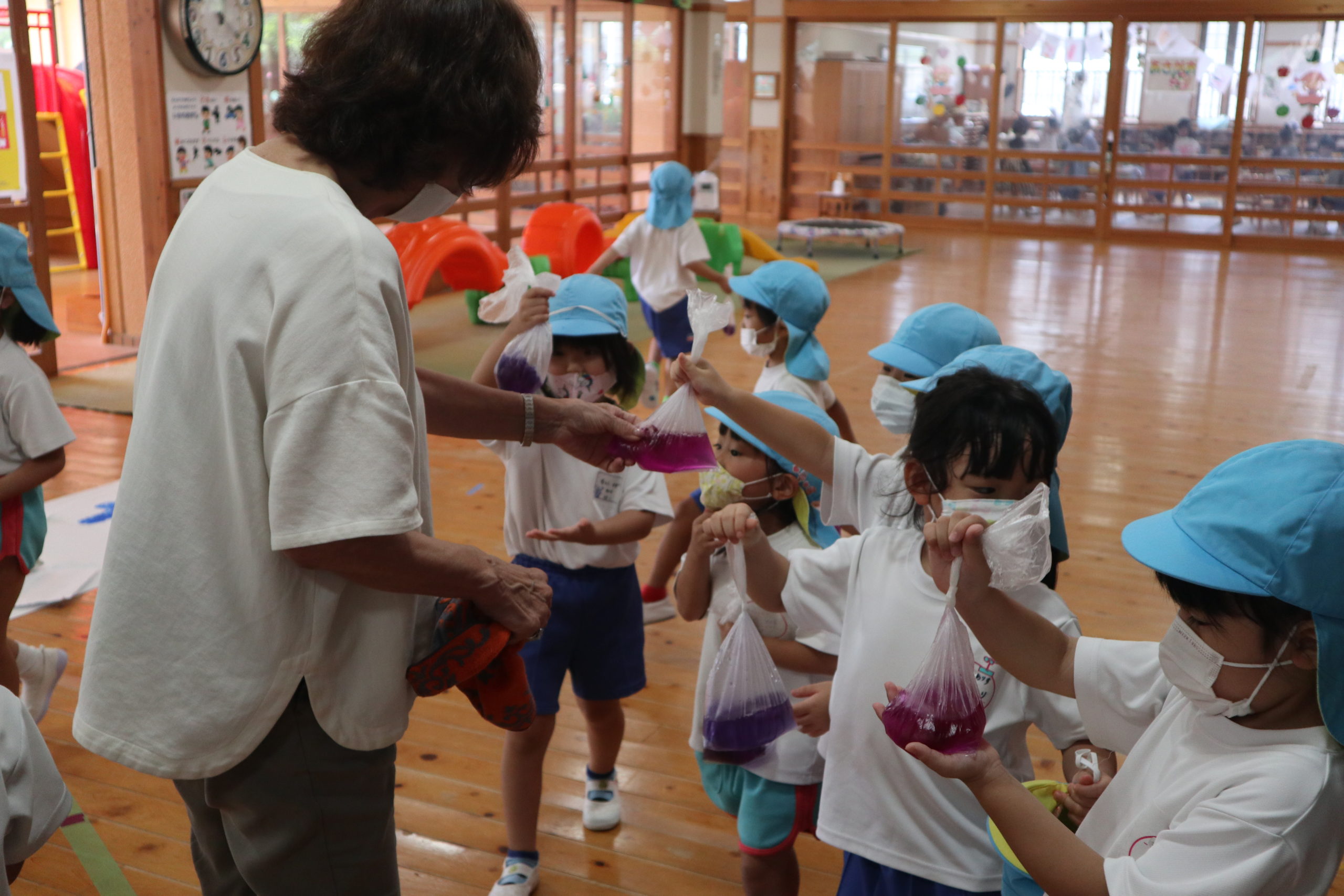 後日談ですが、きこちゃんは持ち帰った色水を「宝物入れ」に大切にしまっているそうです。(日にちが経つと腐ってしまいますのでお家の方で処分して下さいね。)