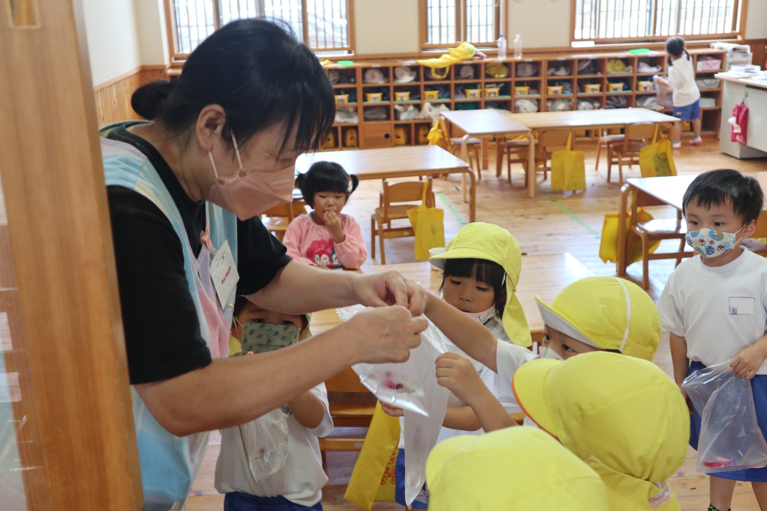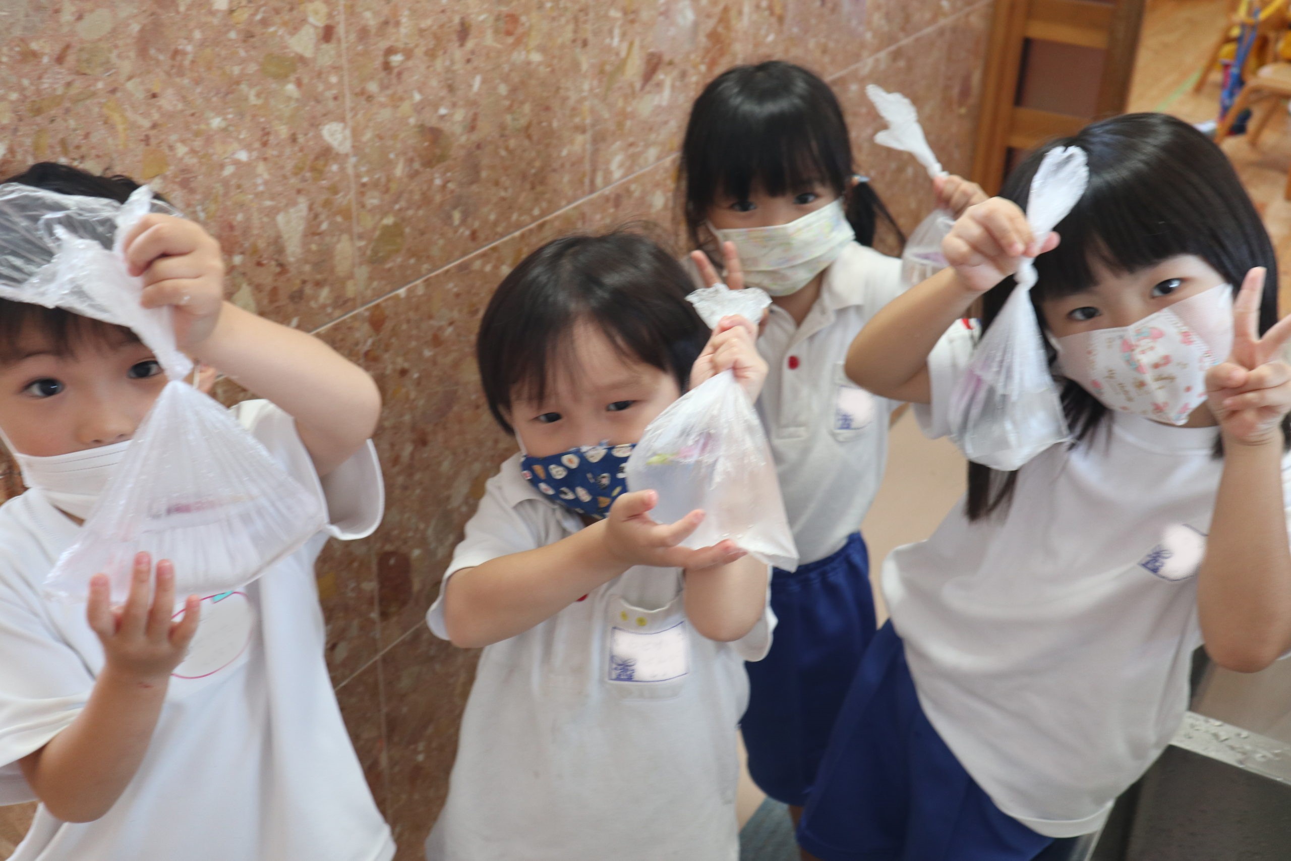 その後、年中さんに刺激された年少さんもビニール袋を握りしめ、あさがおの花壇に走っていき初めての色水作りに挑戦しました。
