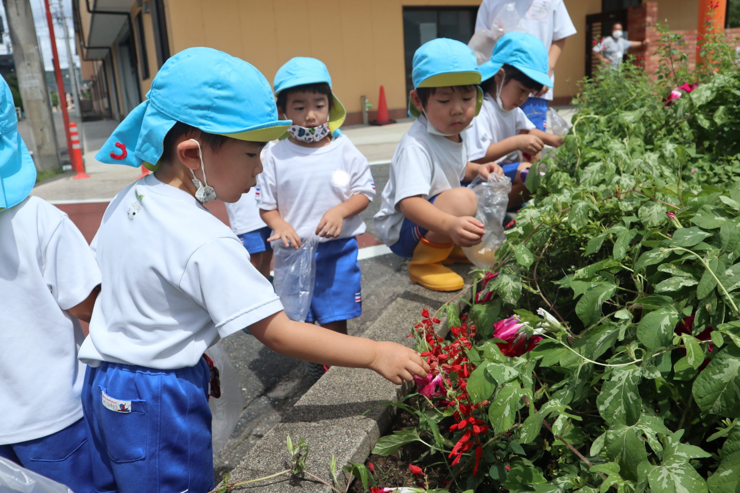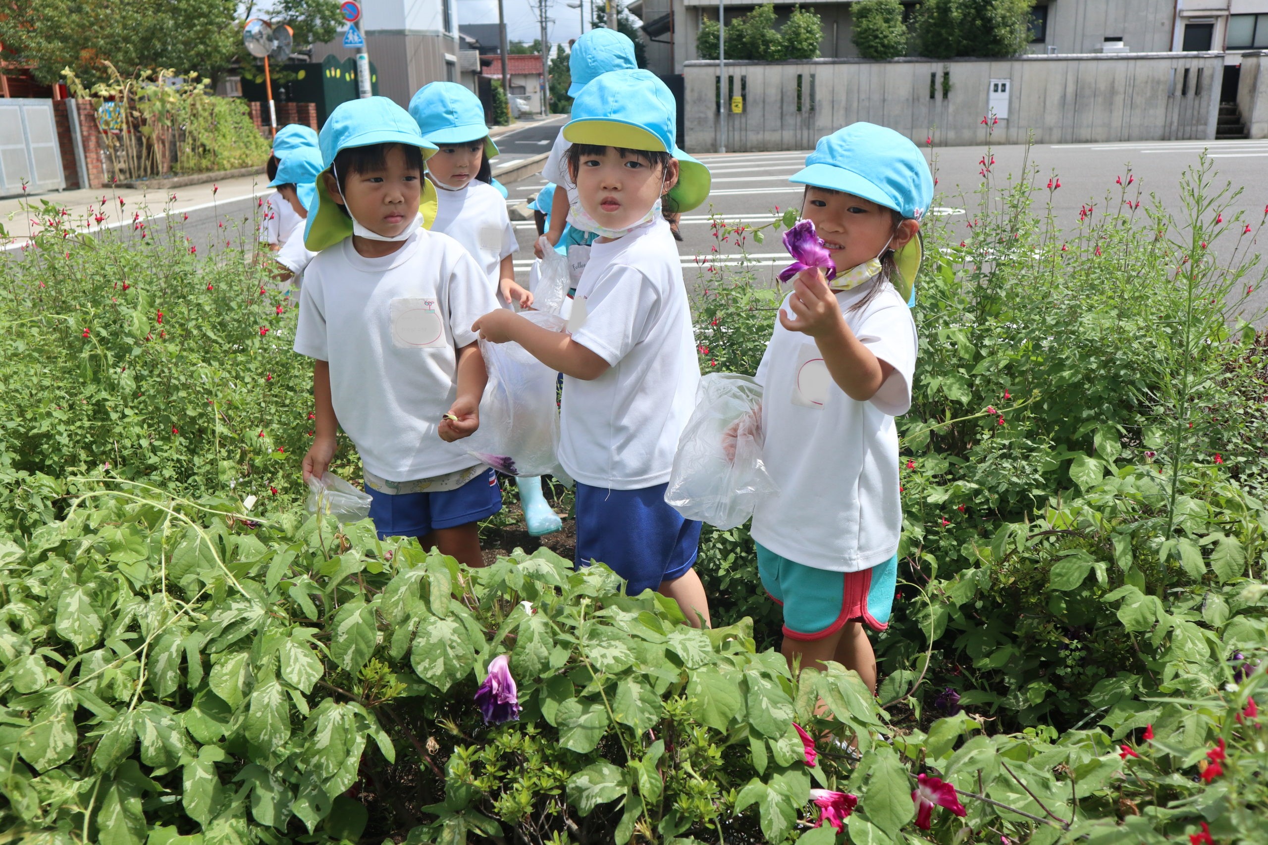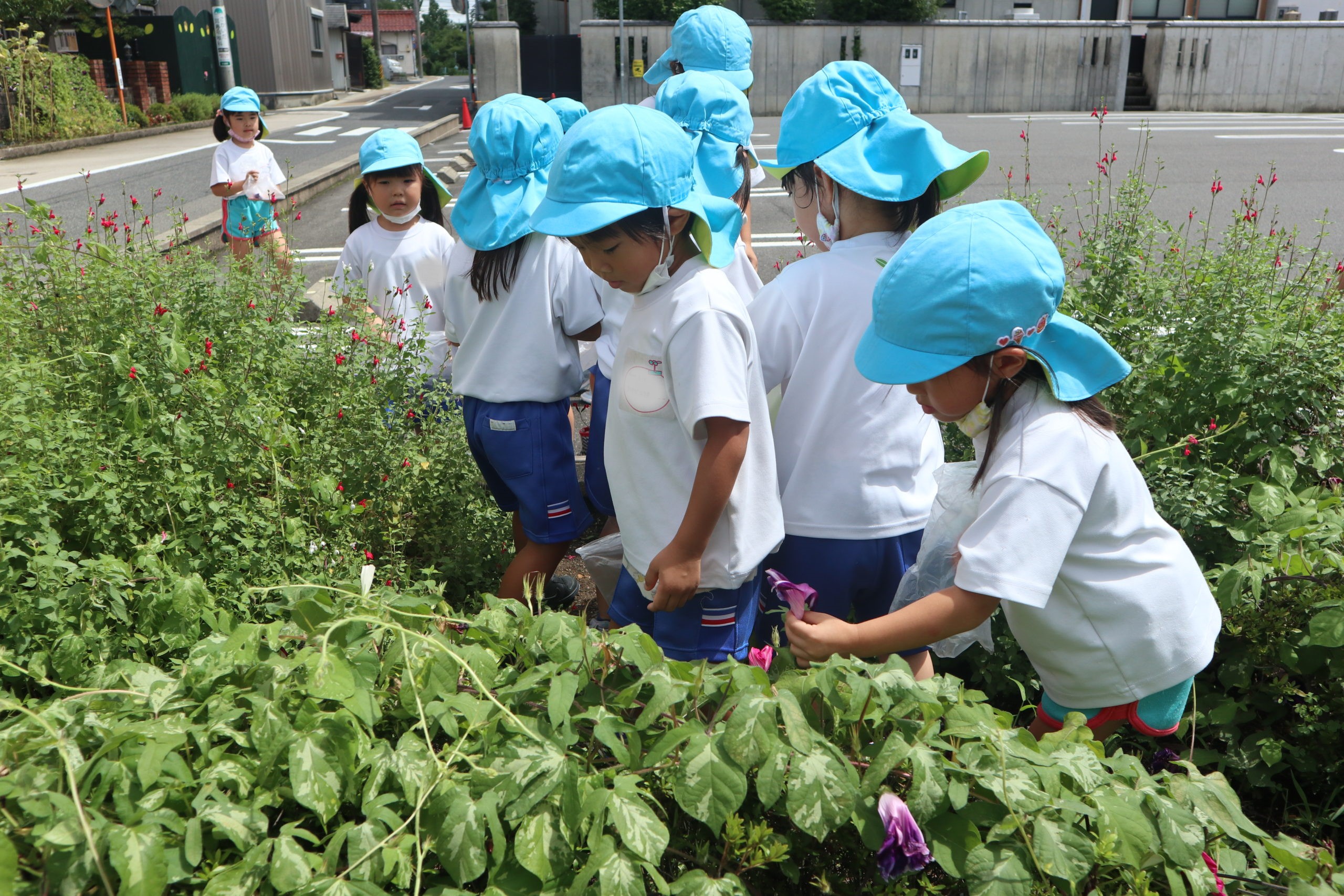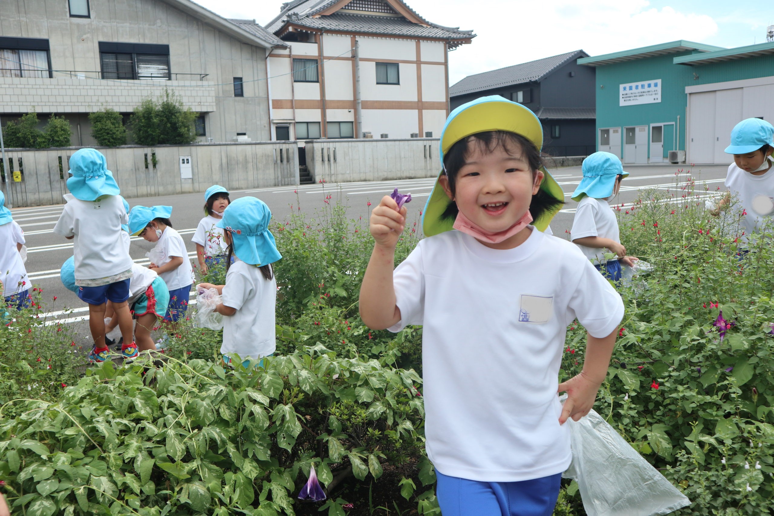 「そうだね。咲いているお花じゃなくて少ししぼんでいるお花をとるといいんじゃない?」と伝えると、子どもたちは咲き終えたあさがおを見つけ、持っていたビニール袋に入れとてもうれしそう。