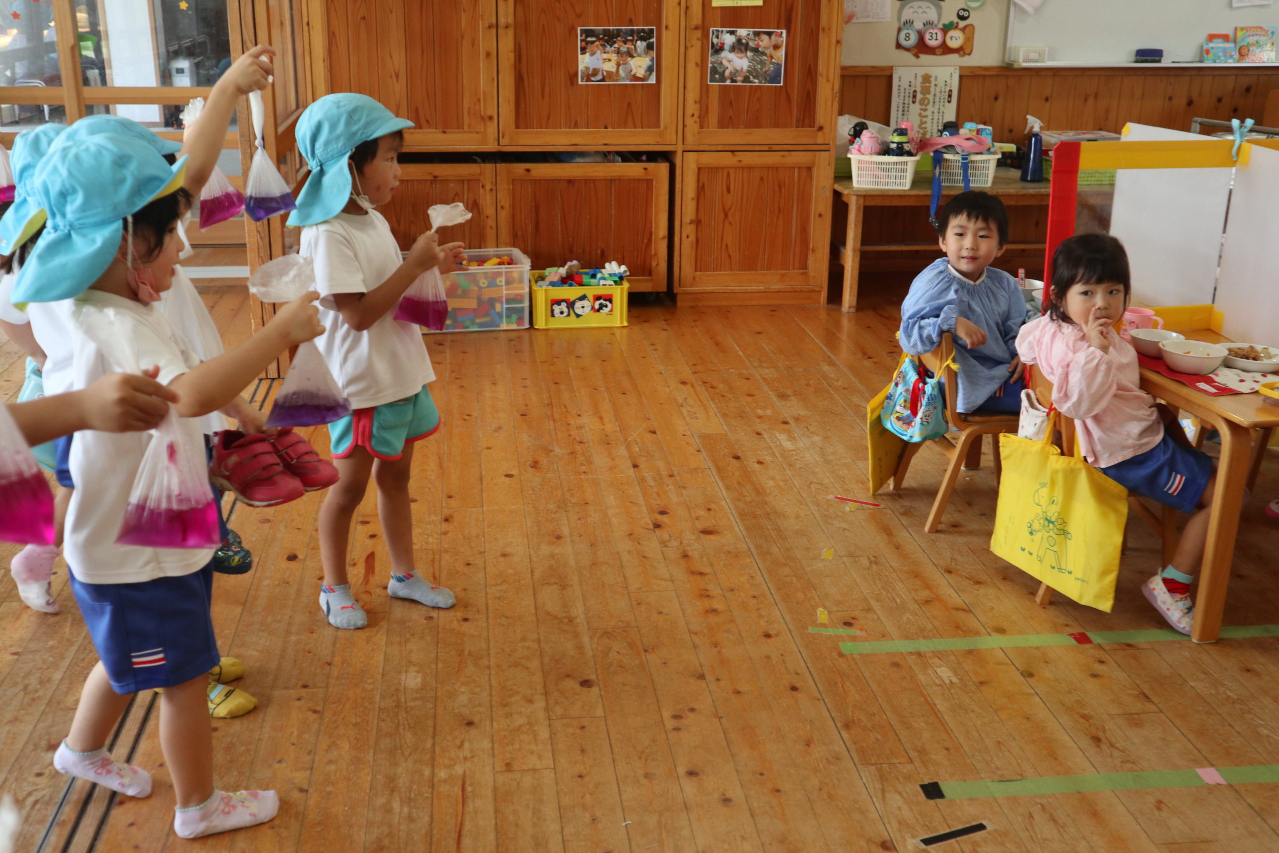 すると今度は誰かに自慢したくなったようで、年少さんのクラスに行き、「色水作ったよ~」「きれいでしょう」と見せて回りました。
