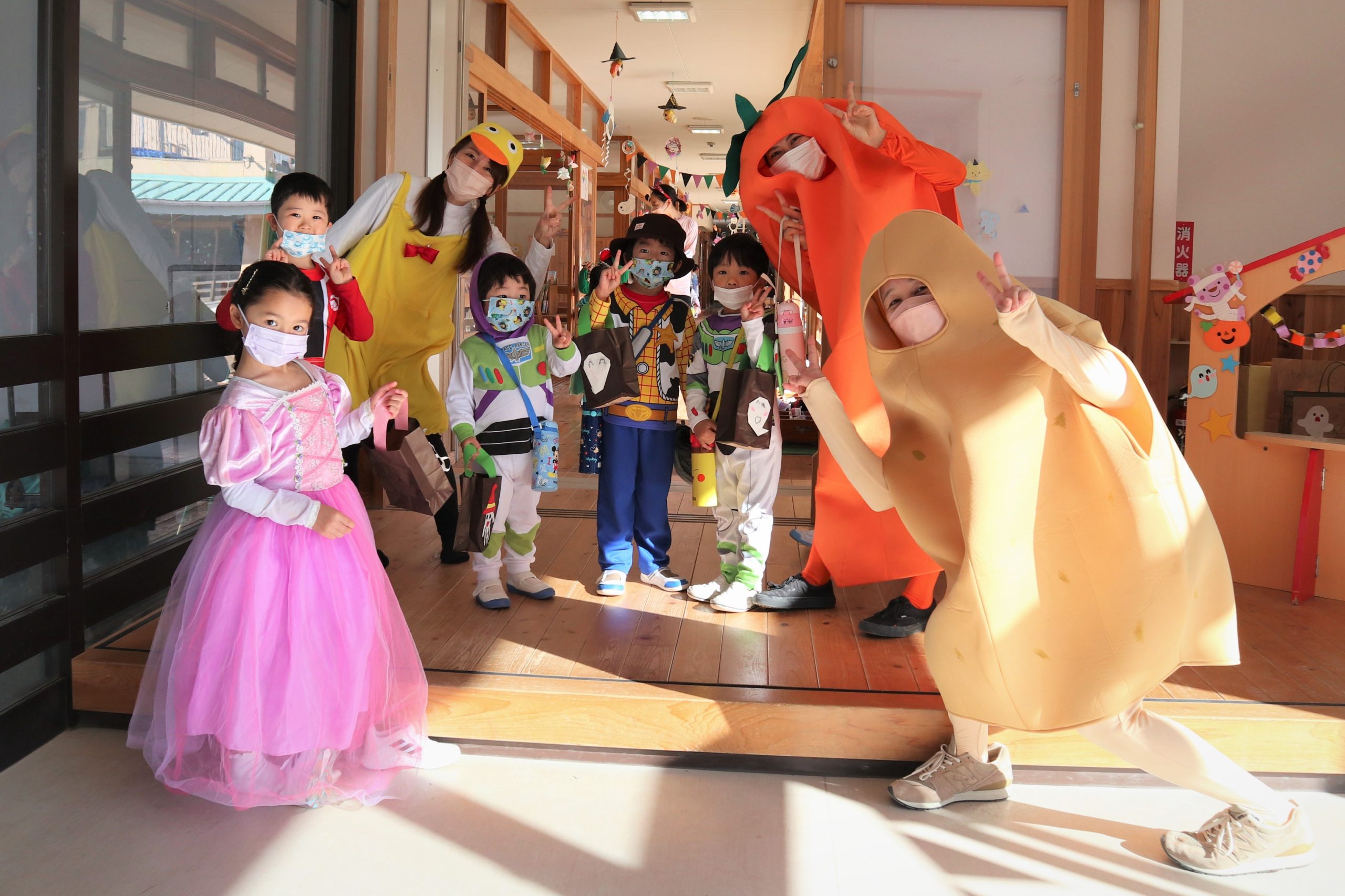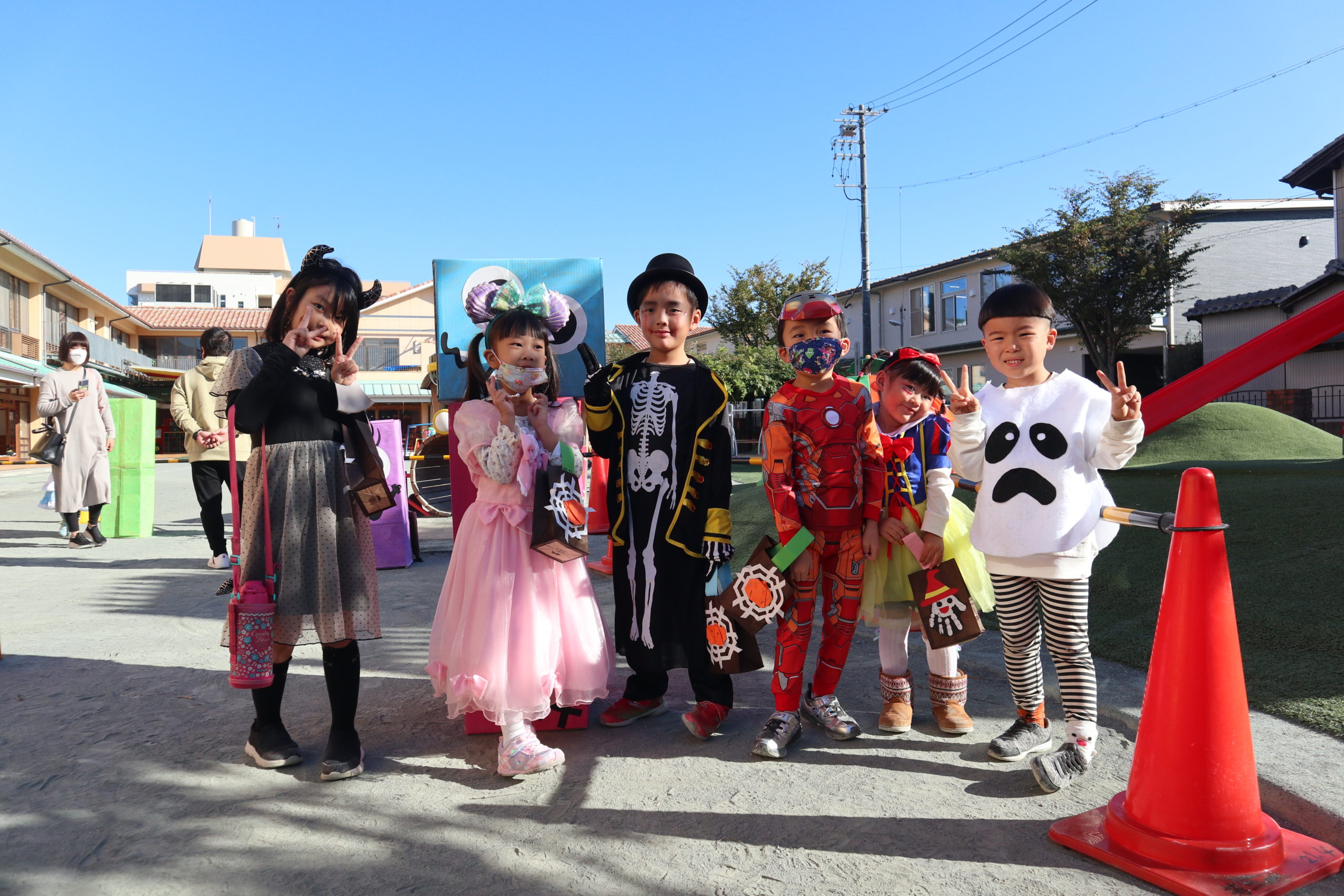 いろいろなキャラクターに扮したこどもたちもにっこにこで気分上々です😊ジャックオーランタンもおばけのモニュメントも幼稚園のハロウィンを彩っています。