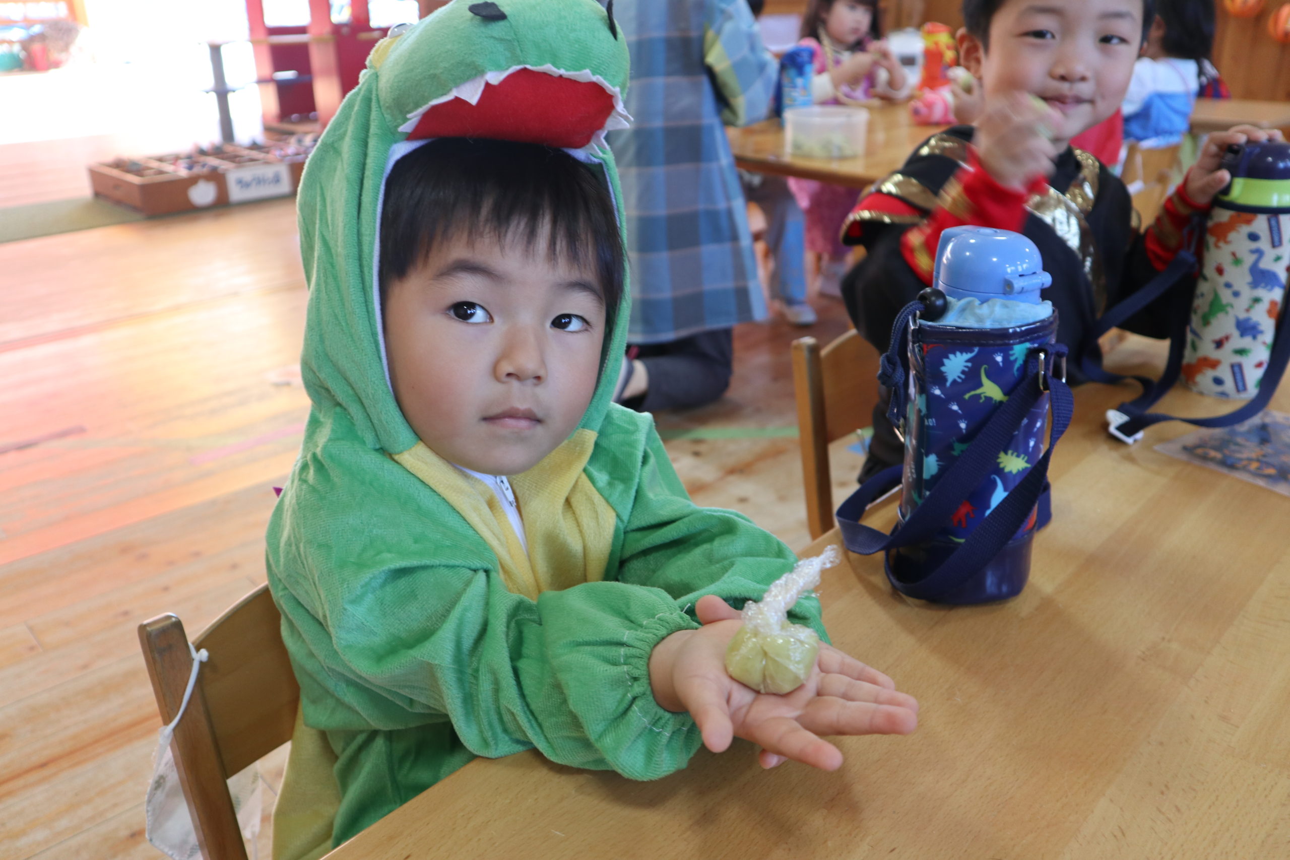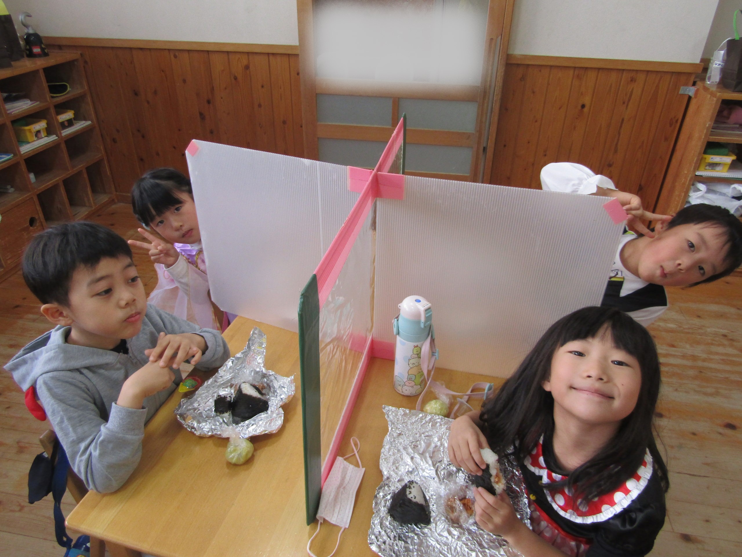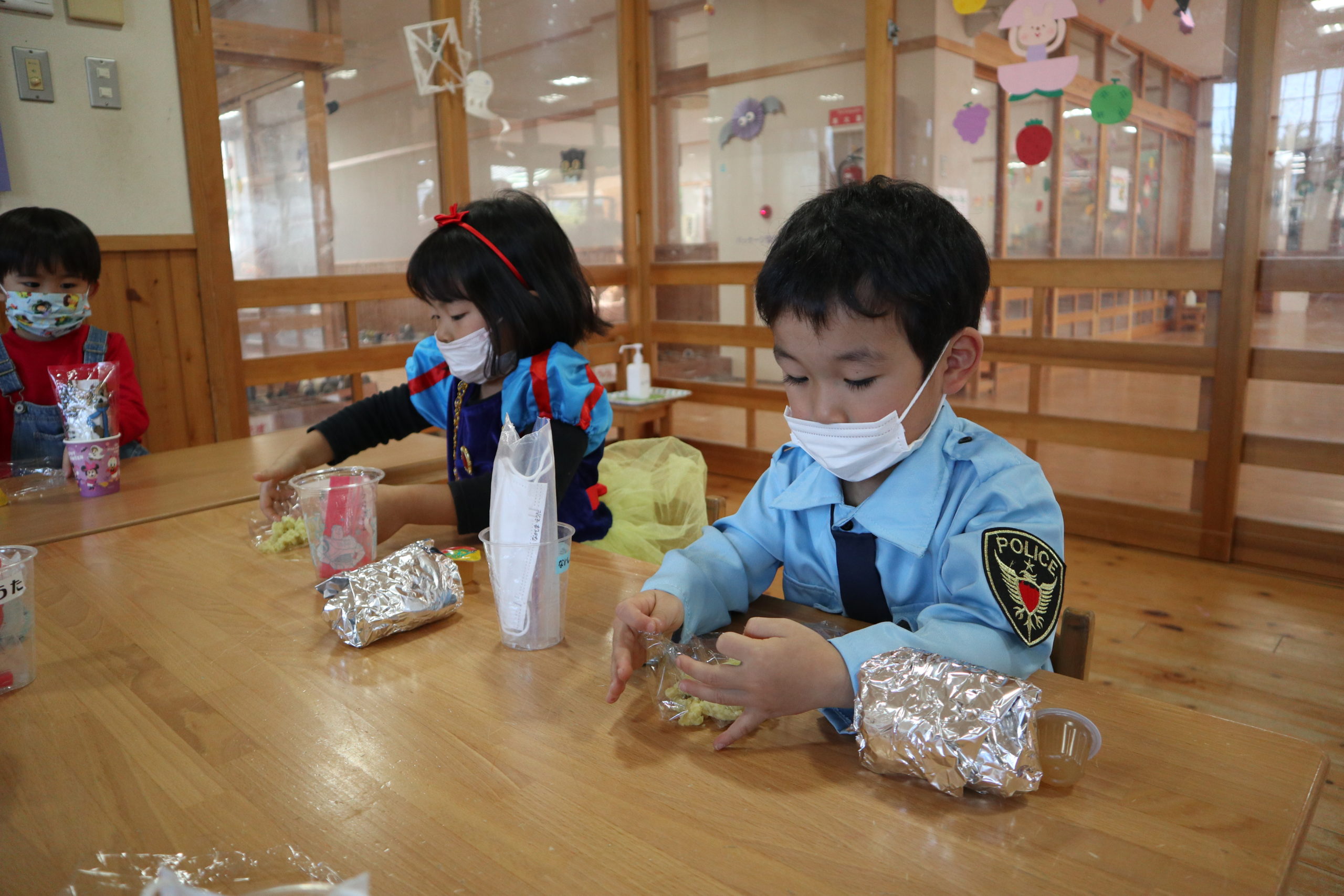 おにぎりとからあげとスイートポテトの茶巾包み。いつものお給食の風景とはずいぶん違うね。