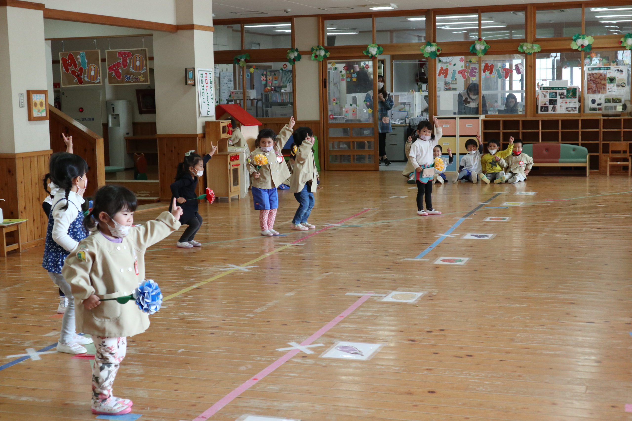 ゆり組の女の子たちが1階フロアでダンスをしています。教務課からちえこ先生も手を胸にじっと見守っています。お客さんの男の子たちも一緒に手をあげていますよ。