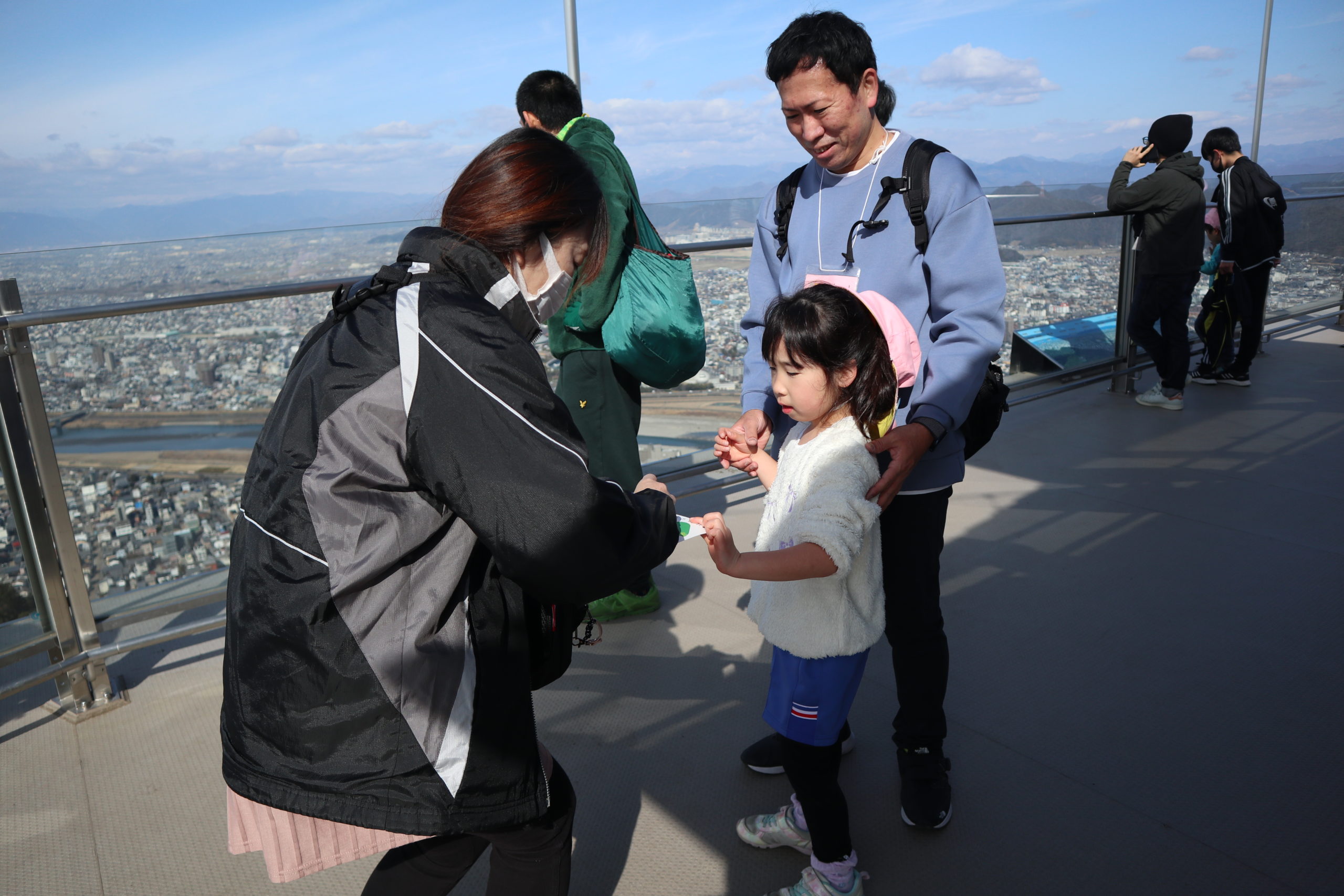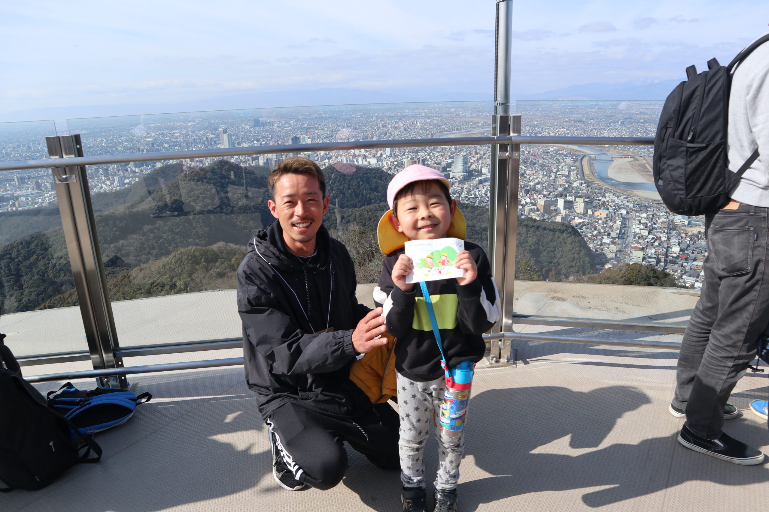 ついについに展望台到着。ちえこ先生に頂上のスタンプを押してもらったよ。