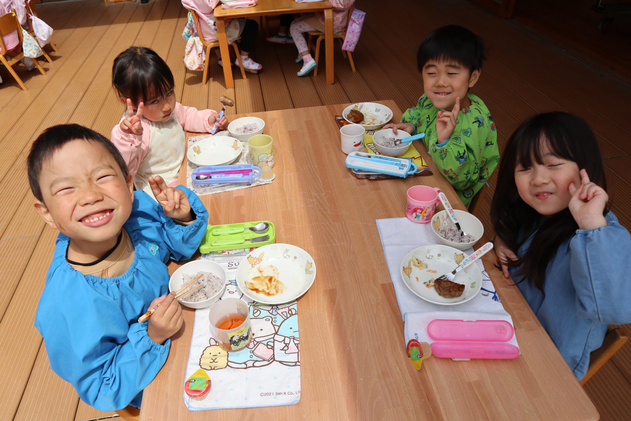 「ここのテーブルの男の子たち。たくさん食べられるね。」「うん!だって年長だもん。幼稚園で一番大きいもんね!」