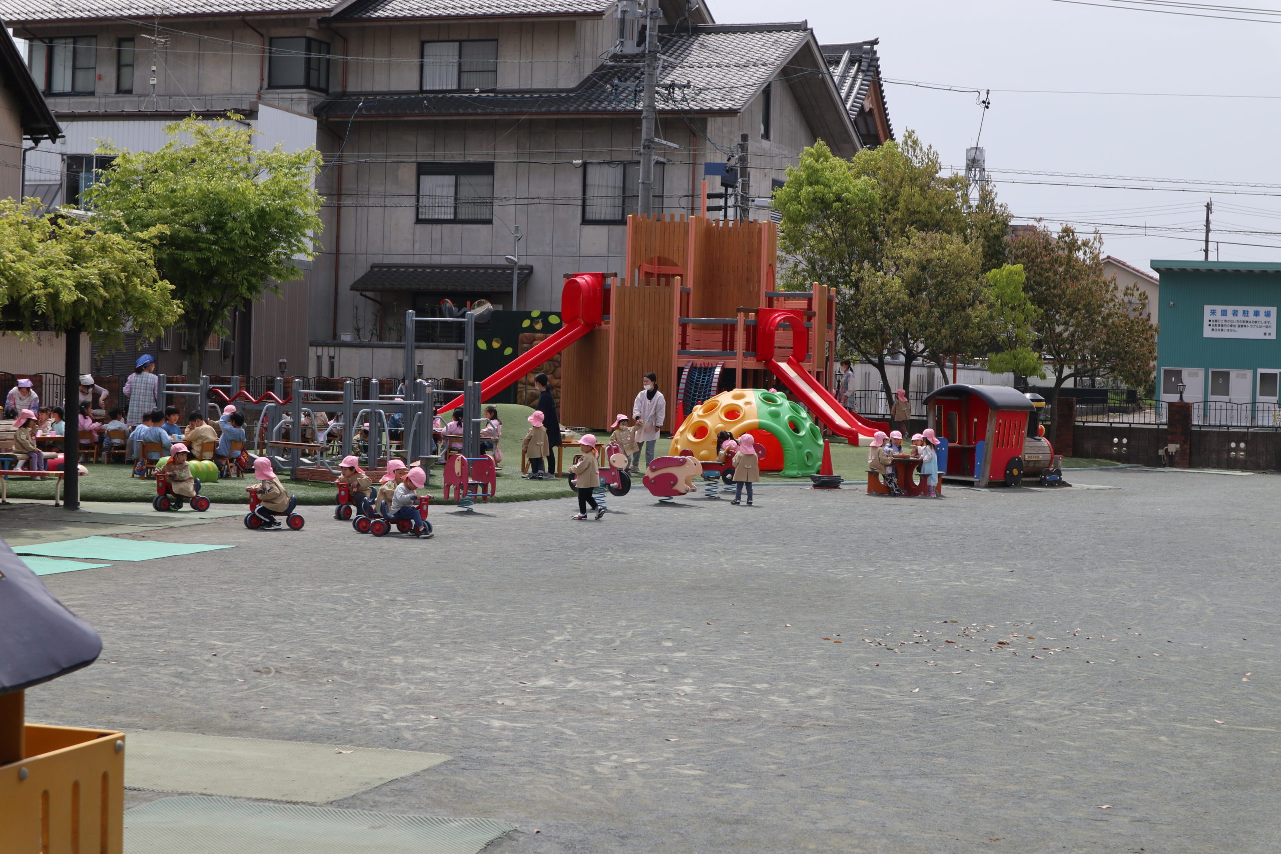 4月18日 芝生がいつもの雰囲気と違うね。外遊びをしていた年少さんも興味津々。